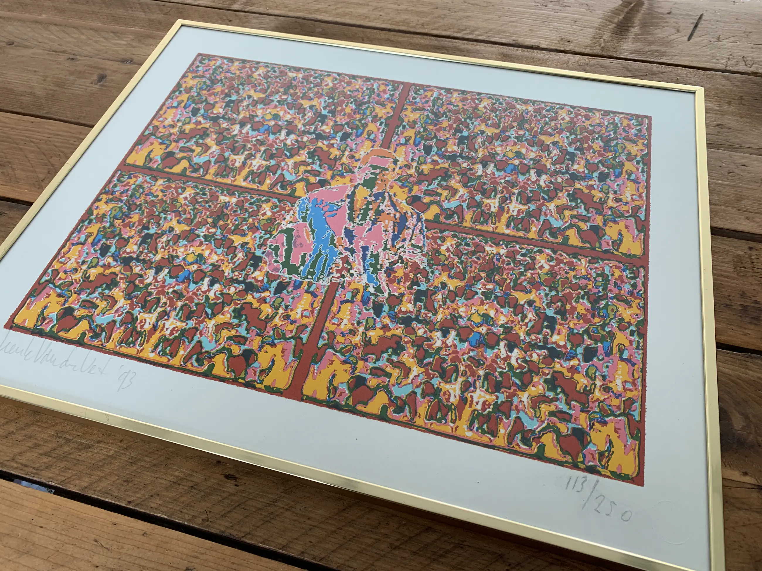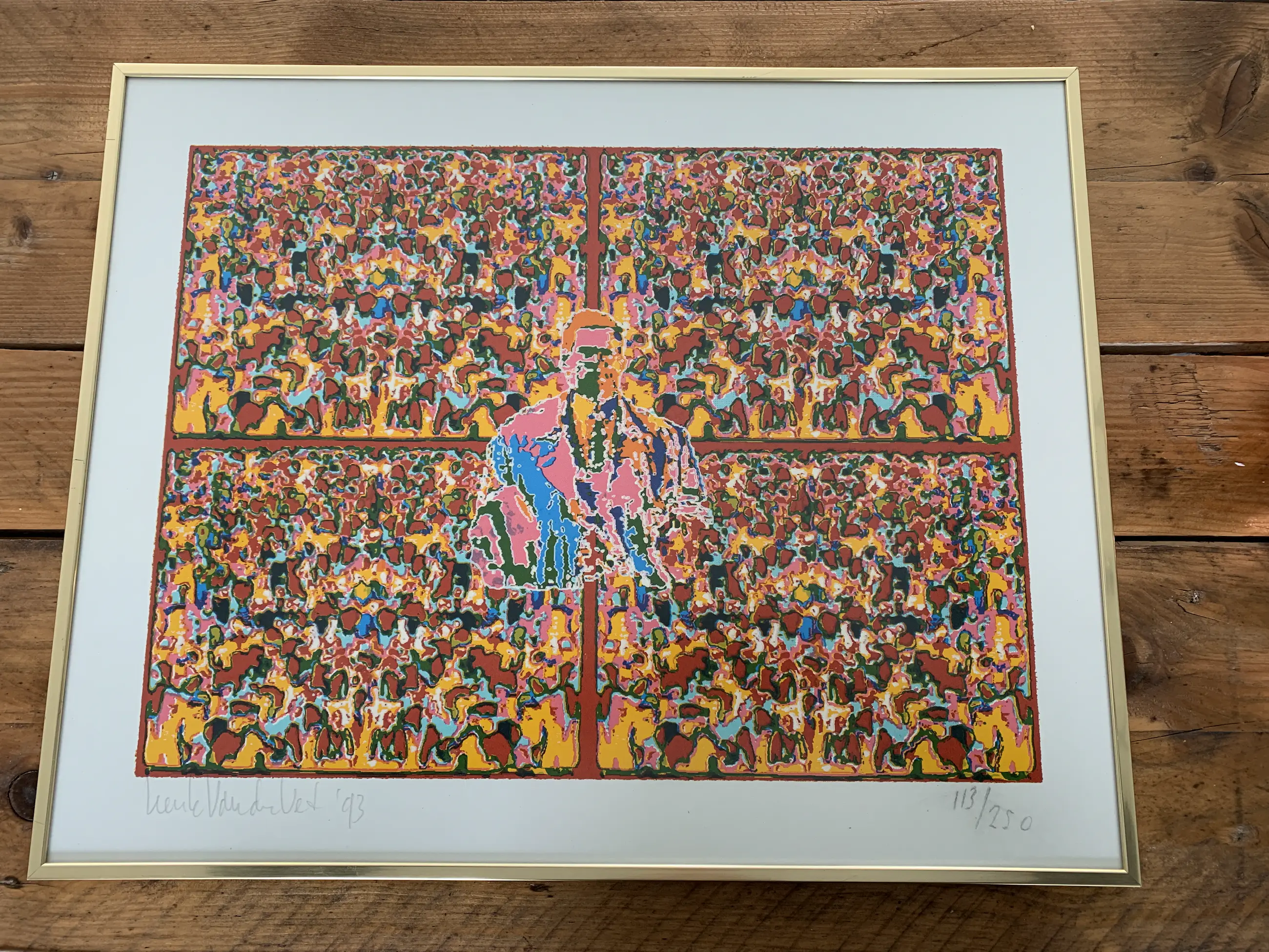 Man centraal gepositioneerd in dit kleurrijke warme kunst object. Typisch Henk van der Vet. Editie 113/250.