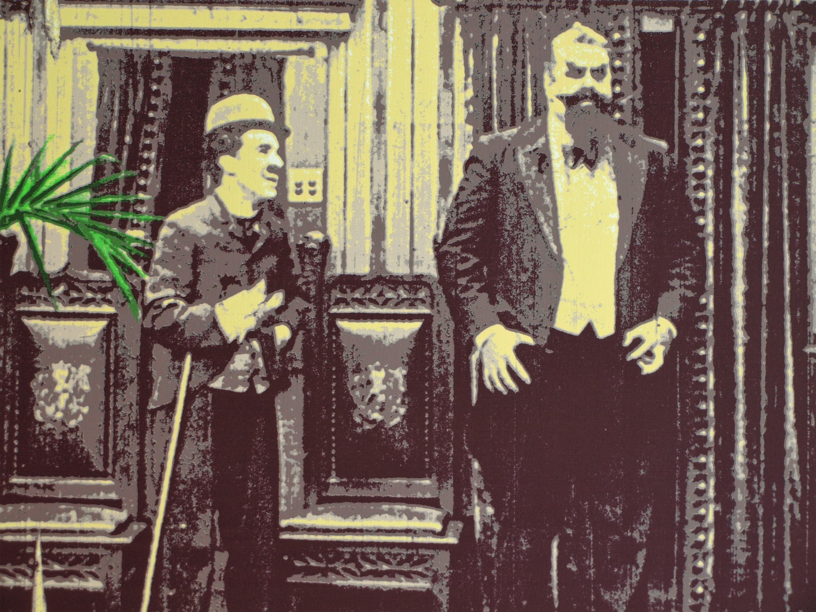 Een zeefdruk uit 1988 van de Nederlandse kunstenaar Henk van der Vet (1939-2016), nr 1 (I) uit zijn serie “Charlie Chaplin” (1889-1977).