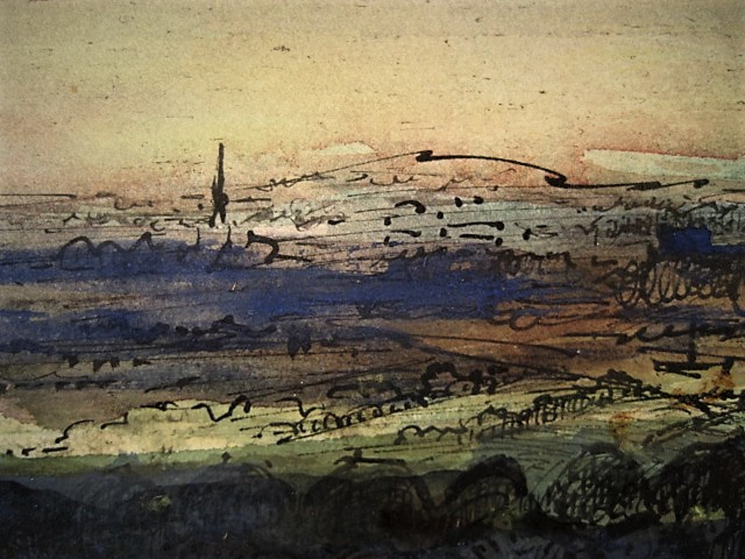 Bijzonder "panorama" Aquarel van de veelzijdige Brabantse (Megen) kunstenaar Hendrik "Henk"van Gisteren (1926-2013). Naast Aquarellist was hij ook Graficus, illustrator, pentekenaar en schilder.