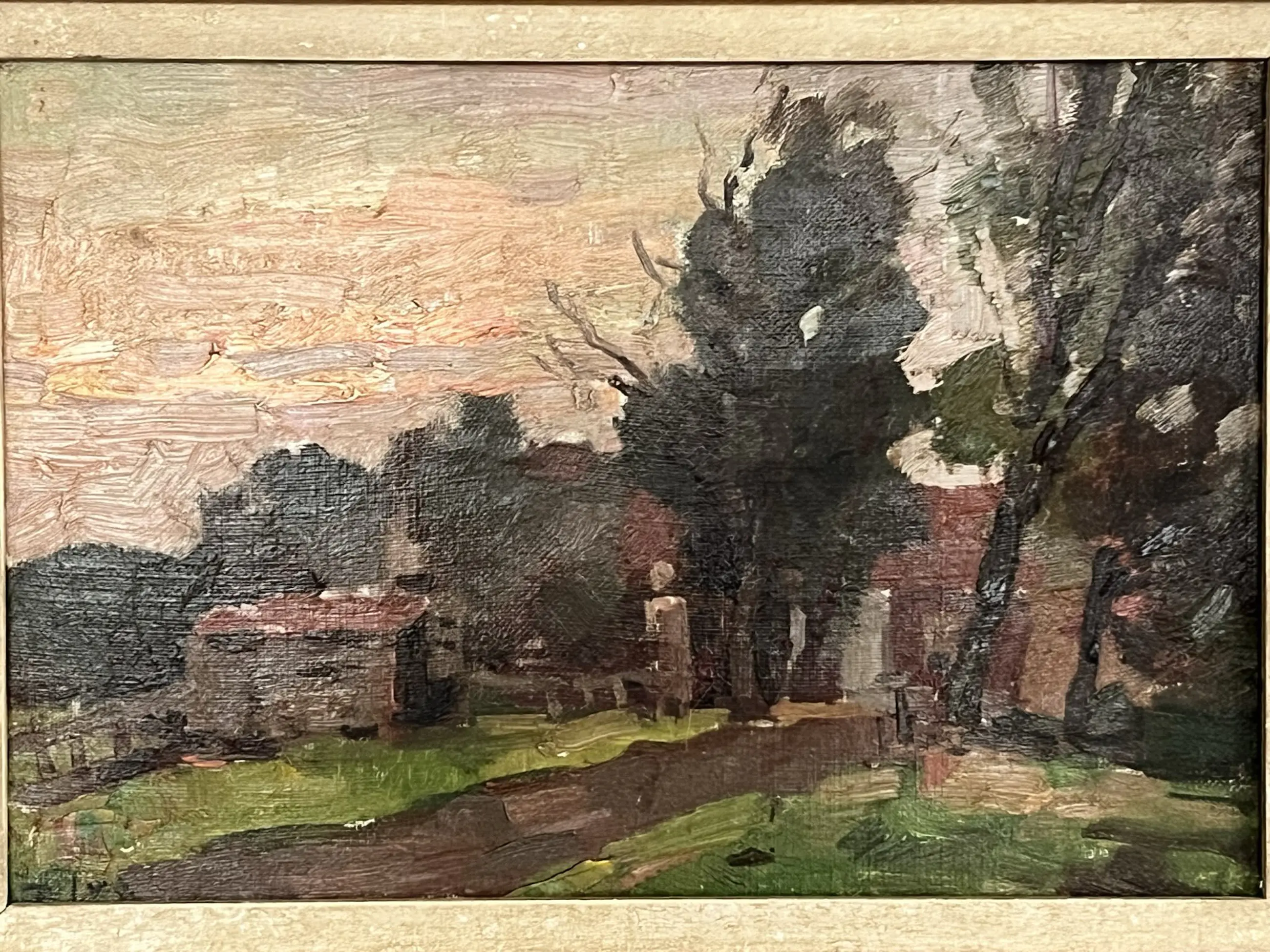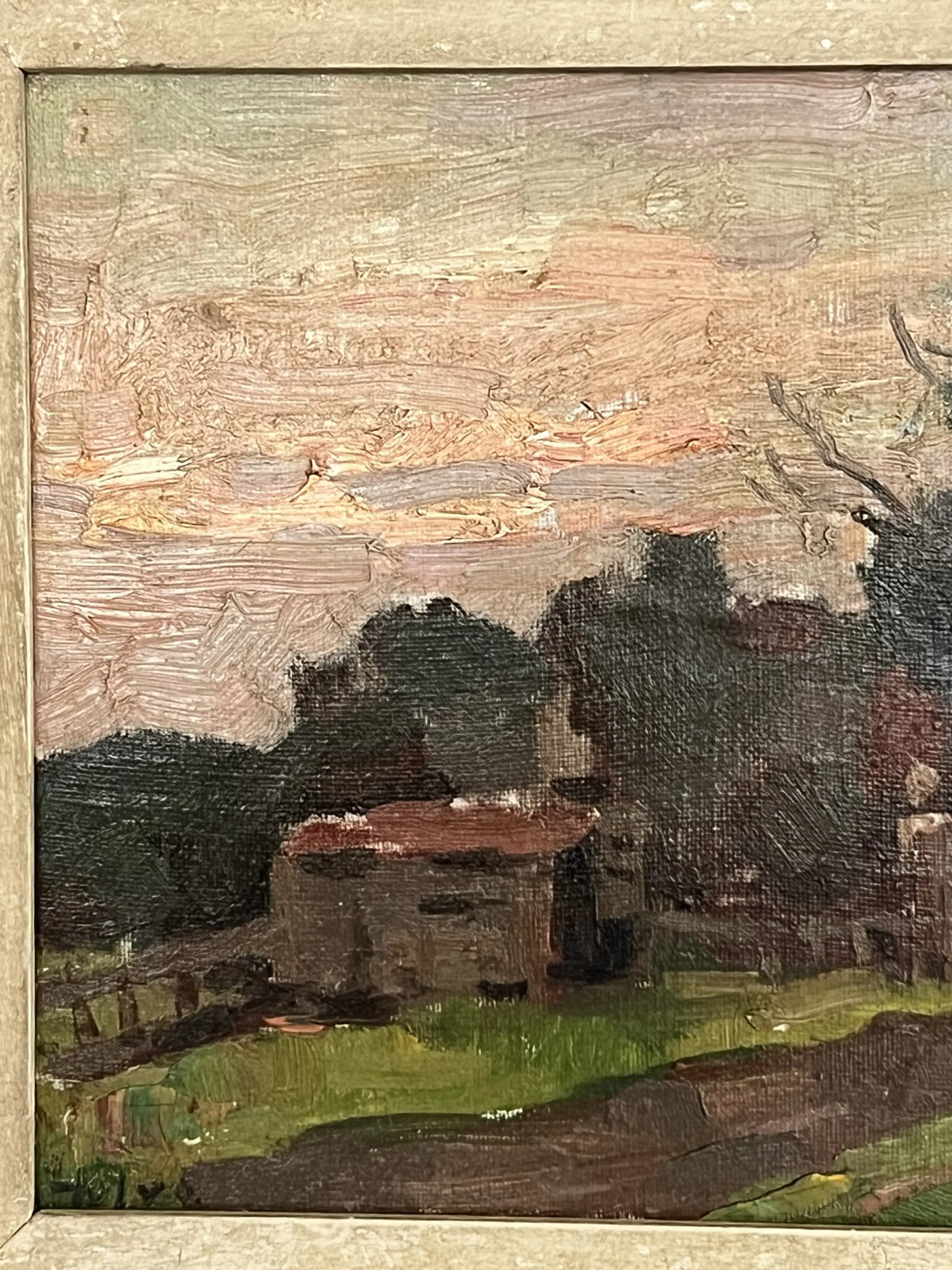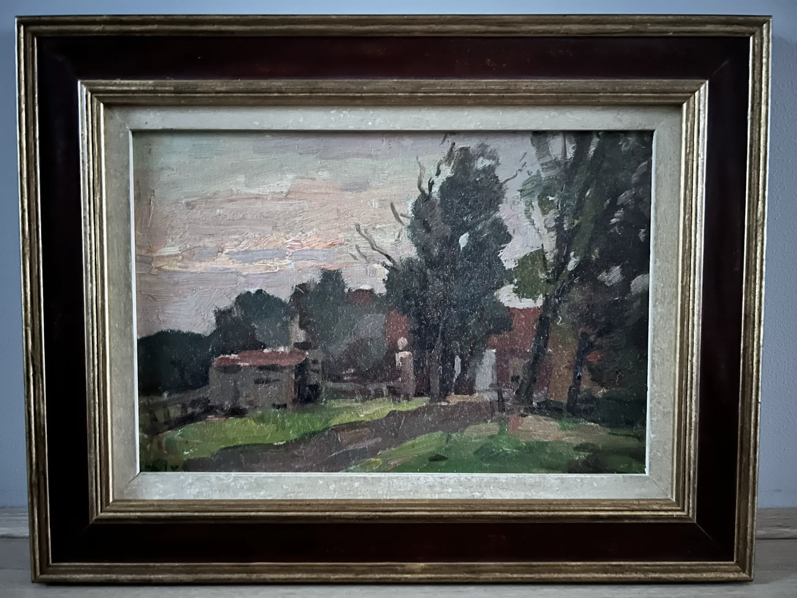 Dit werk is pasteus opgezet, met grove streken. de prachtige lucht steekt gekleurd af tegen de donkere omgeving, maar het boerderijtje is duidelijk herkenbaar. Een prachtig Hollands beeld.