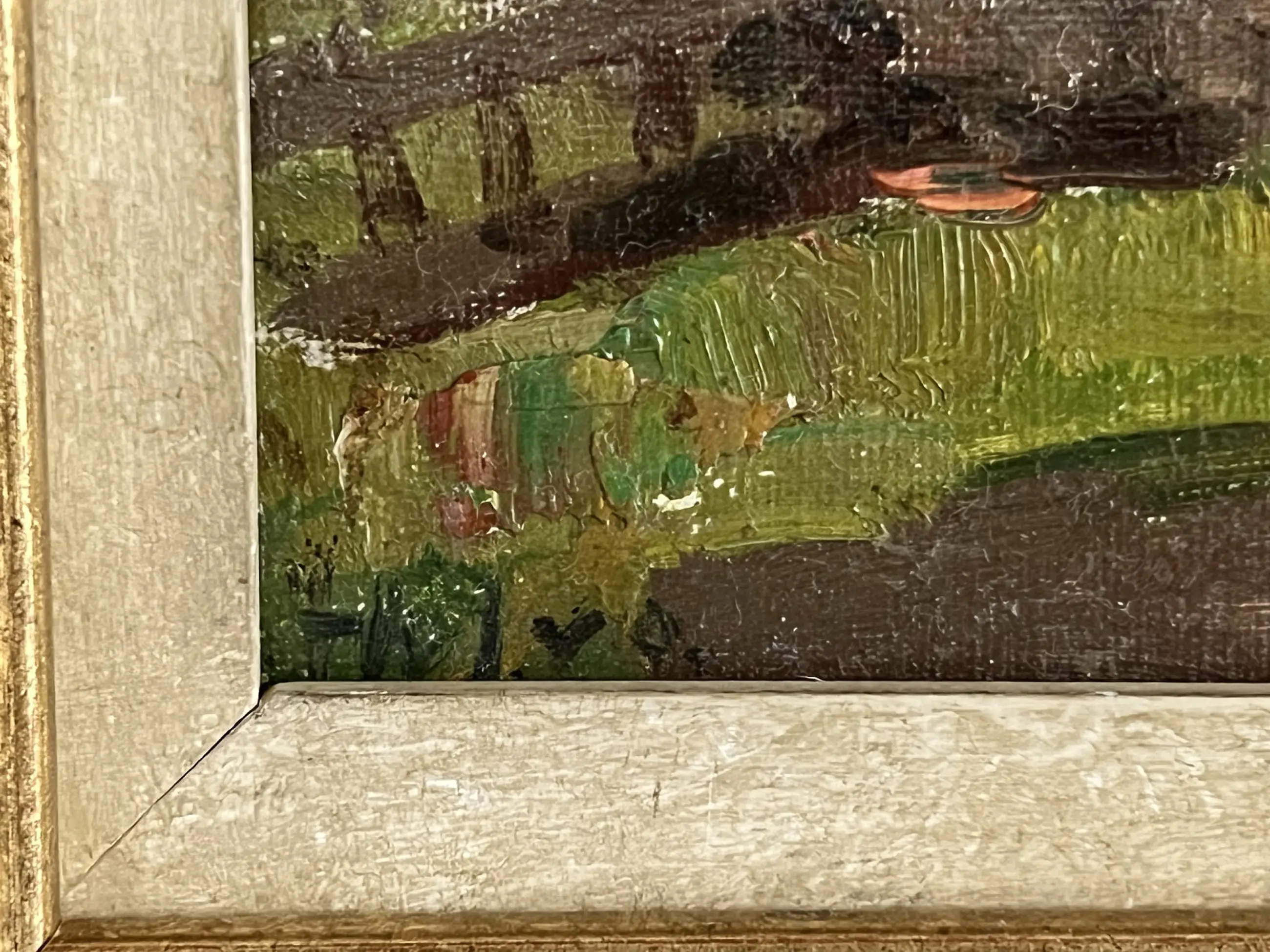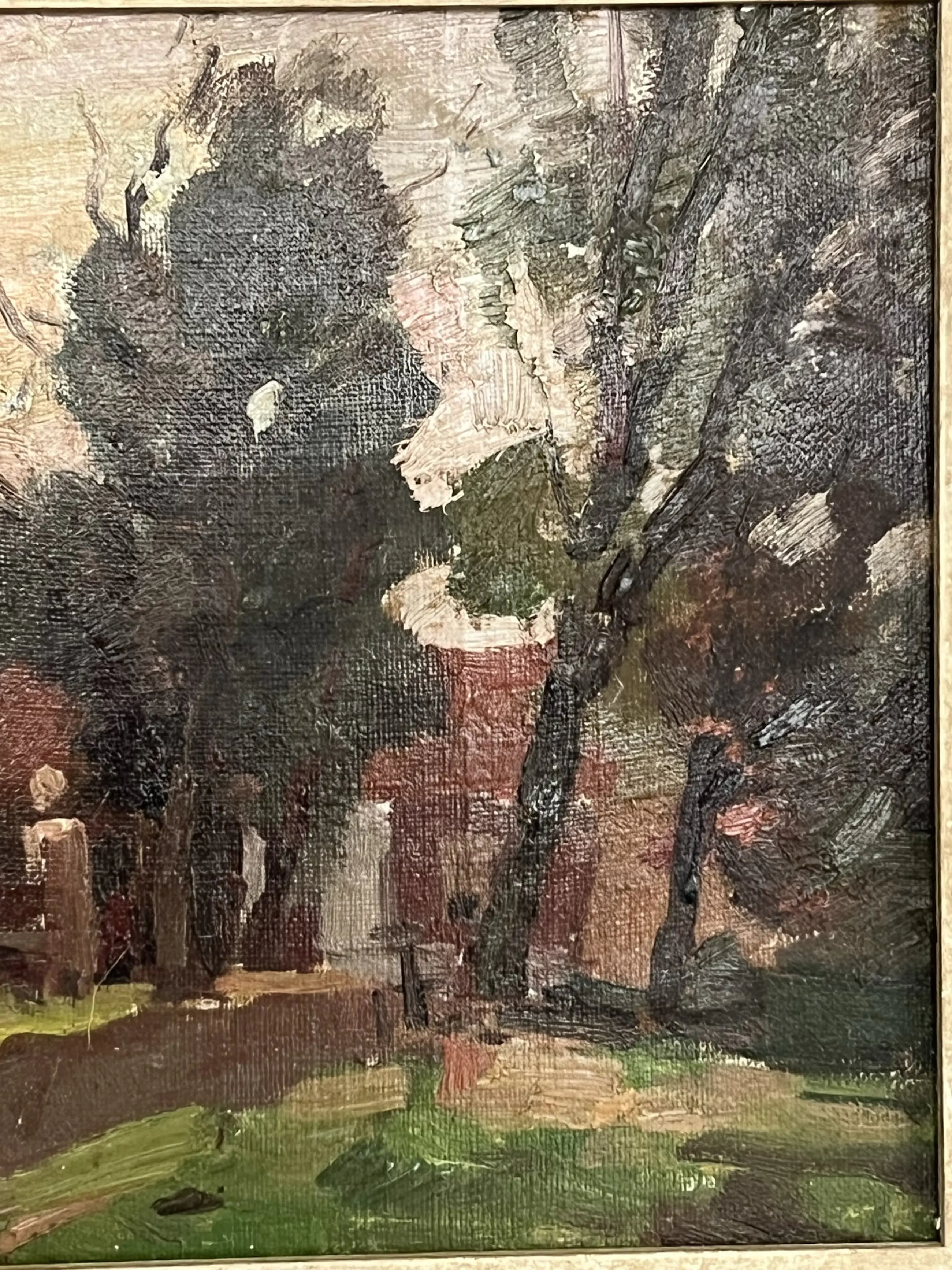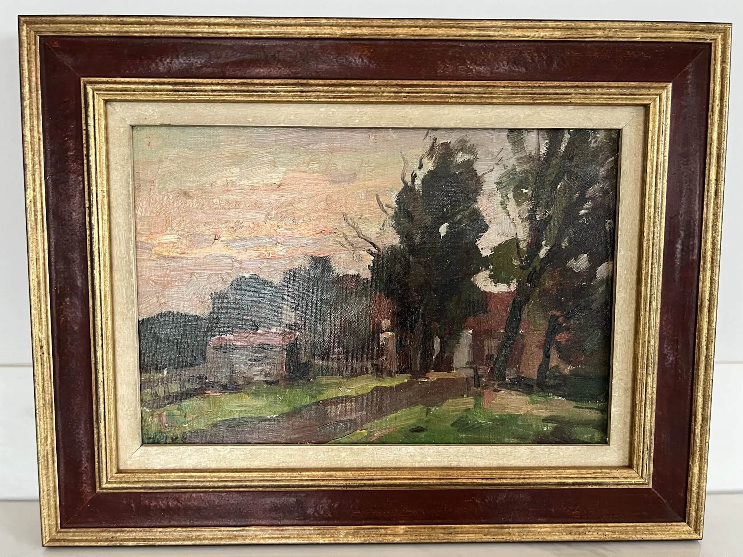 Dit werk is pasteus opgezet, met grove streken. de prachtige lucht steekt gekleurd af tegen de donkere omgeving, maar het boerderijtje is duidelijk herkenbaar. Een prachtig Hollands beeld.