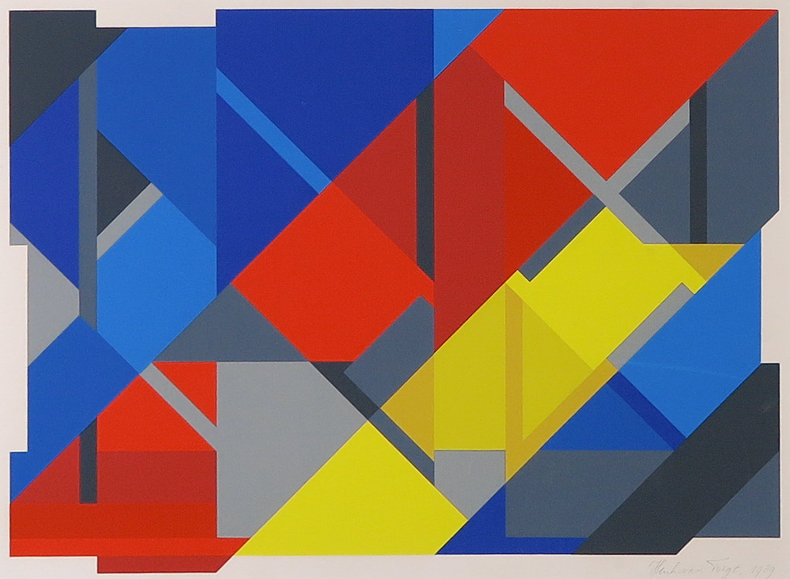 | De lijst heeft geen glasplaat en de passe-partout is wat vlekkerig. Er zitten een paar lichte krasjes en beschadigingen in de verflaag van de zeefdruk. | |||||||||||