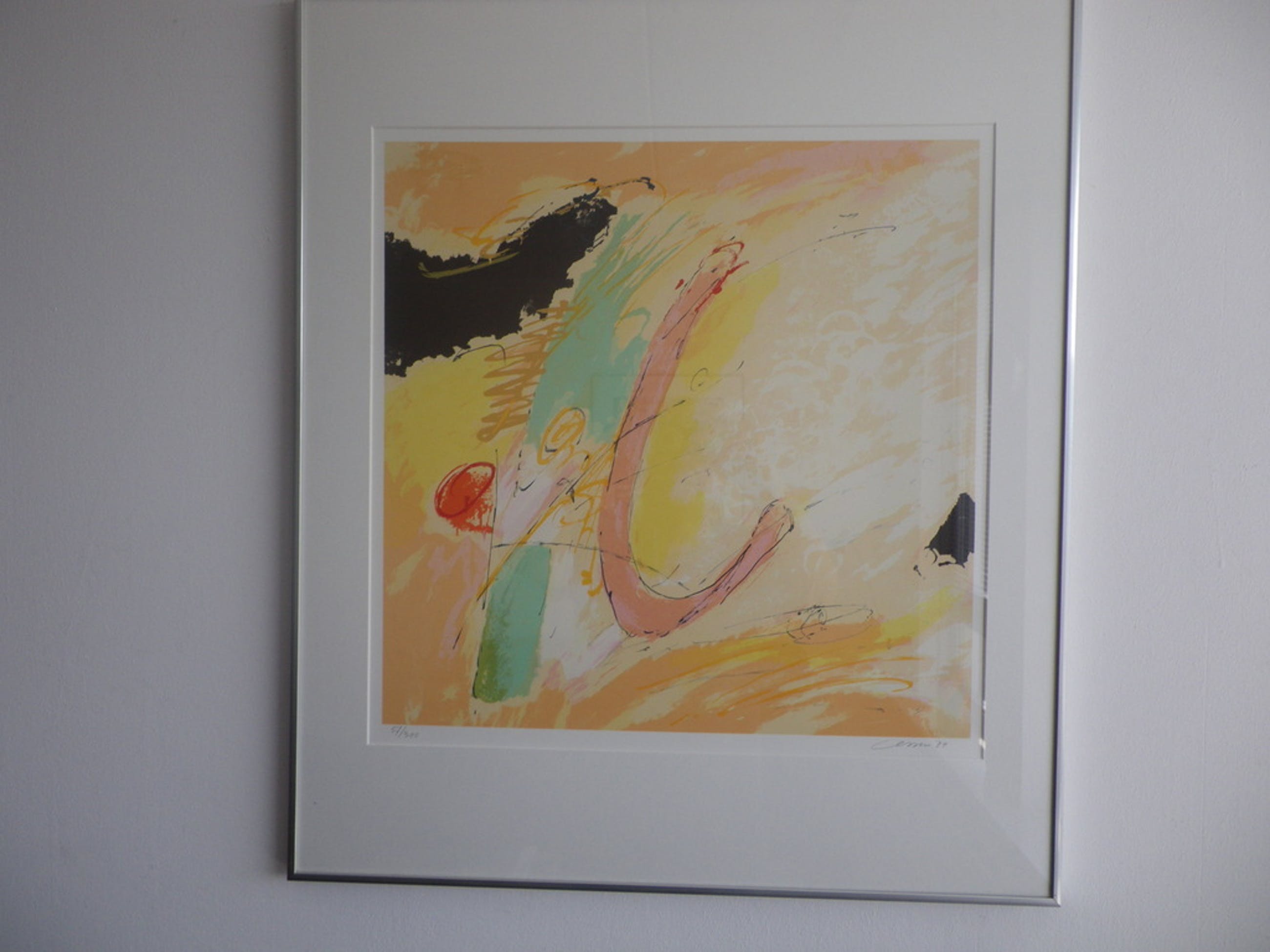 prachtige abstrachte zeefdruk uit 1989 , ingelijst 60x70 cm, genummerd en gesigneerd.