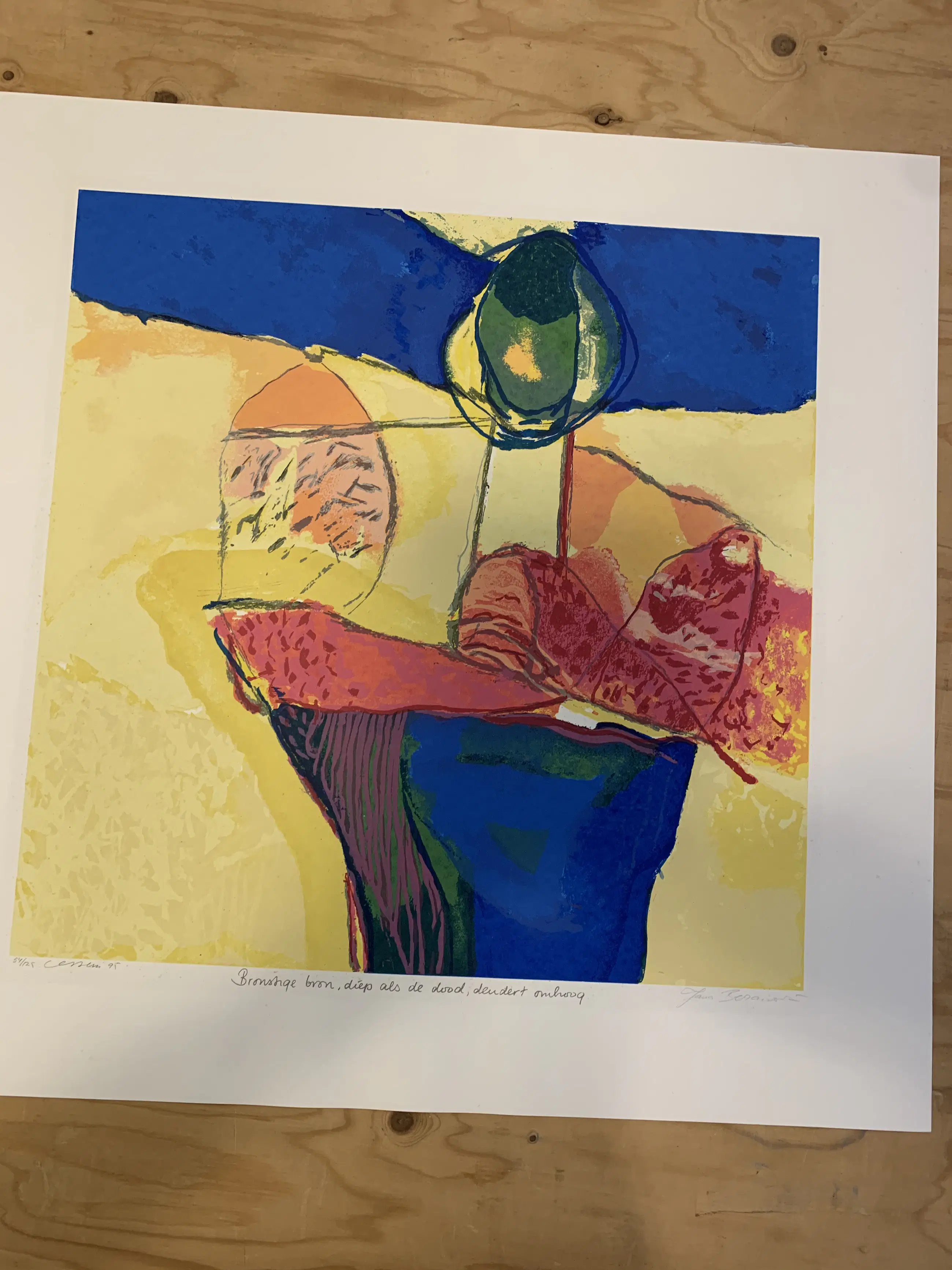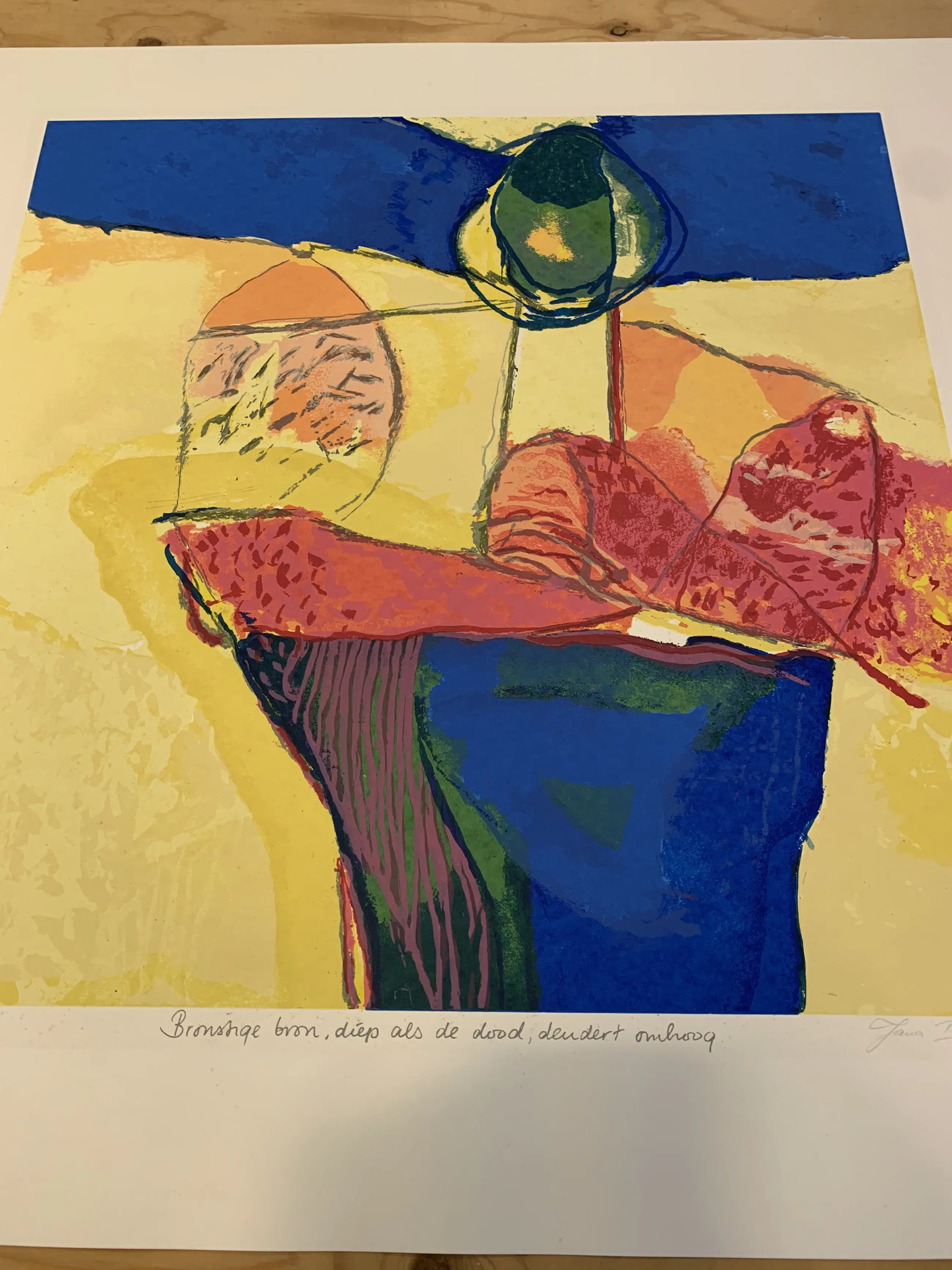 Henk van Vessem en Jana Beranová Titel: Bronstige bron, diep als de dood, dendert omhoog Jaar: 1995 Oplage: 54/125 Techniek: Zeefdruk