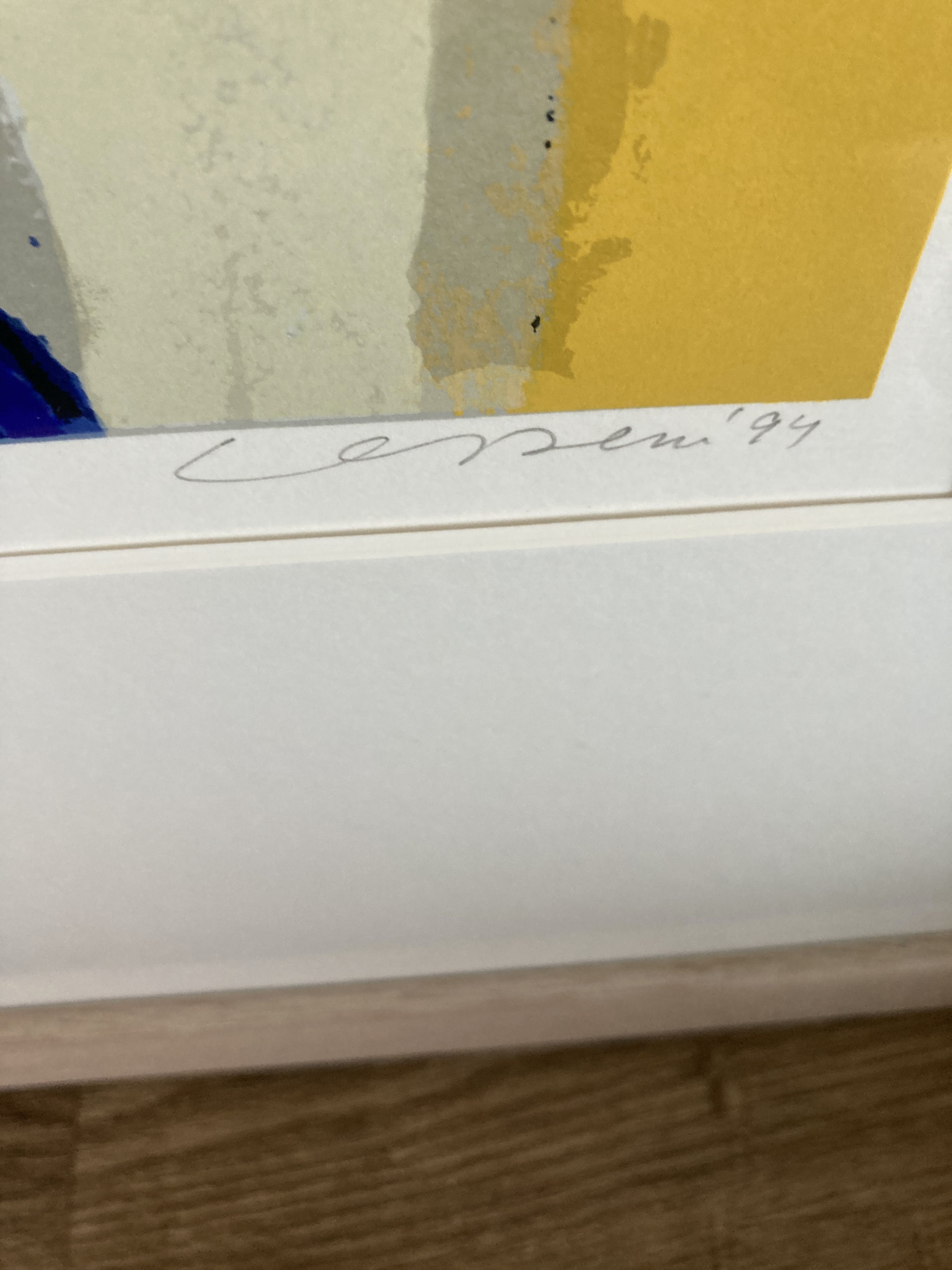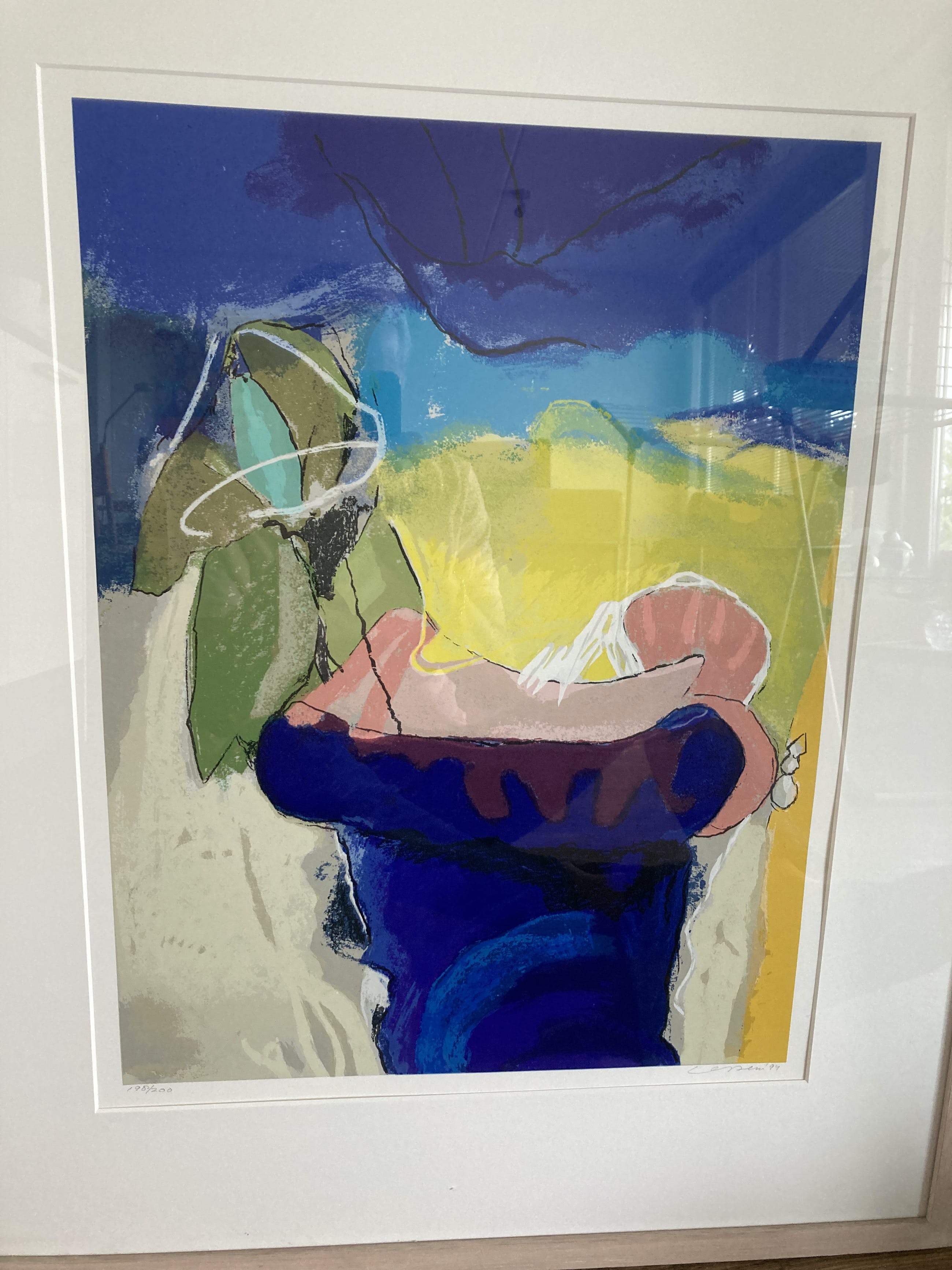 Fraaie en grote zeefdruk in een blank houten lijst ( 2,5 cm hoog en 2,0 cm breed ). Met l.o. 198/200 met potlood en r.o. Vessem ‘ 94 met potlood.