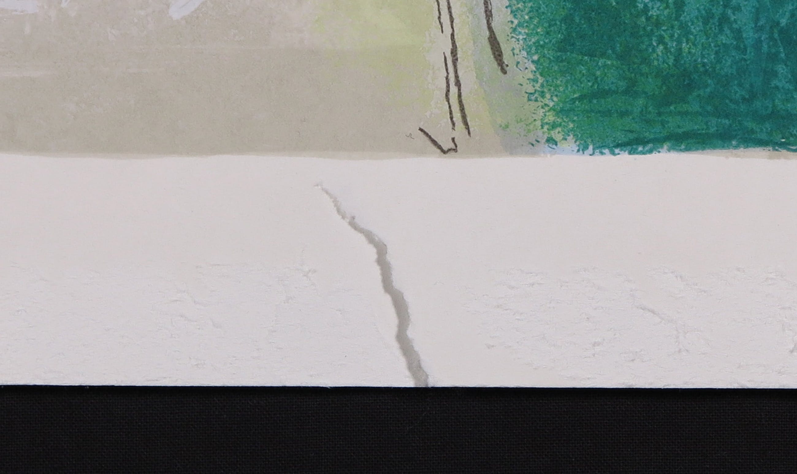 | Langs de rand links zitten enkele kreukjes. De onderste rand is tot aan het beeld ingescheurd. Op de witrand zit hier en daar een vlekje. | |||