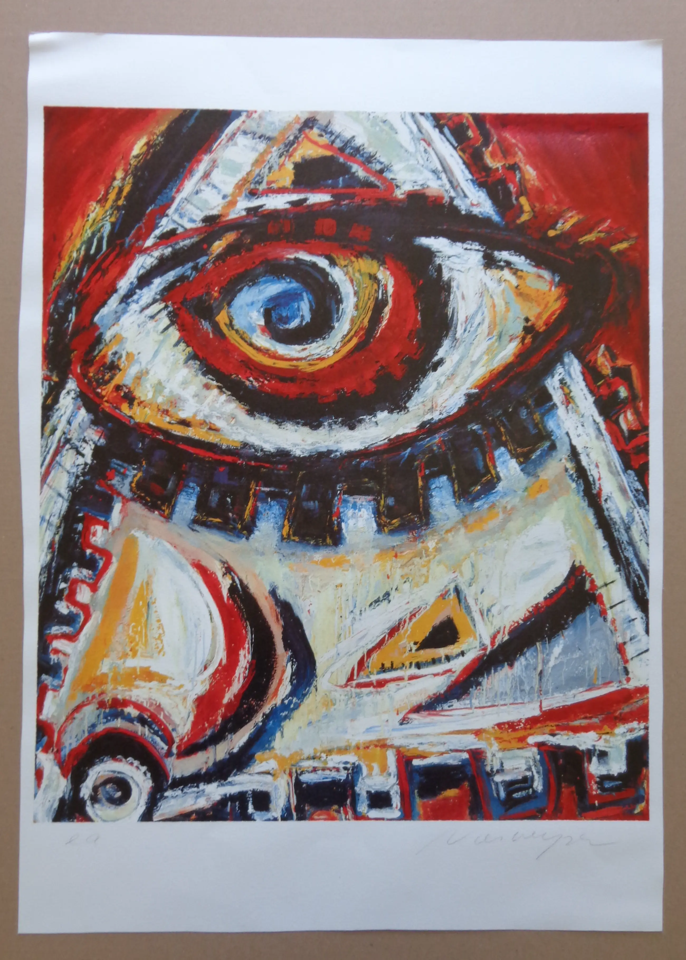 Henk Vierveijzer (°1950). Abstractie. Kleurzeefdruk op dik papier. Gesigneerd met potlood. Ex.nr. e.a. (épreuve d'artiste). Blad: 70x50cm. Goede staat. Gesneden randen. Boord bovenaan met golving.