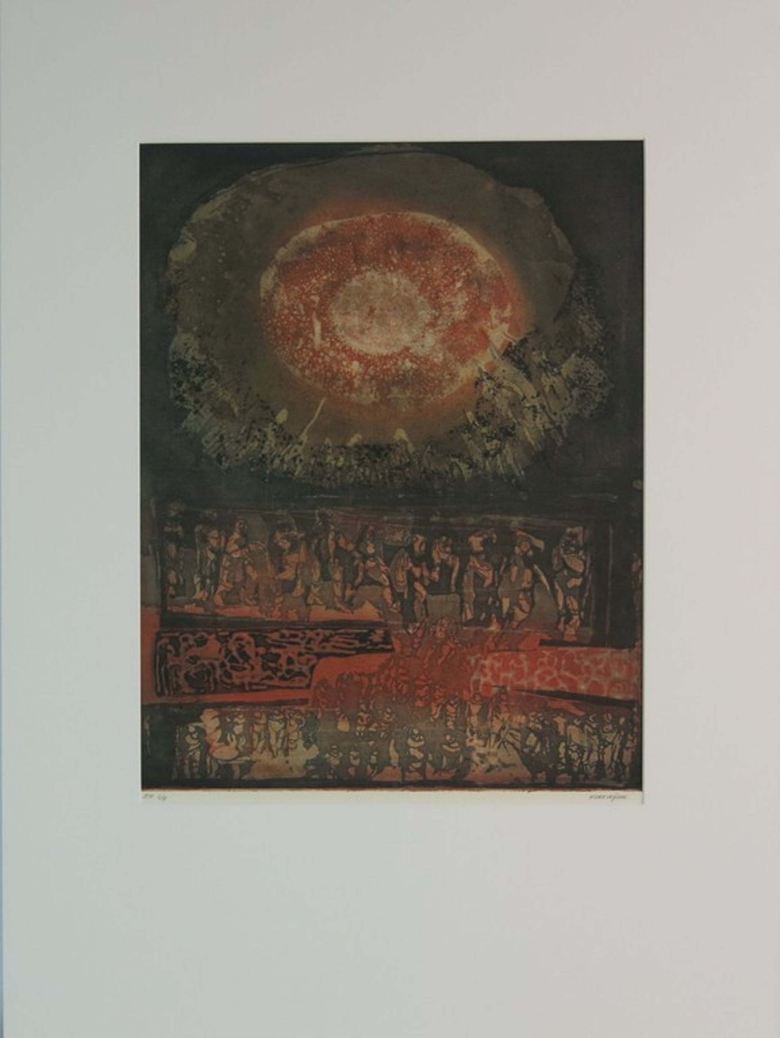 Materiaal: Aquatint op geschept papier, achter passe-partout bevestigd.