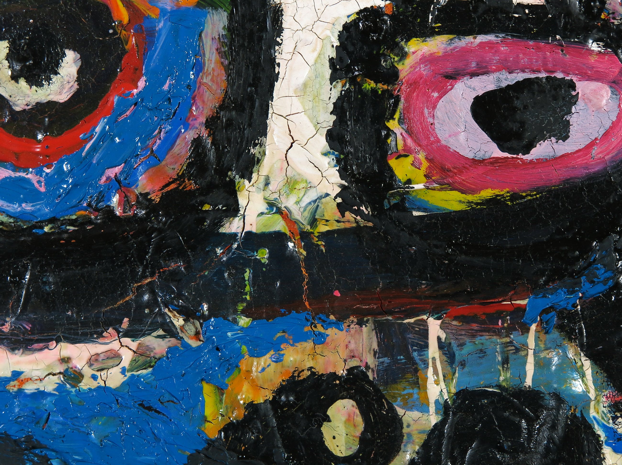 Craquelé verspreid over het doek. Rechtsonder is een puntje verf afgebroken van een dikke klodder (felblauw in wit), dit is echter niet storend. | |
