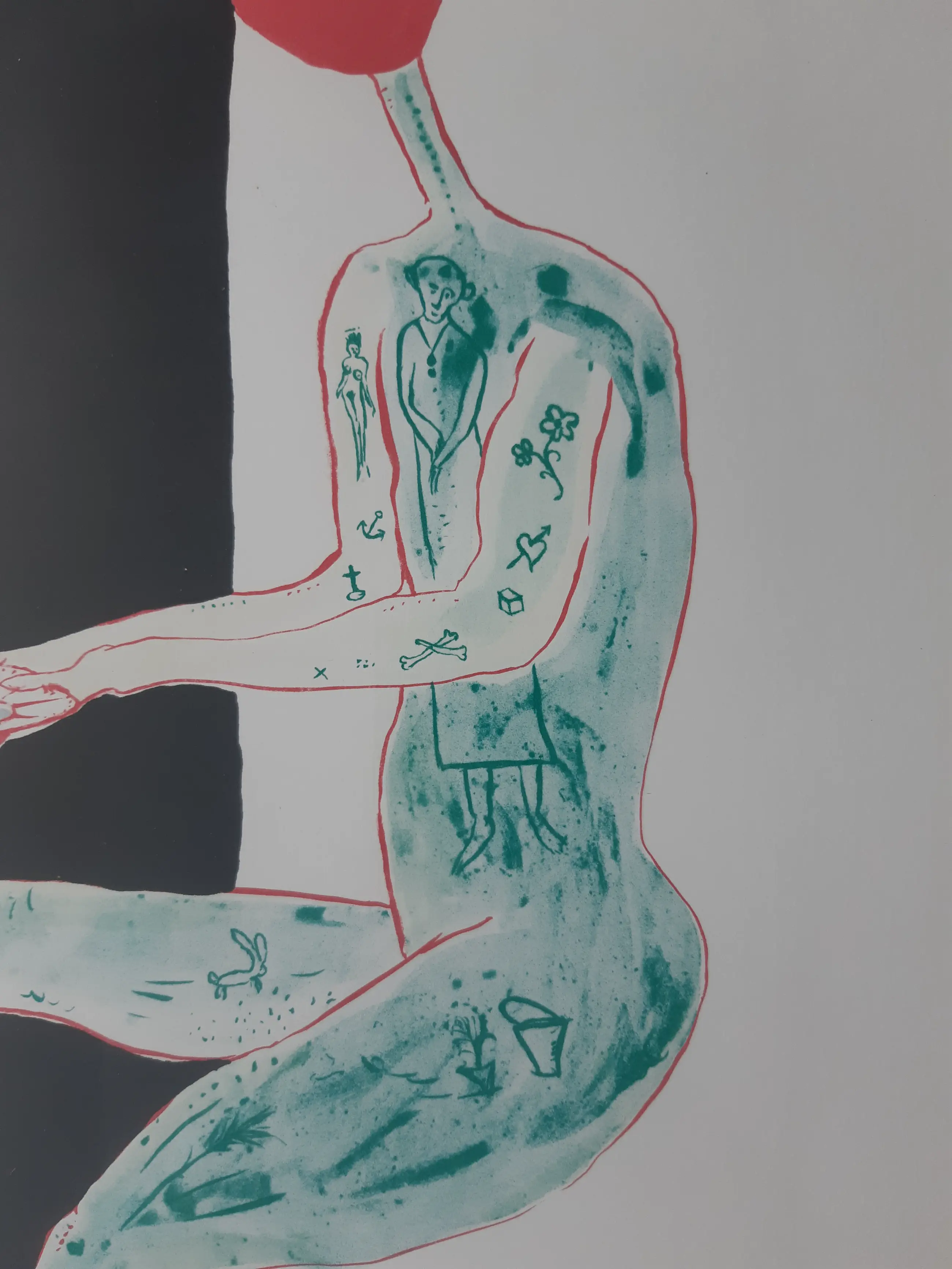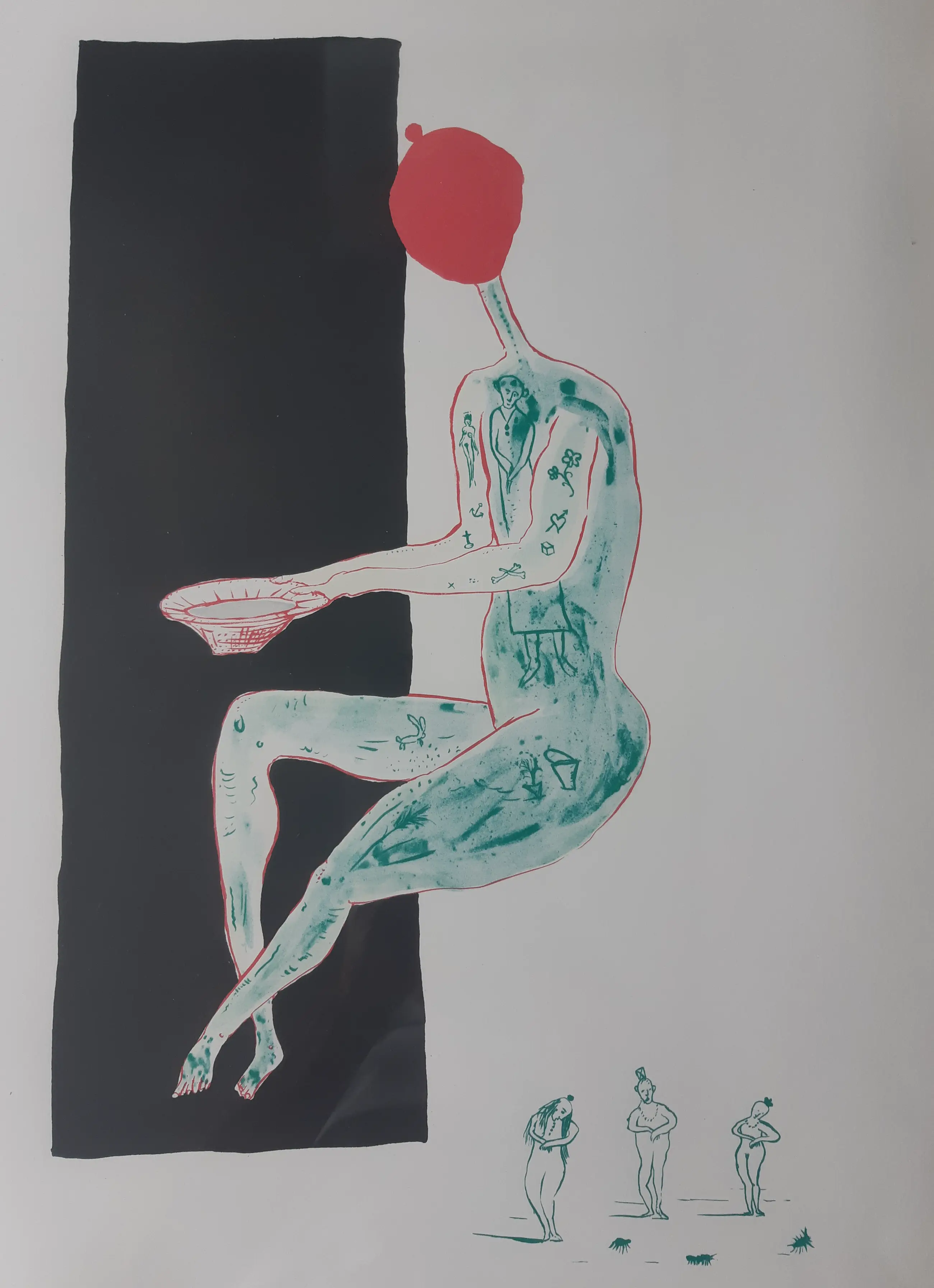 Kenmerkende zeefdruk van beeldhouwer Henk Visch. Met de hand gesigneerd, genummerd en gedateerd. Professioneel ingelijst in houten lijst. De conditie van de zeefdruk is uitstekend. Op de foto's zijn reflecties zichtbaar.