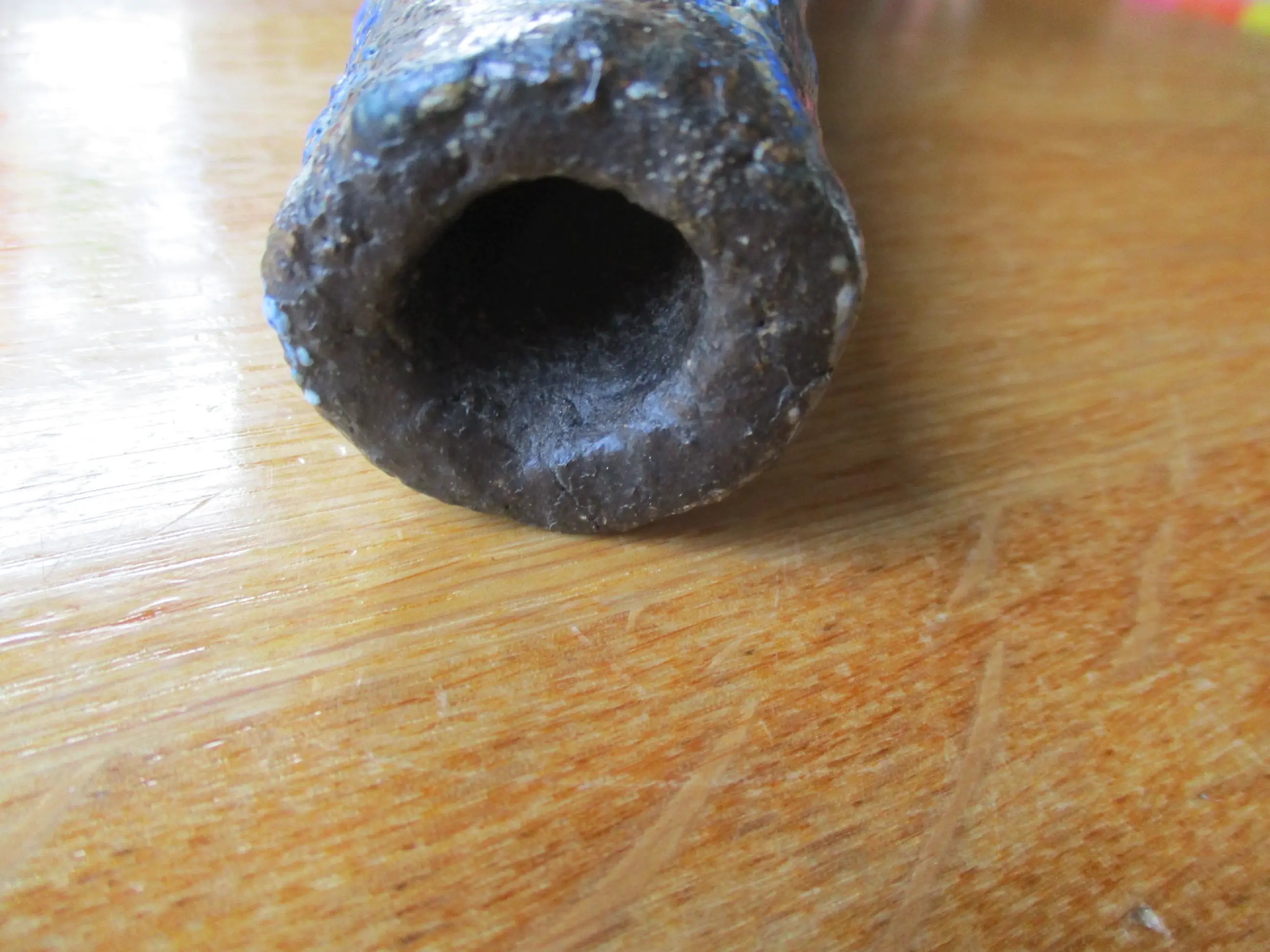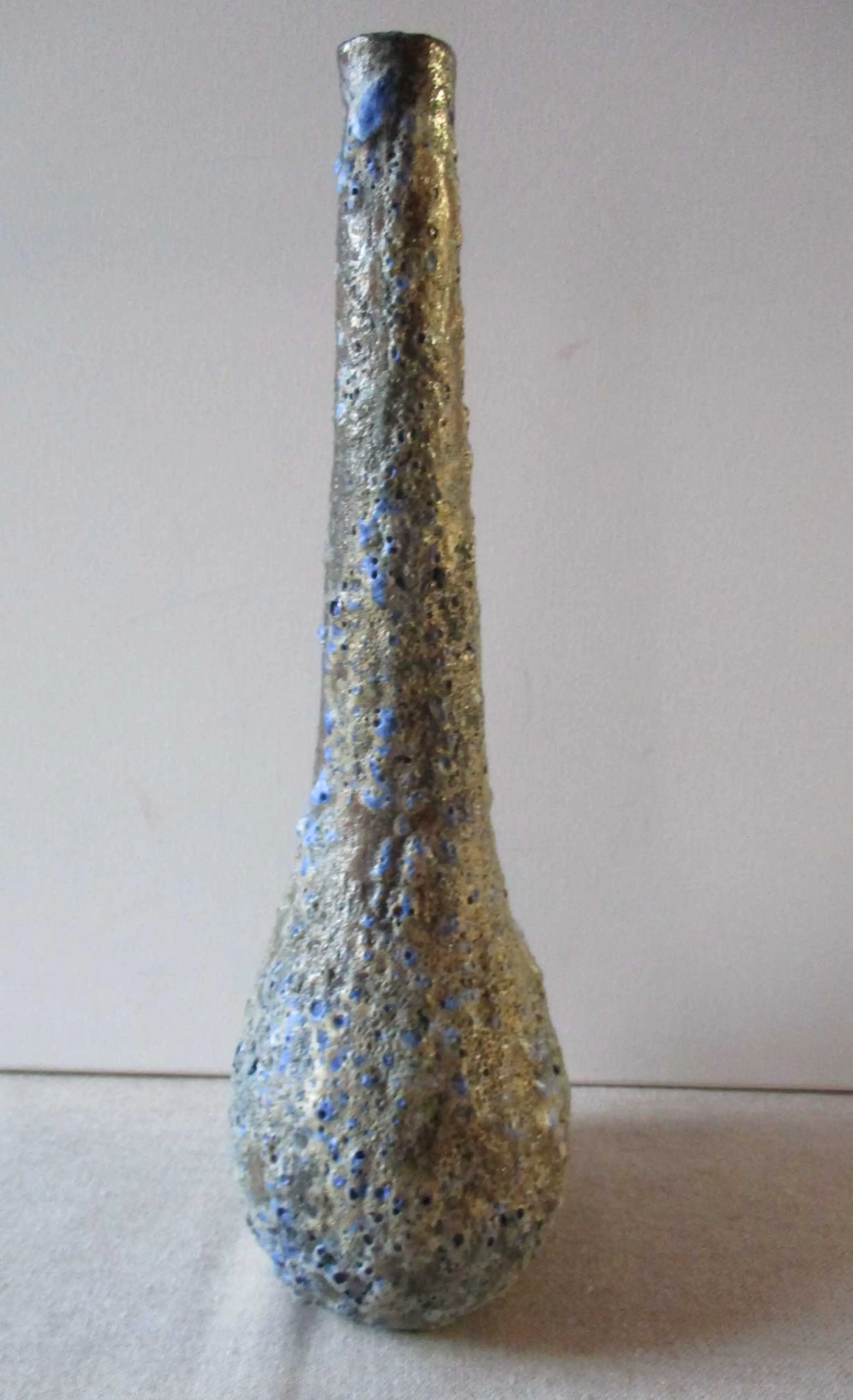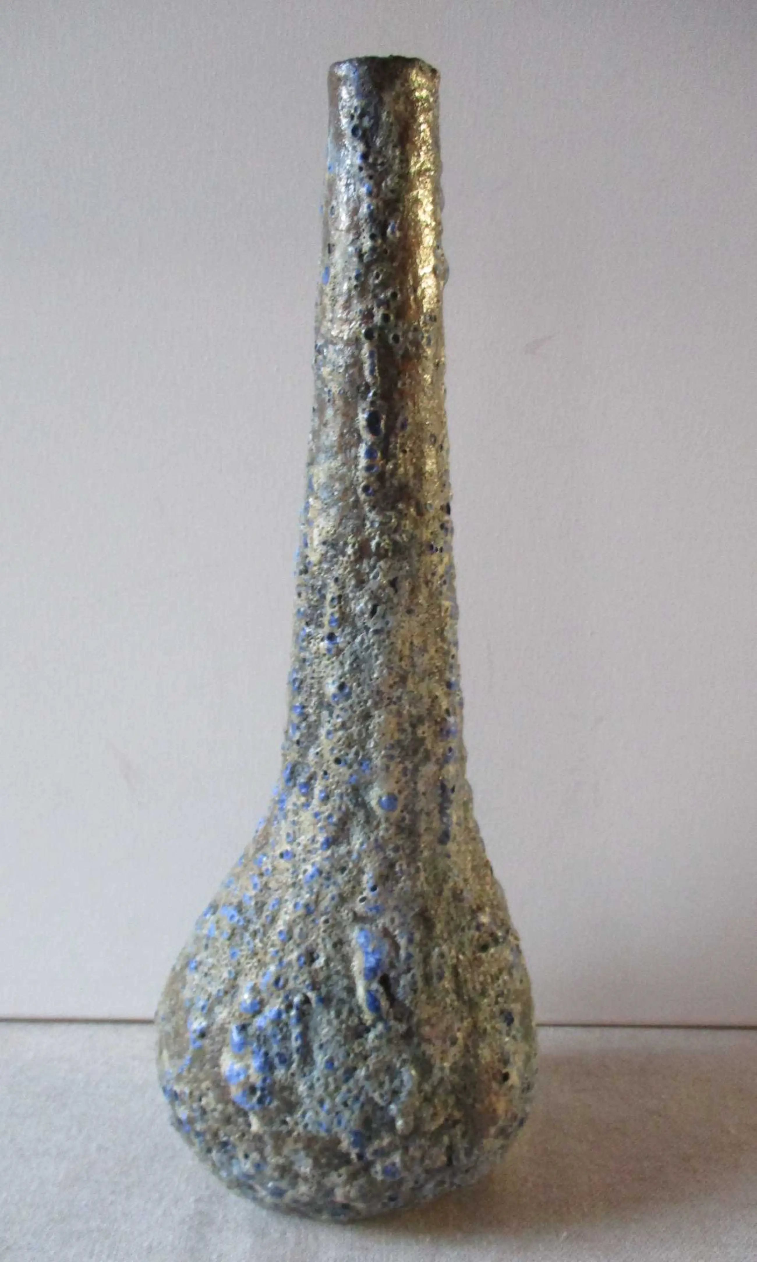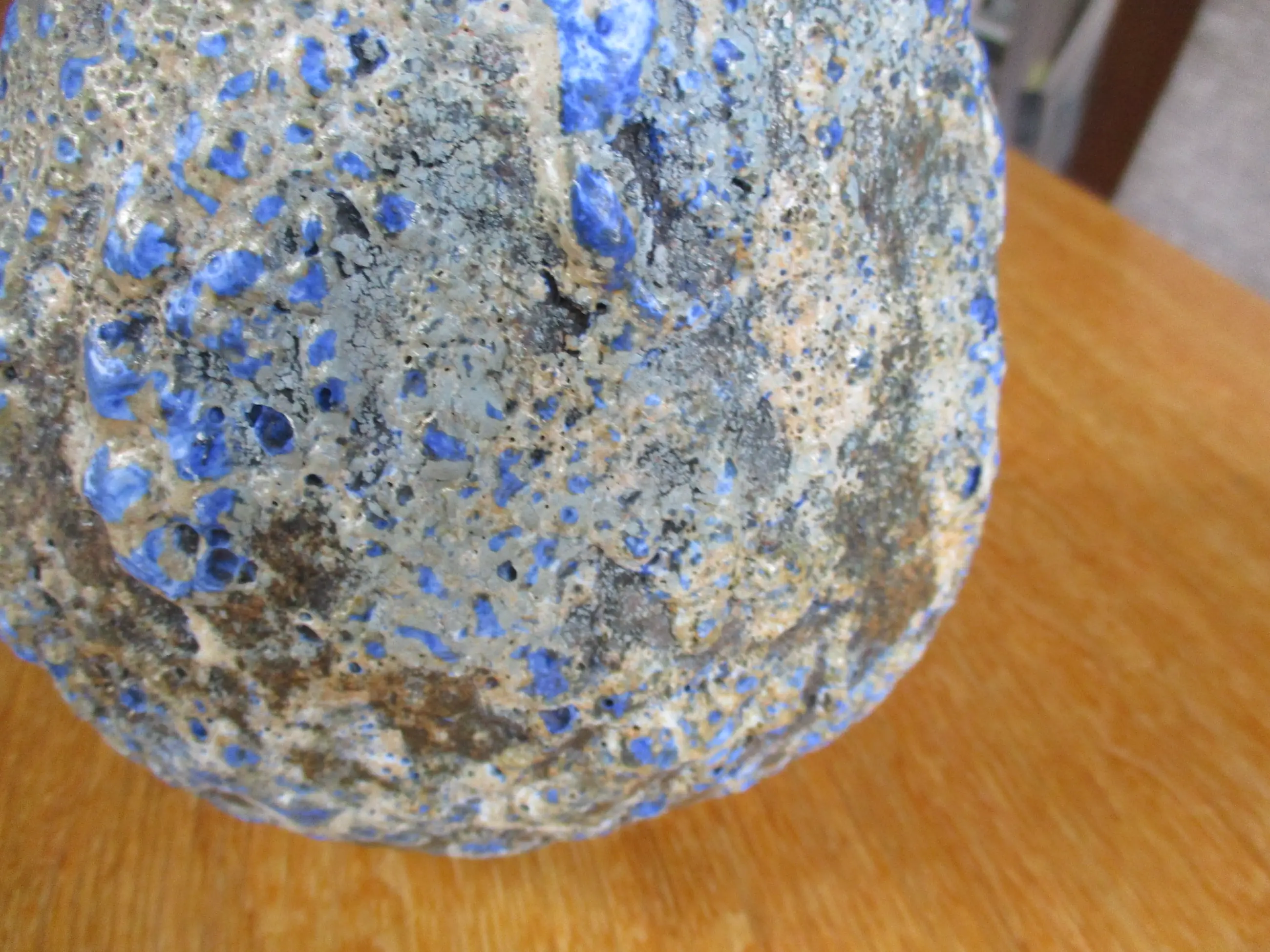 Keramiek vaas met lava glazuur. De vaas heeft een bruine ondergrond met daarover een beige en kobalt blauwe lava galzuur. De vaas is aan de onderzijde gesigneerd: H Wildenberg Beesel.