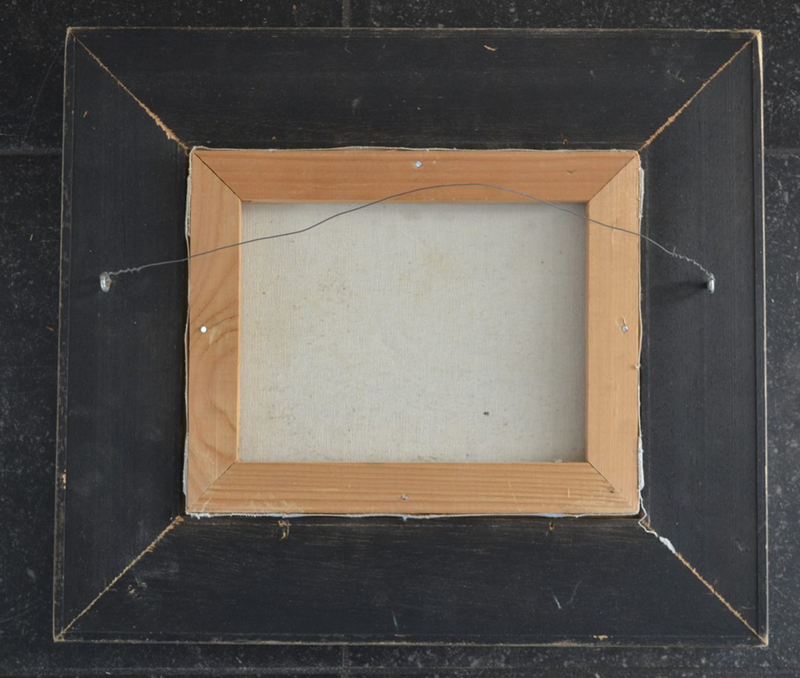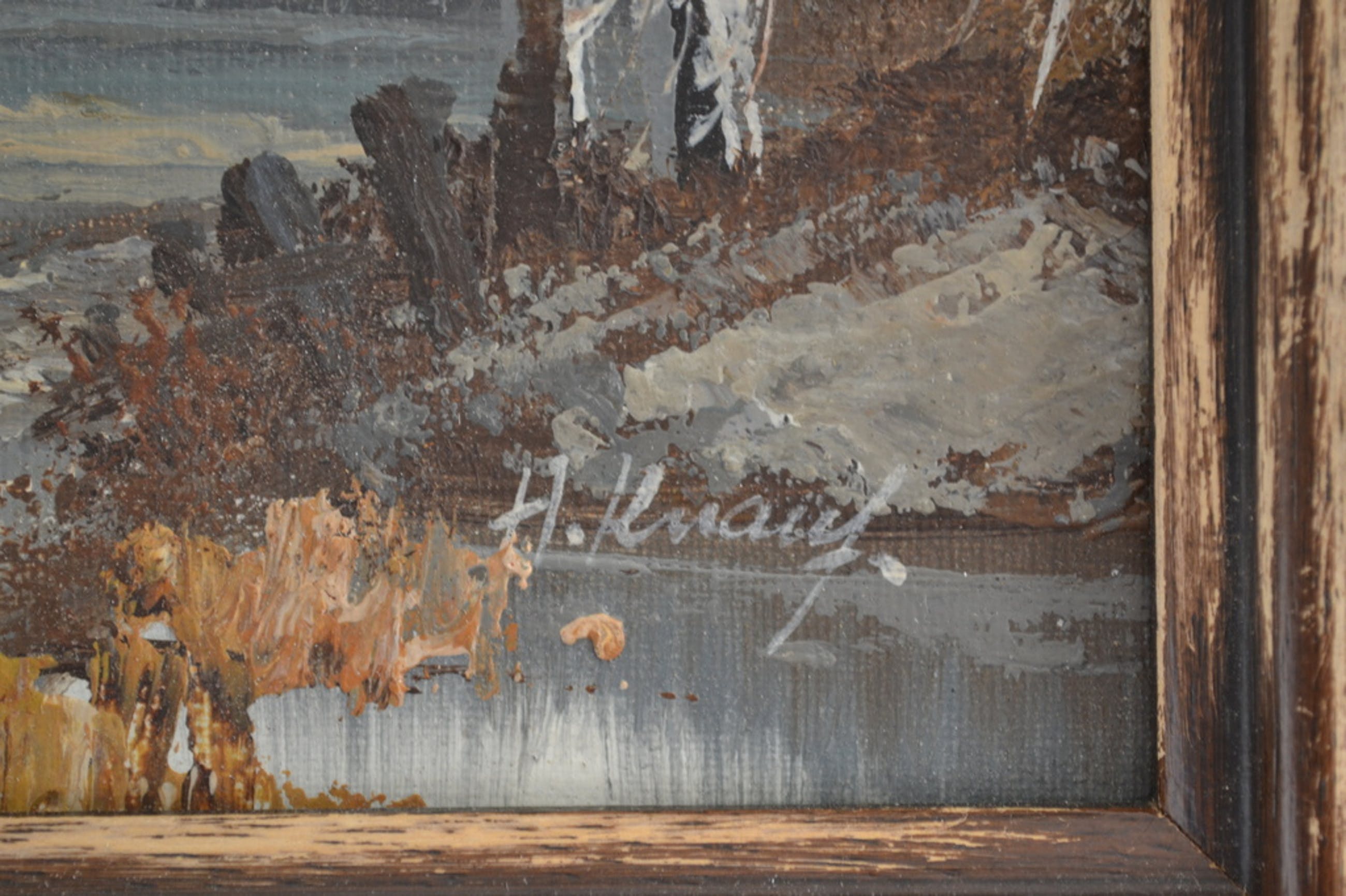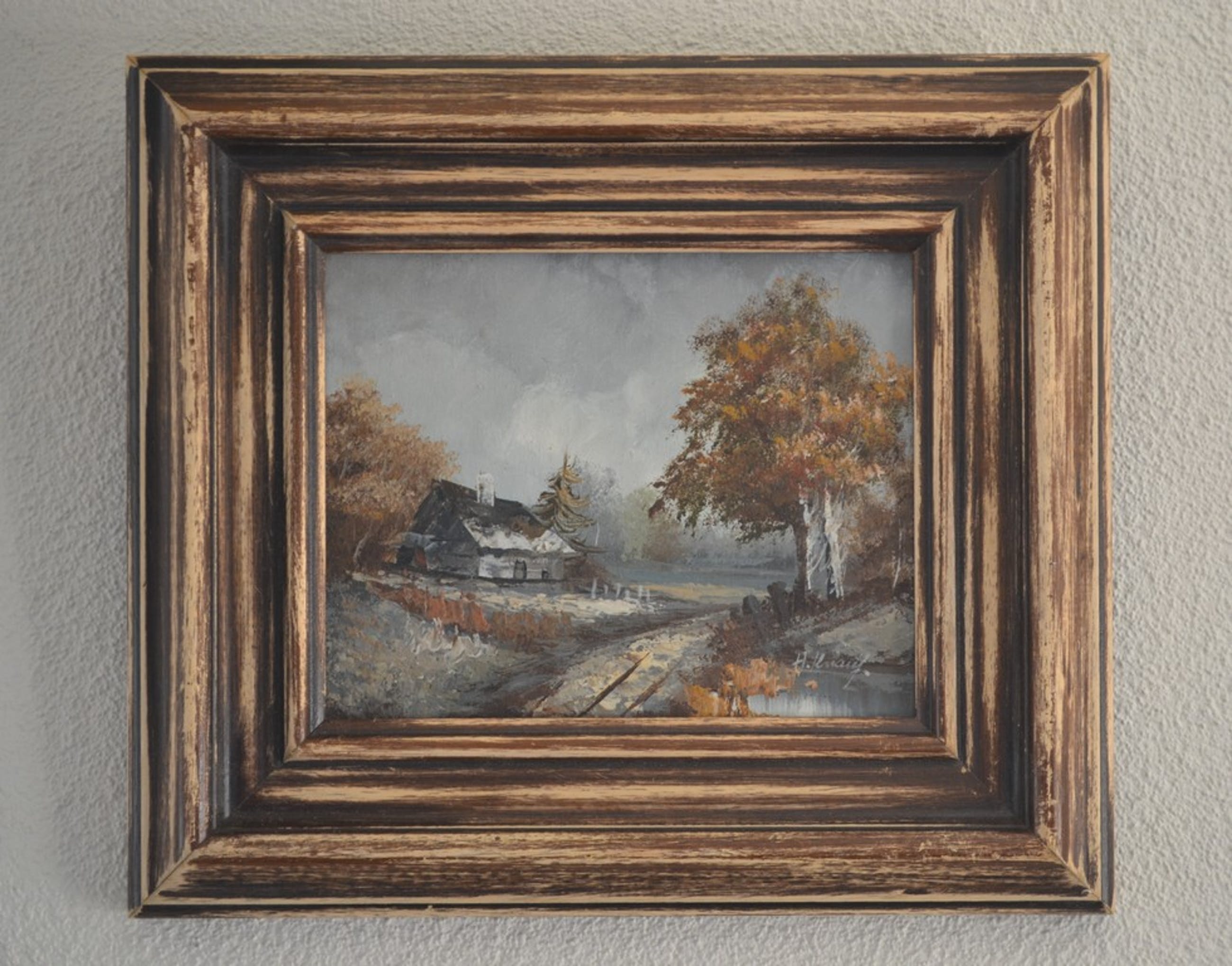 Schilderij van een boederijtje in het bos, rechtsonder gesigneerd H. Knauf. Zowel doek als lijst in uitstekende staat.