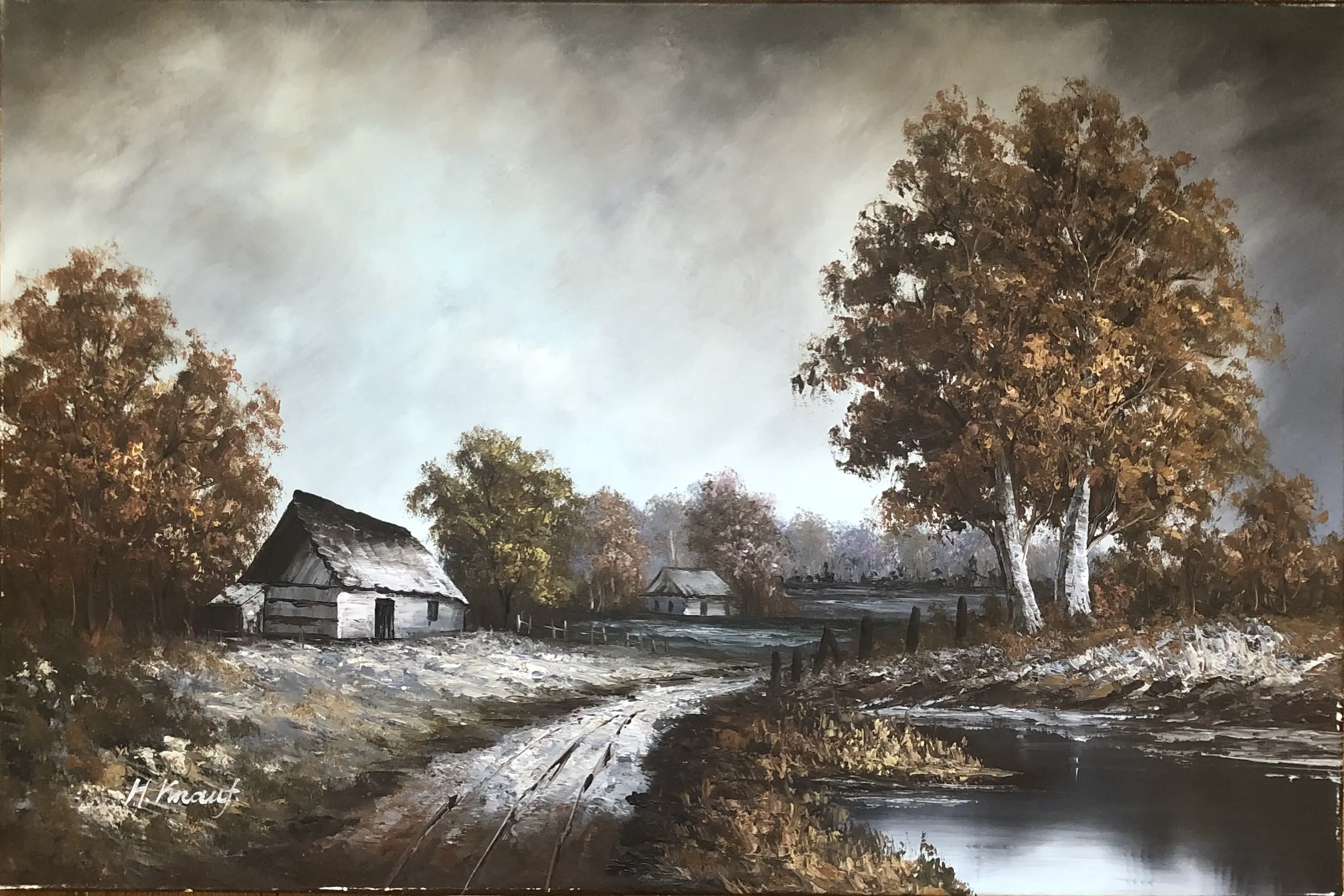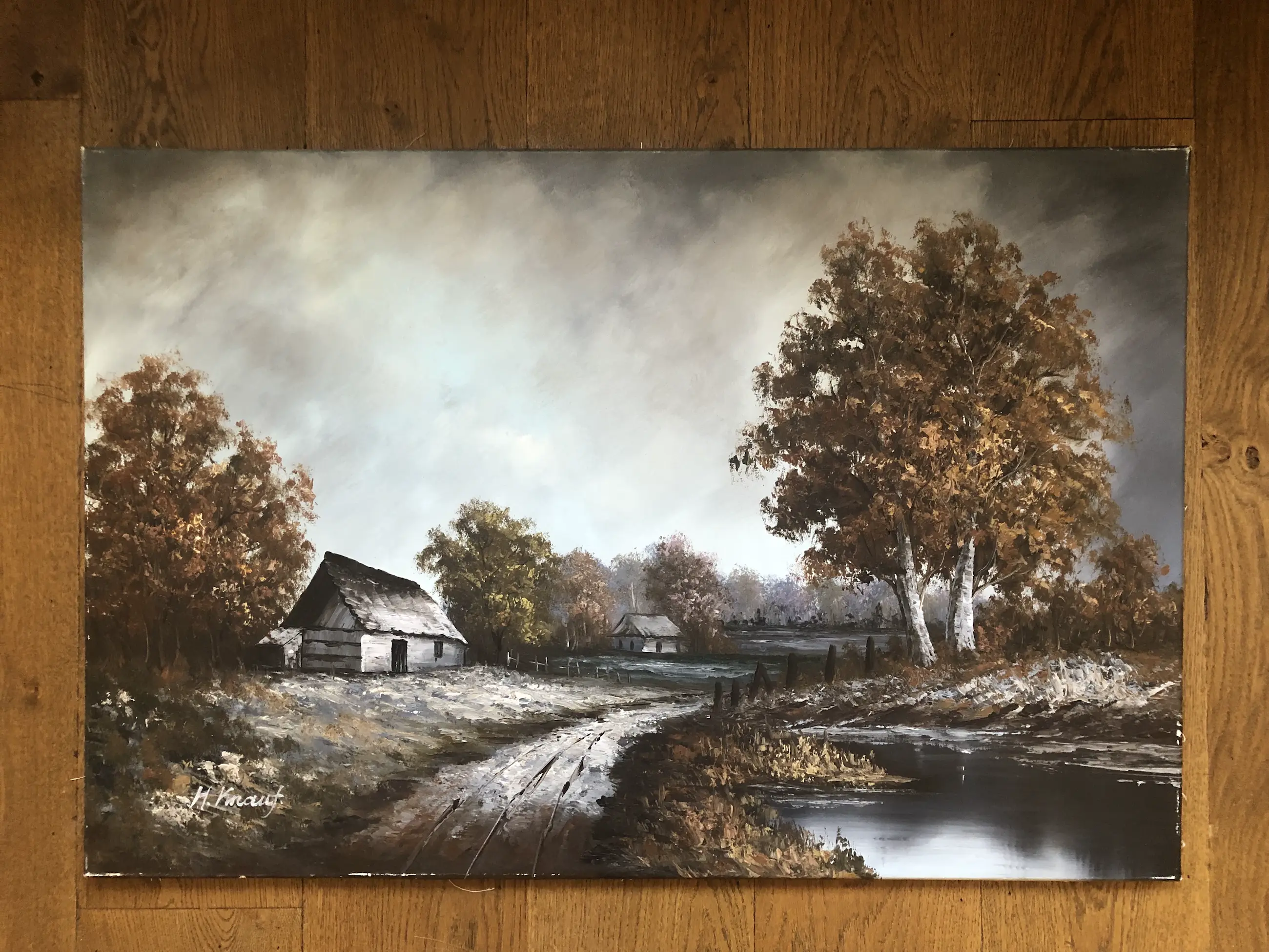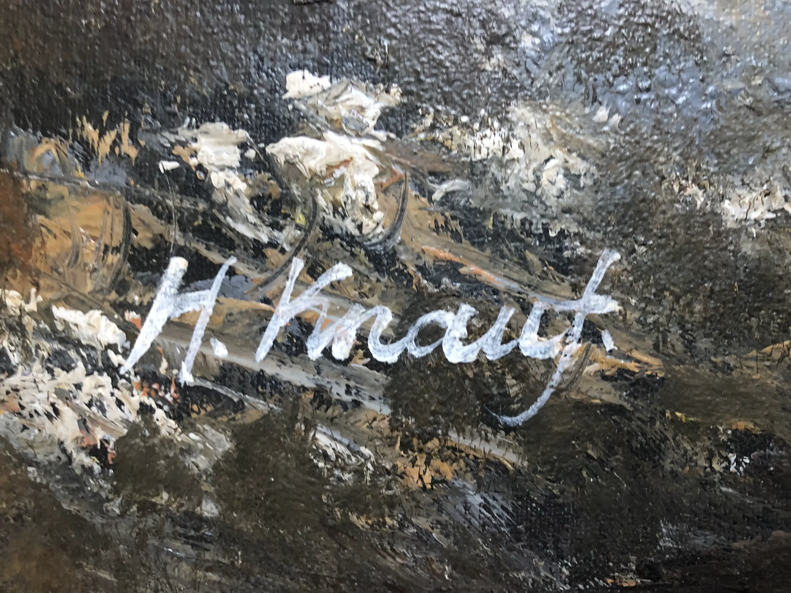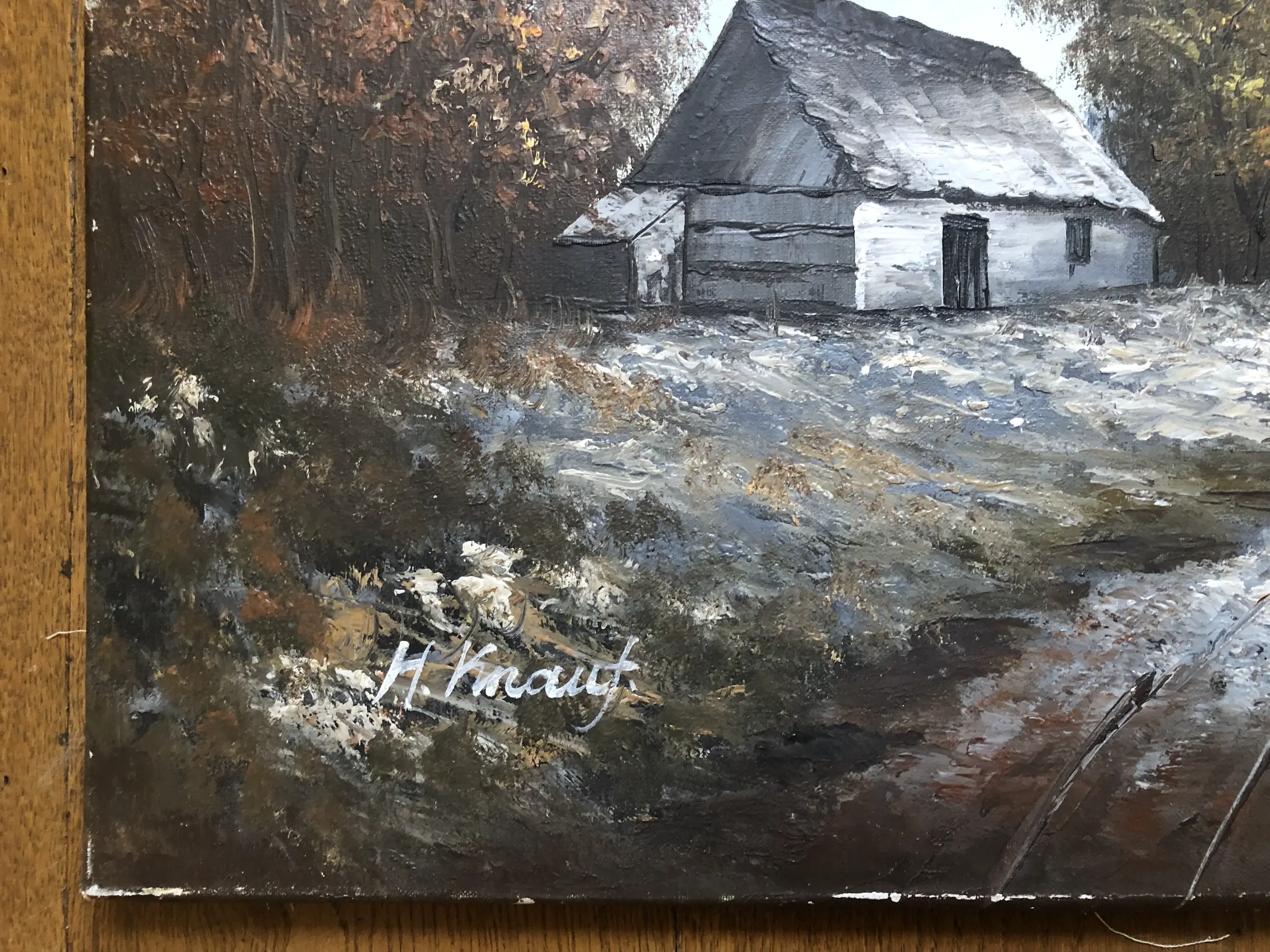 Zeer verfijnd olieverf schilderij met prachtig winters landschap met boerderij, gesigneerd door H. Knauf.