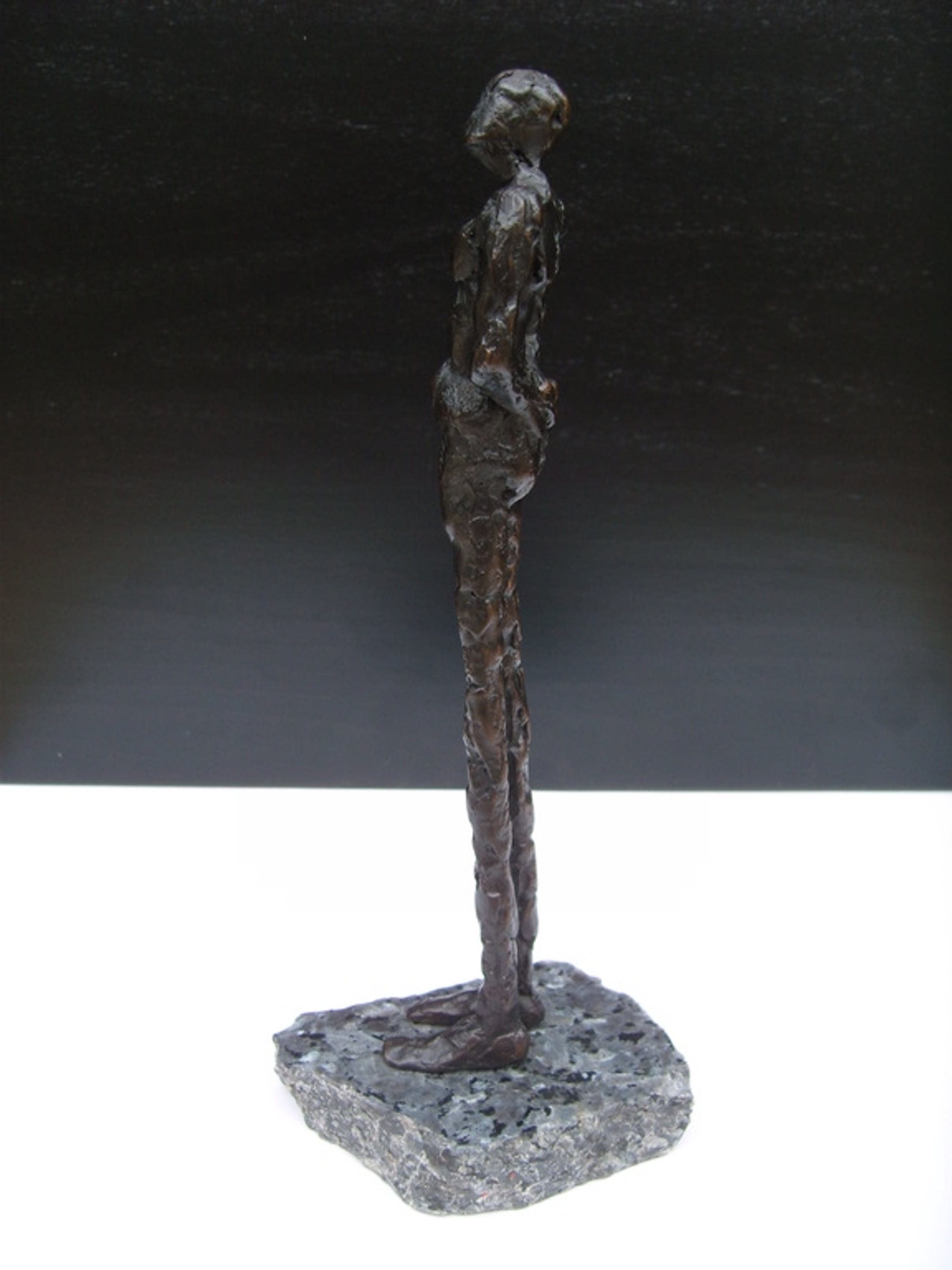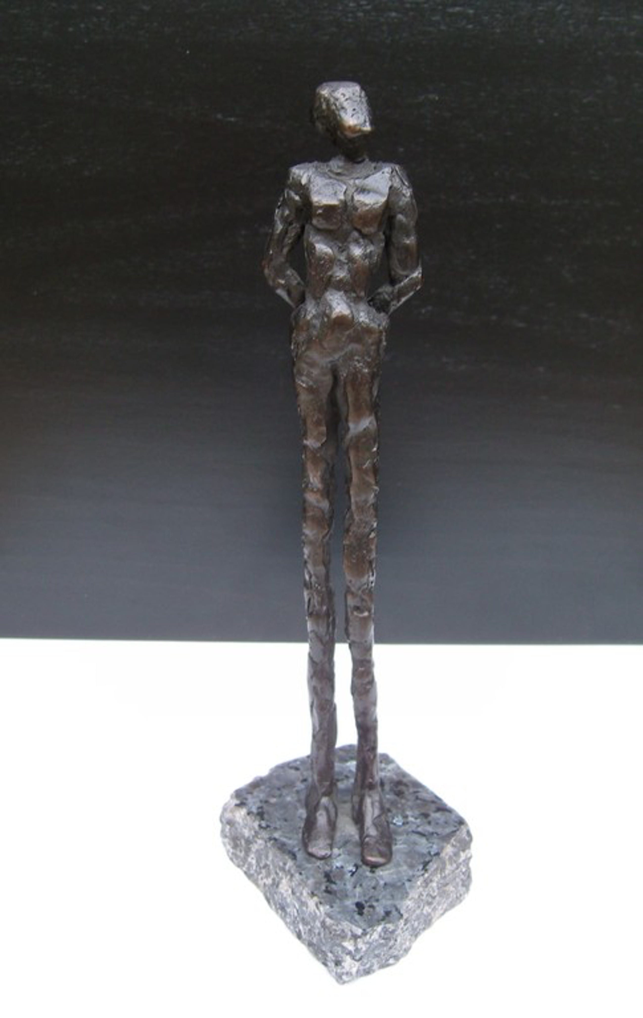 Ingetogen (Giacometti-achtig) beeldje van deze in Spanje woonachtige kunstenares.