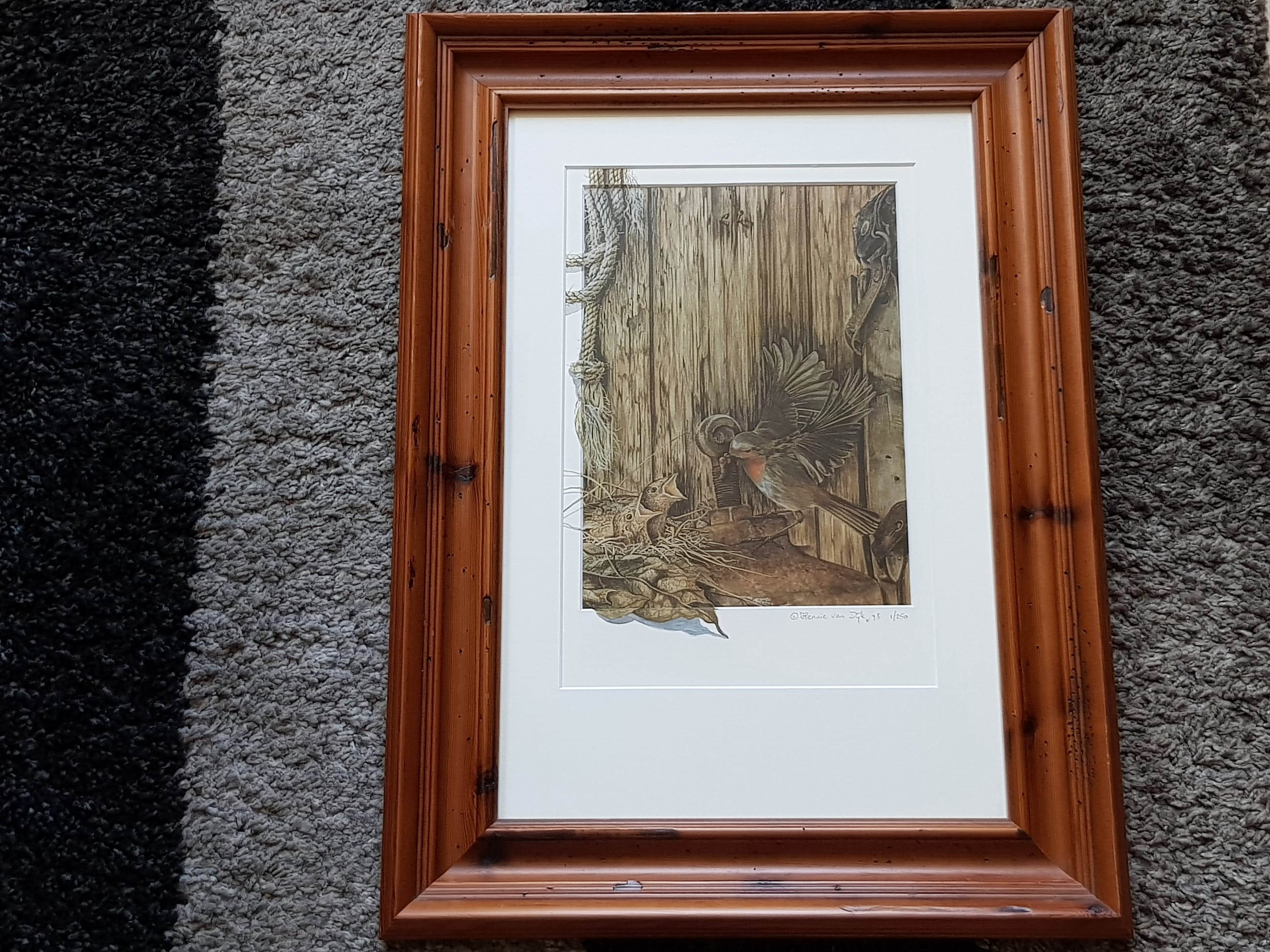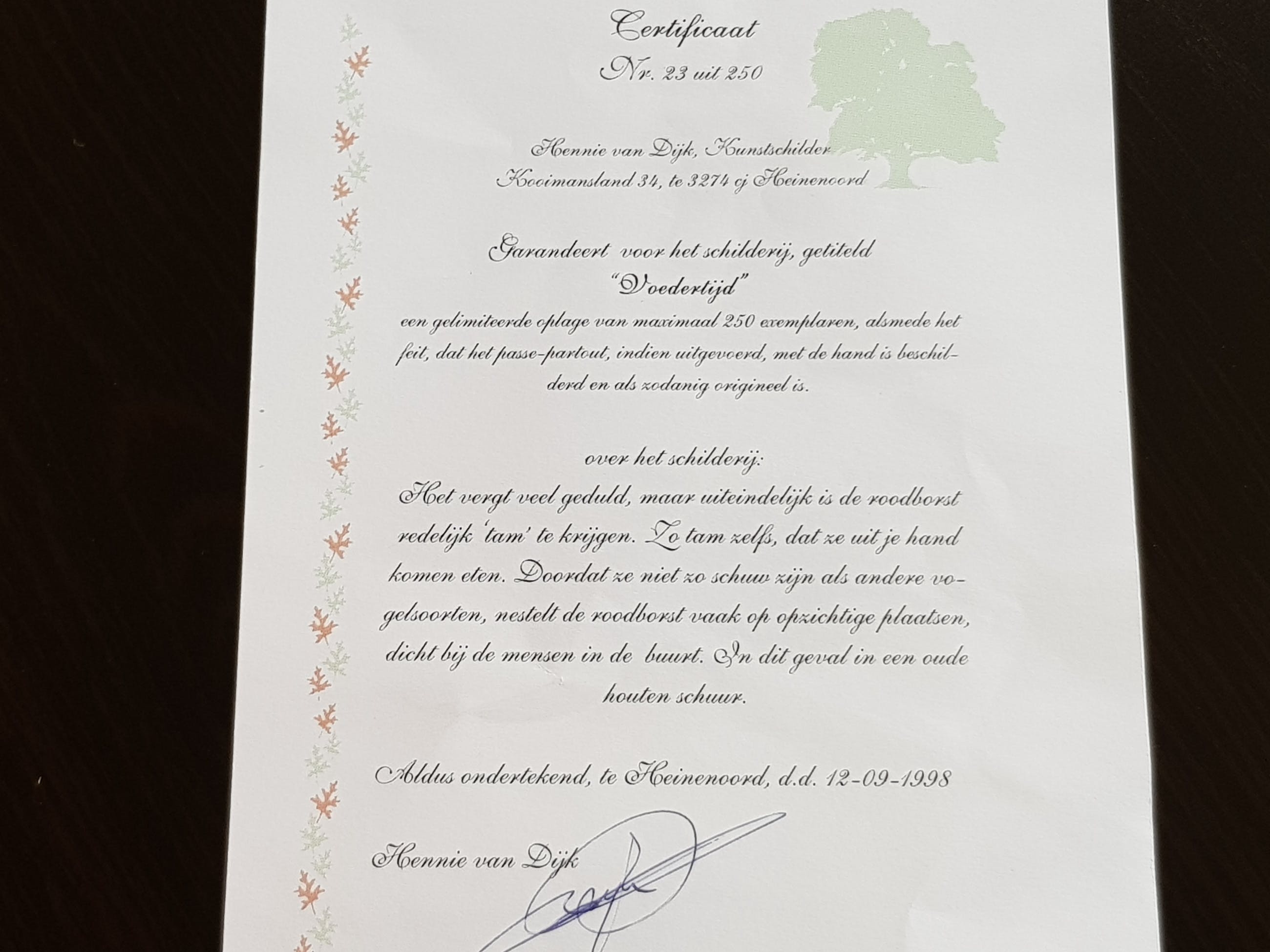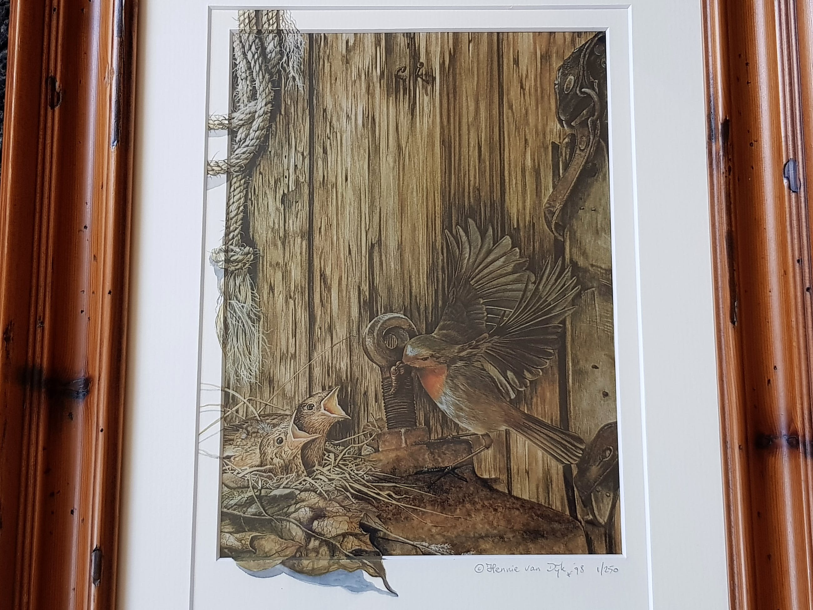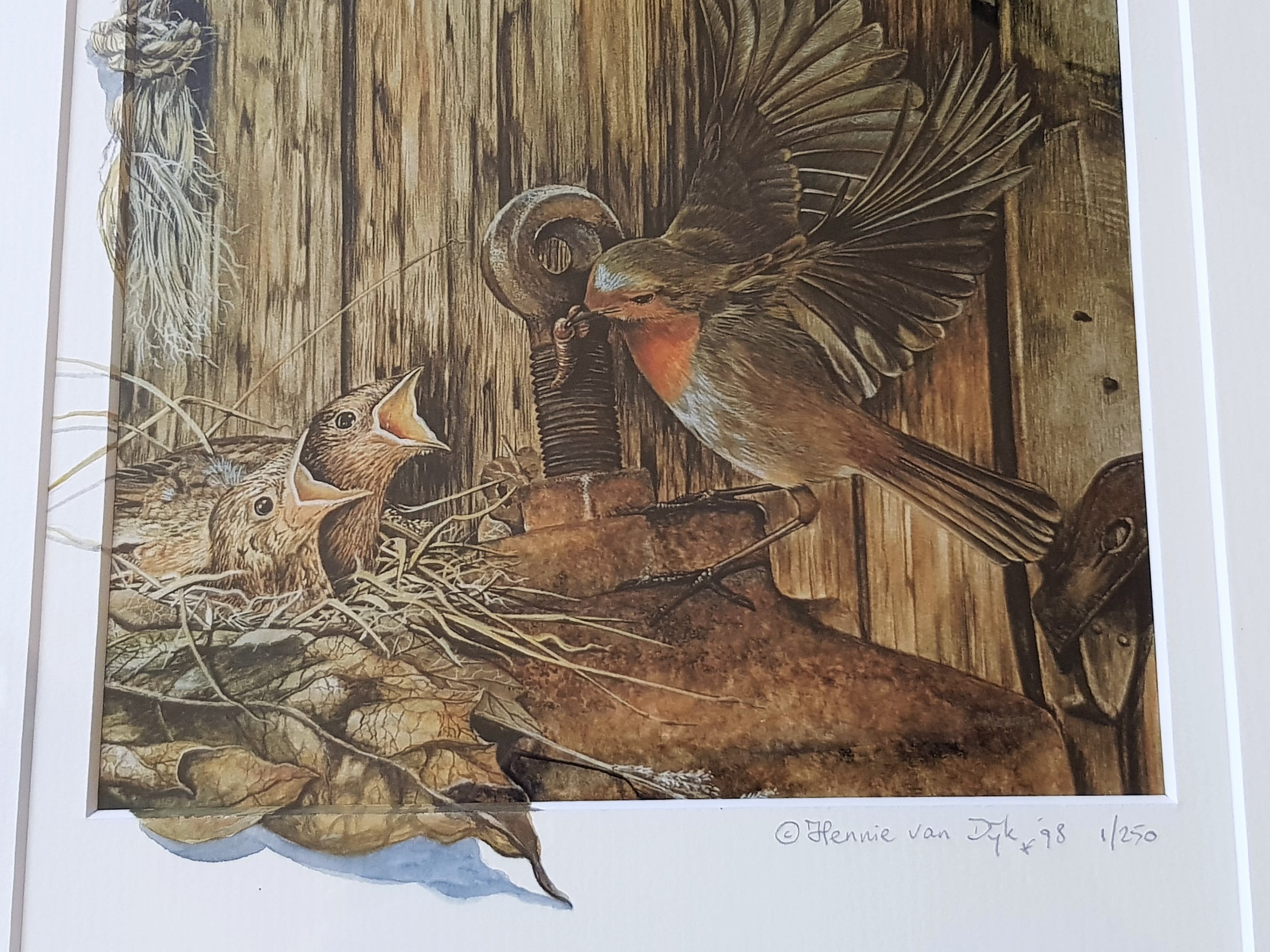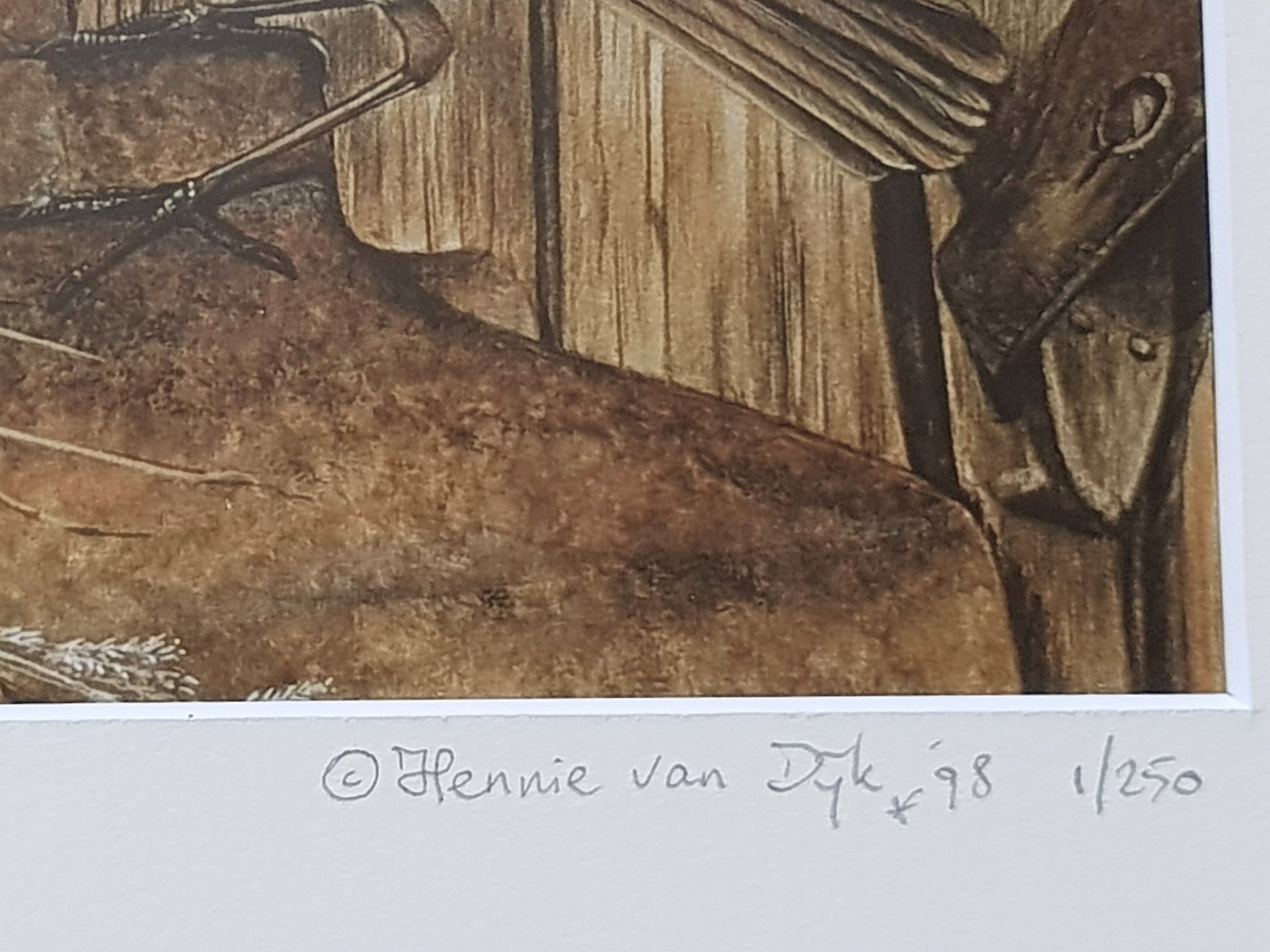 Ingelijste schilderij van kunstenaar Hennie van Dijk. Geboren, Rotterdam 1956. Gesigneerd en gedateerd 1998. Titel: Voedertijd Oplage: 1/250. Het schilderij heeft een dubbele passe-partout en deze is meegeschilderd. Afm totaal: 57.5 x 42.5 cm. Afm met geschilderd passe-partout: 33 x 22 cm. Inclusief: zware houten lijst, glasplaat, ophangmogelijkheid en certificaat. Bij verzenden wordt het zorgvudig ingepakt, zodat er niks mee kan gebeuren.