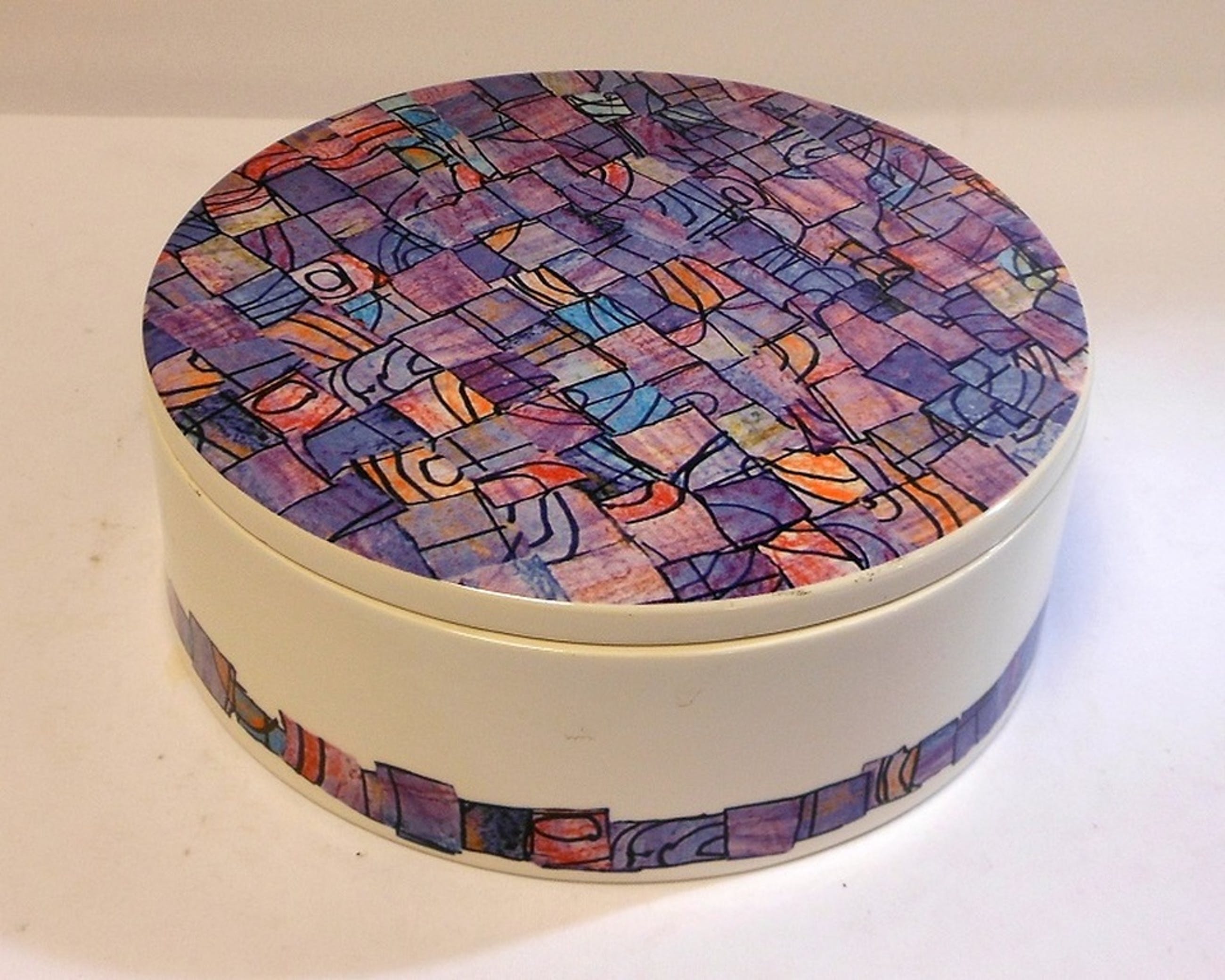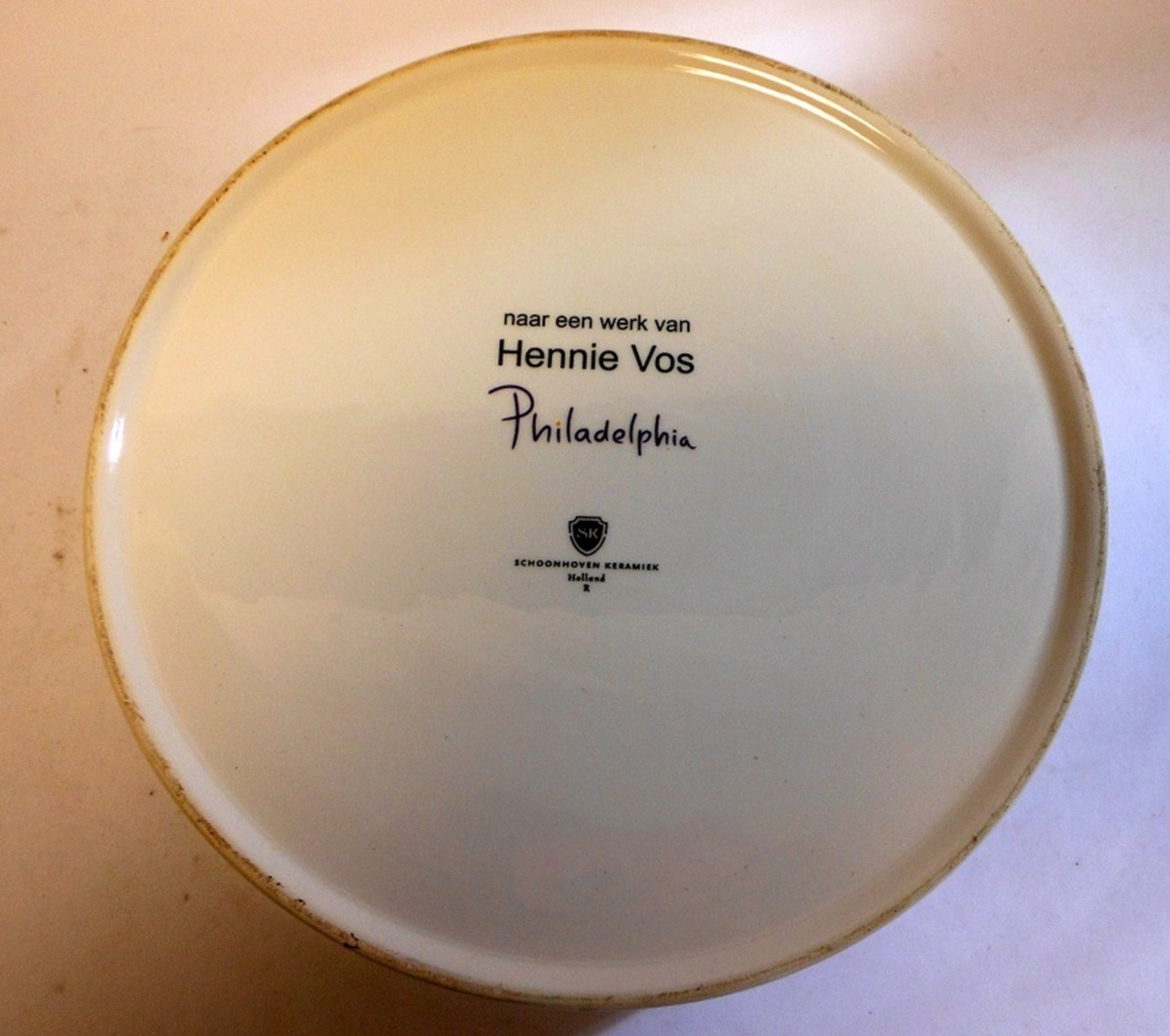Prachtige keramiek dekseldoos naar een ontwerp van Hennie Vos. Doorsnede 20 cm, conditie goed, minimale gebruikssporen.