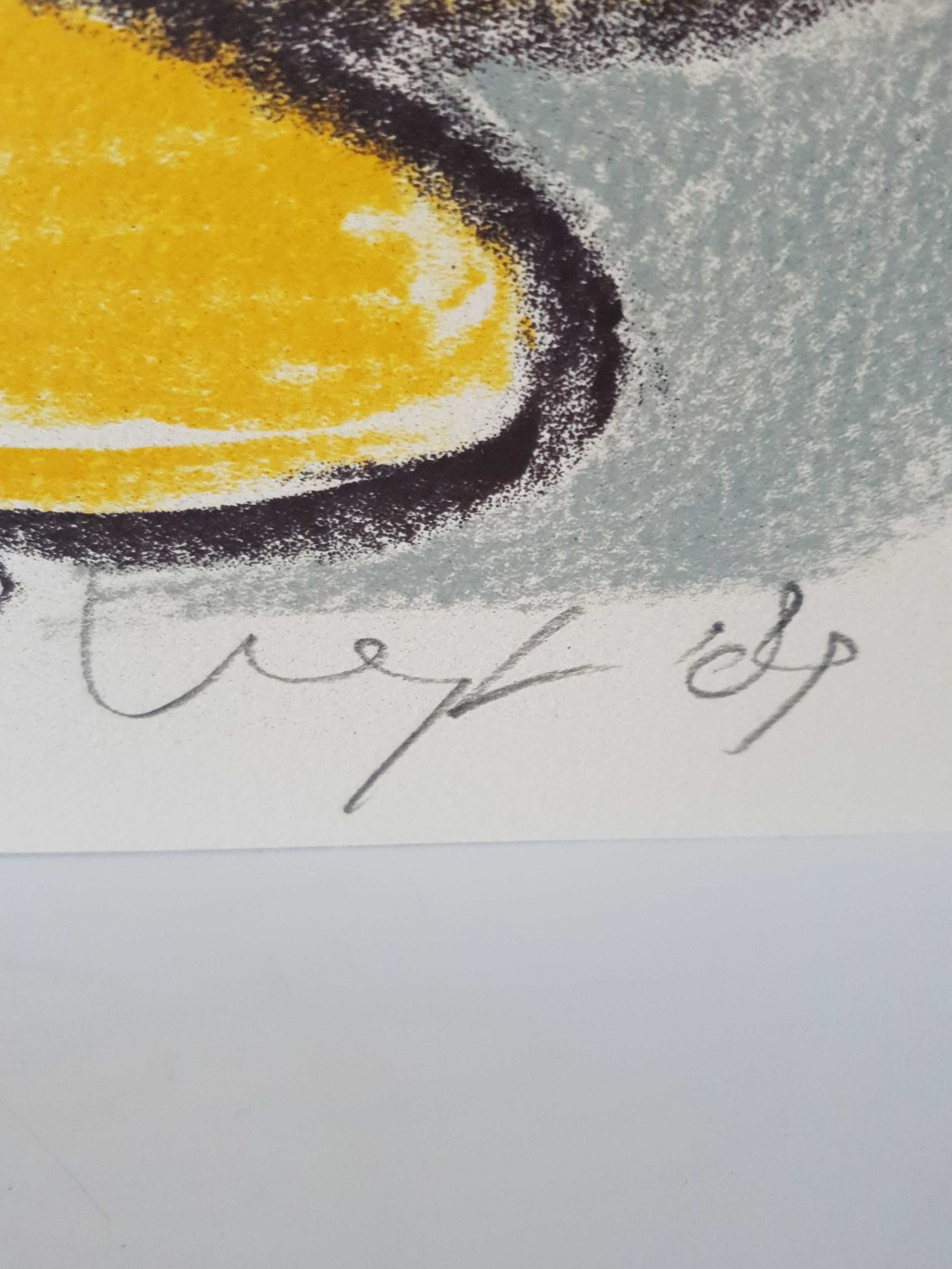Jaartal: 1989 Afmetingen blad: 65 cm x 50 cm Oplage: 054/200 Gesigneerd: Ja, handgeschreven met potlood (rechtsonder) Materiaal: Zeefdruk op papier Ingelijst: Nee Conditie: in goede staat