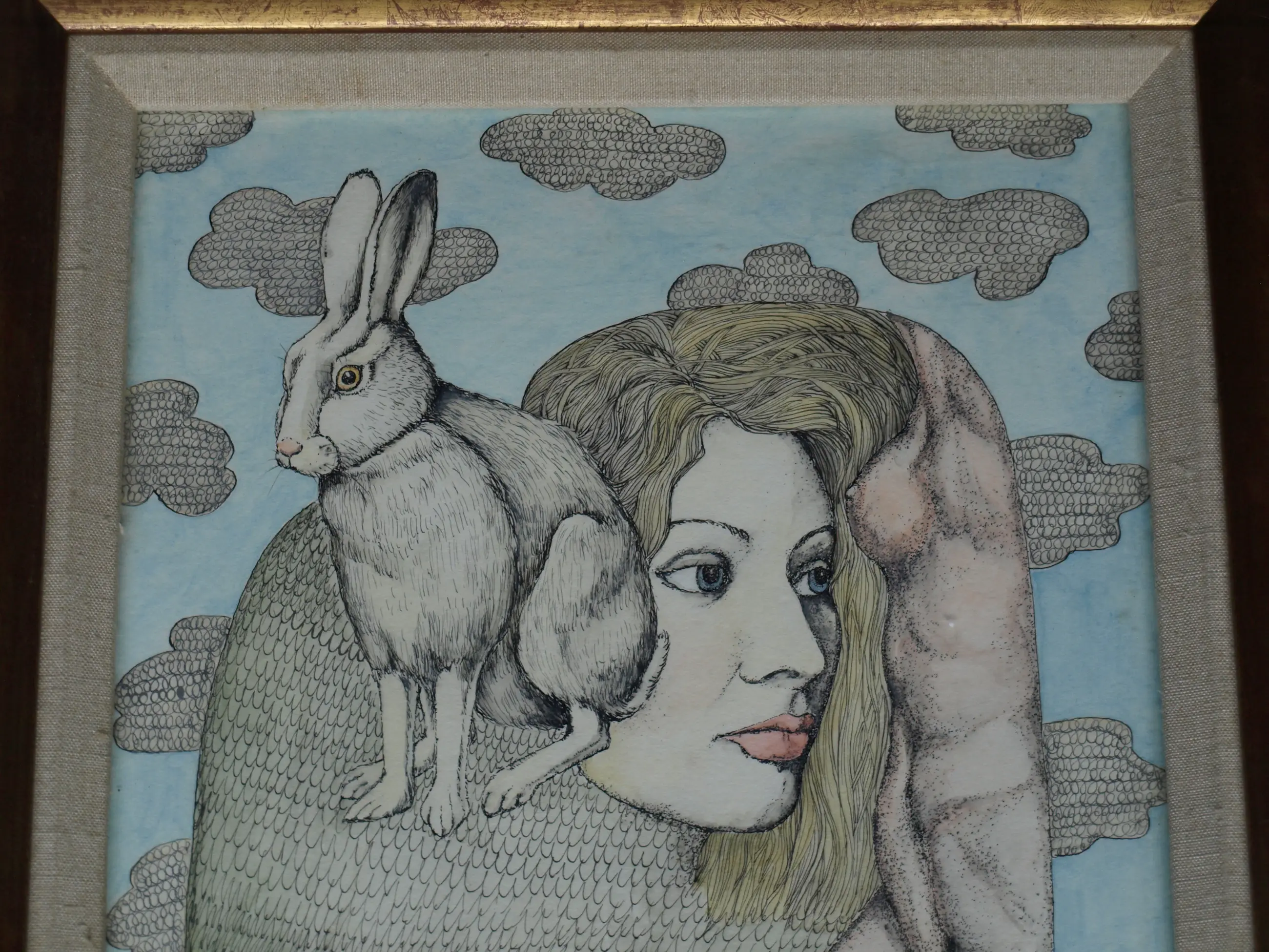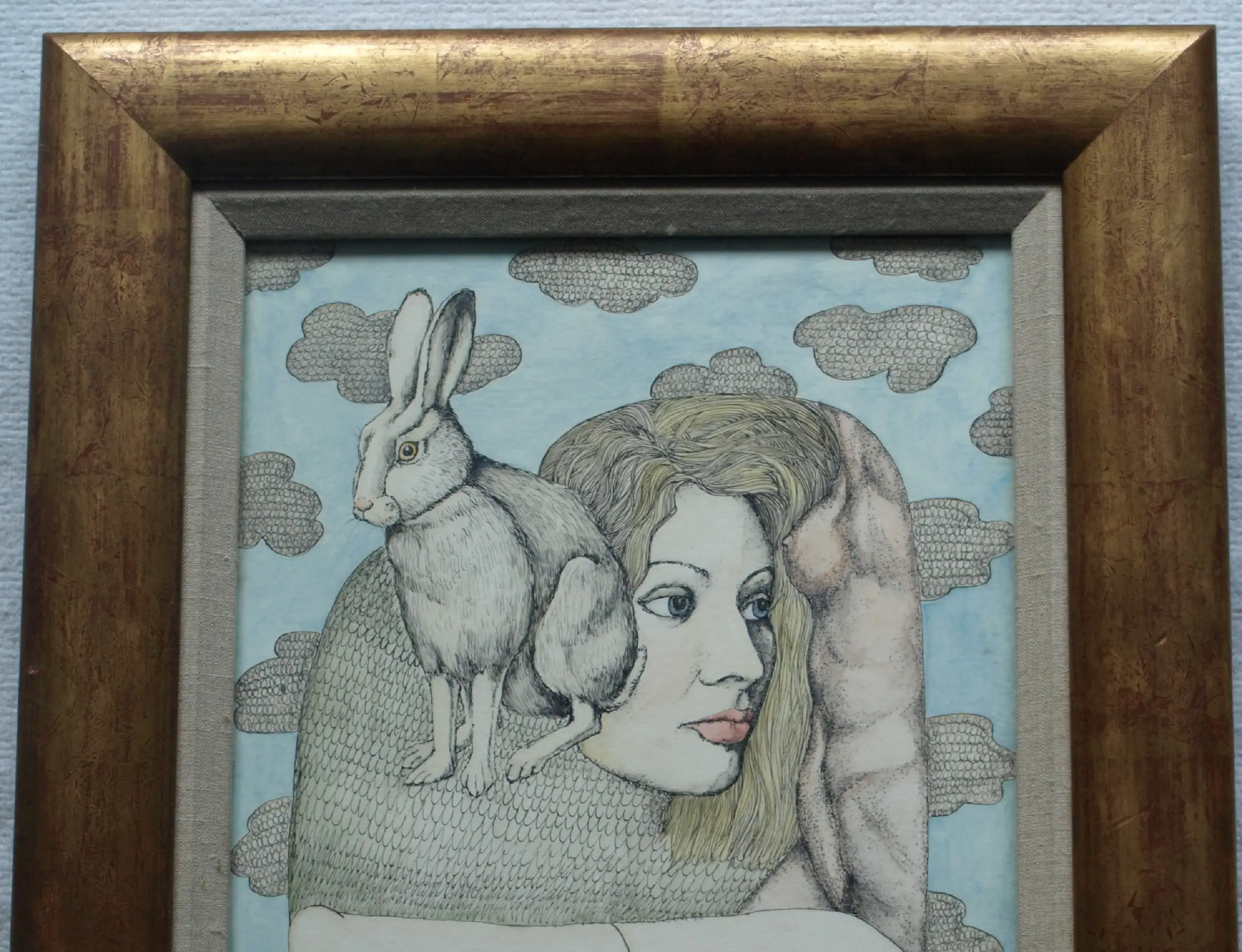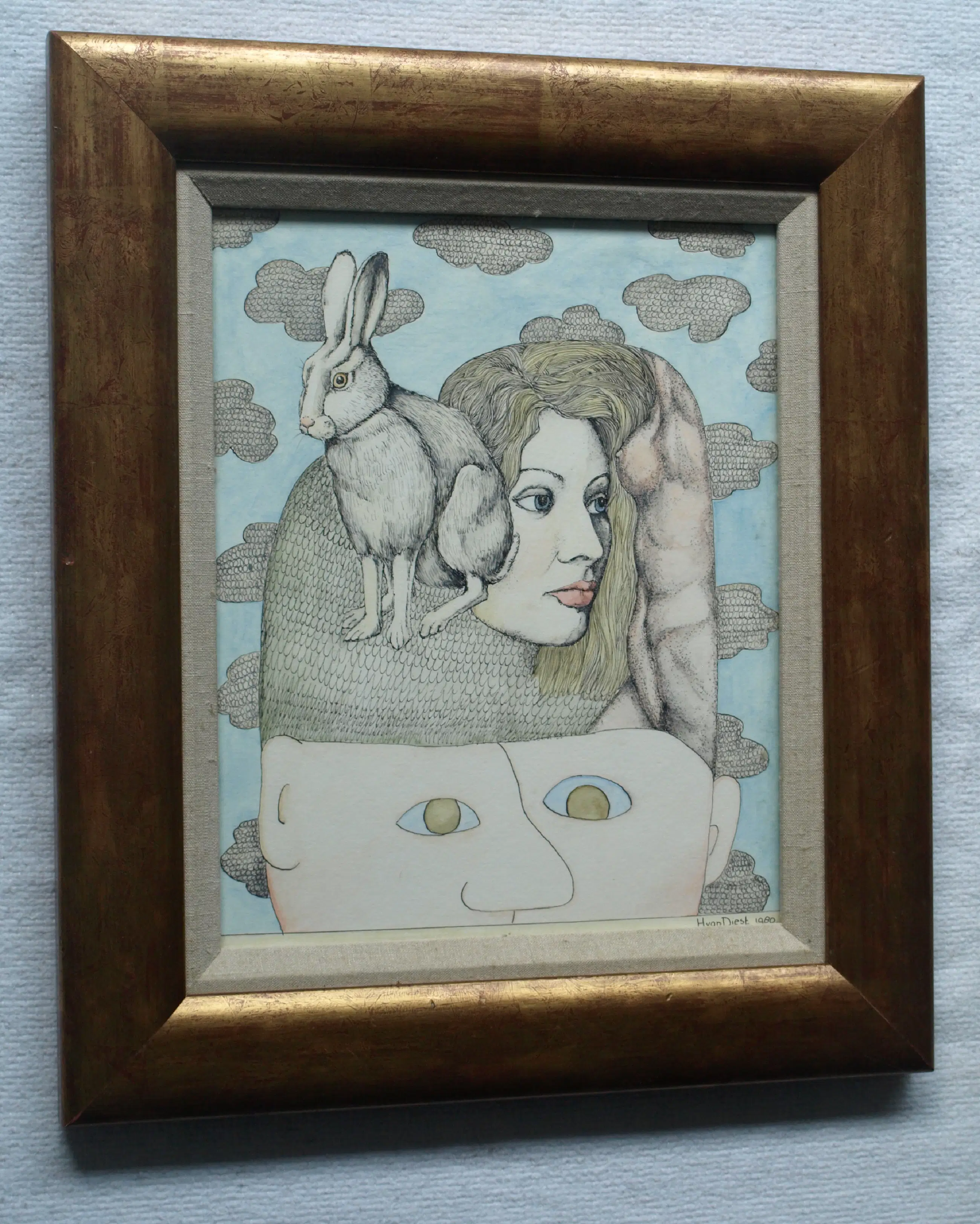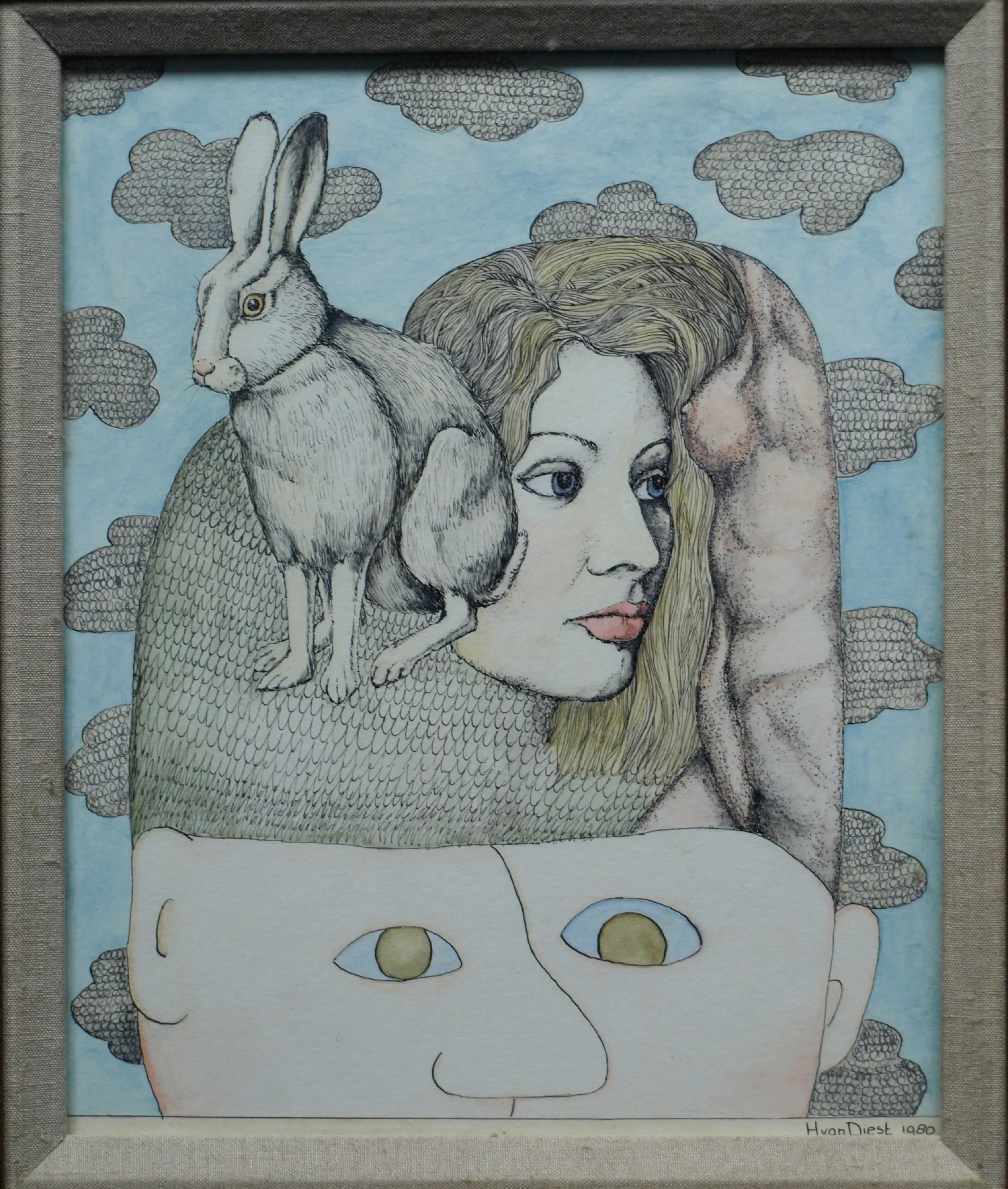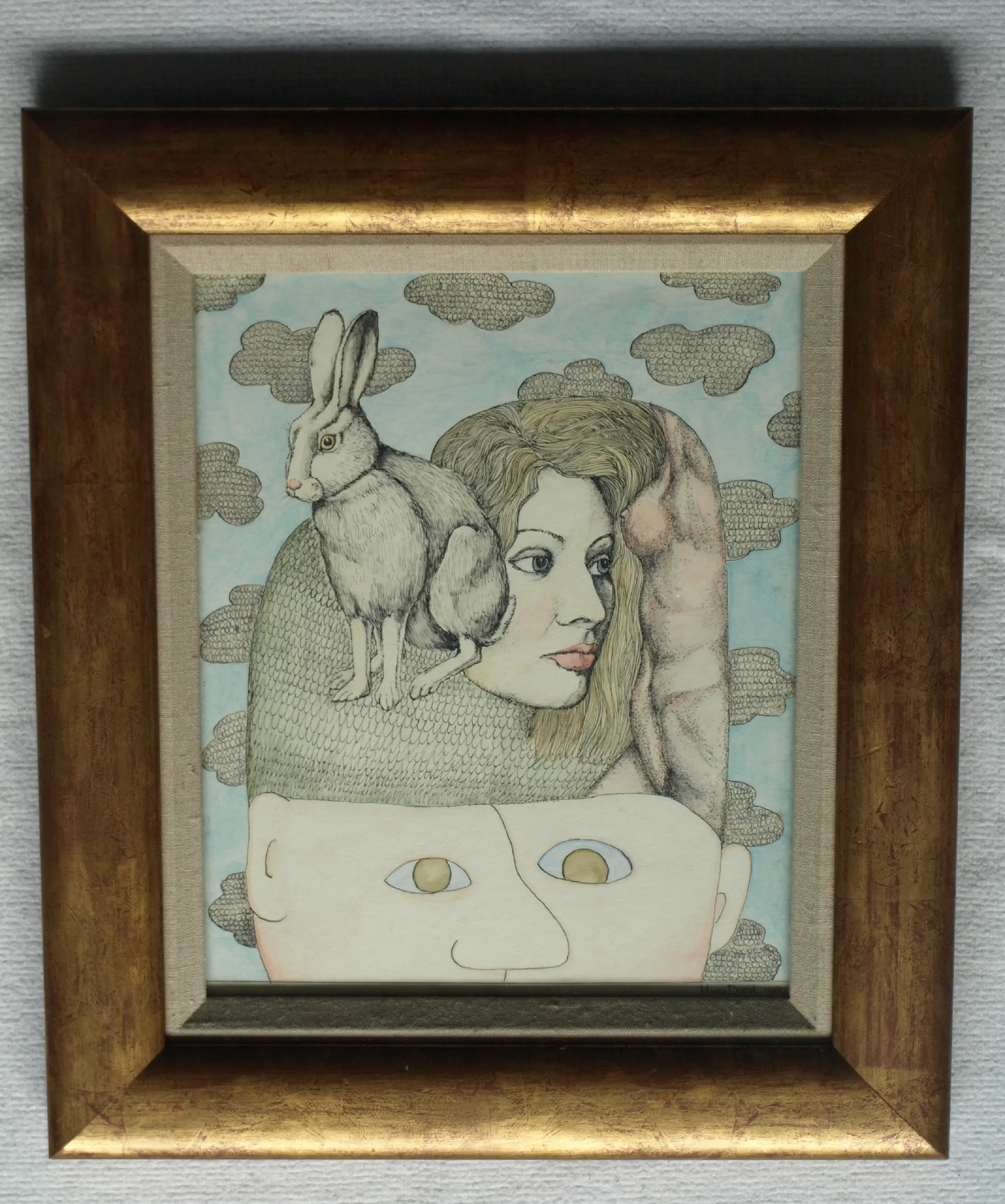 Henny van Diest - Ingelijst, Gemengde techniek, Vrouw met Konijn – Lijst, 39 x 34 cm - 1980