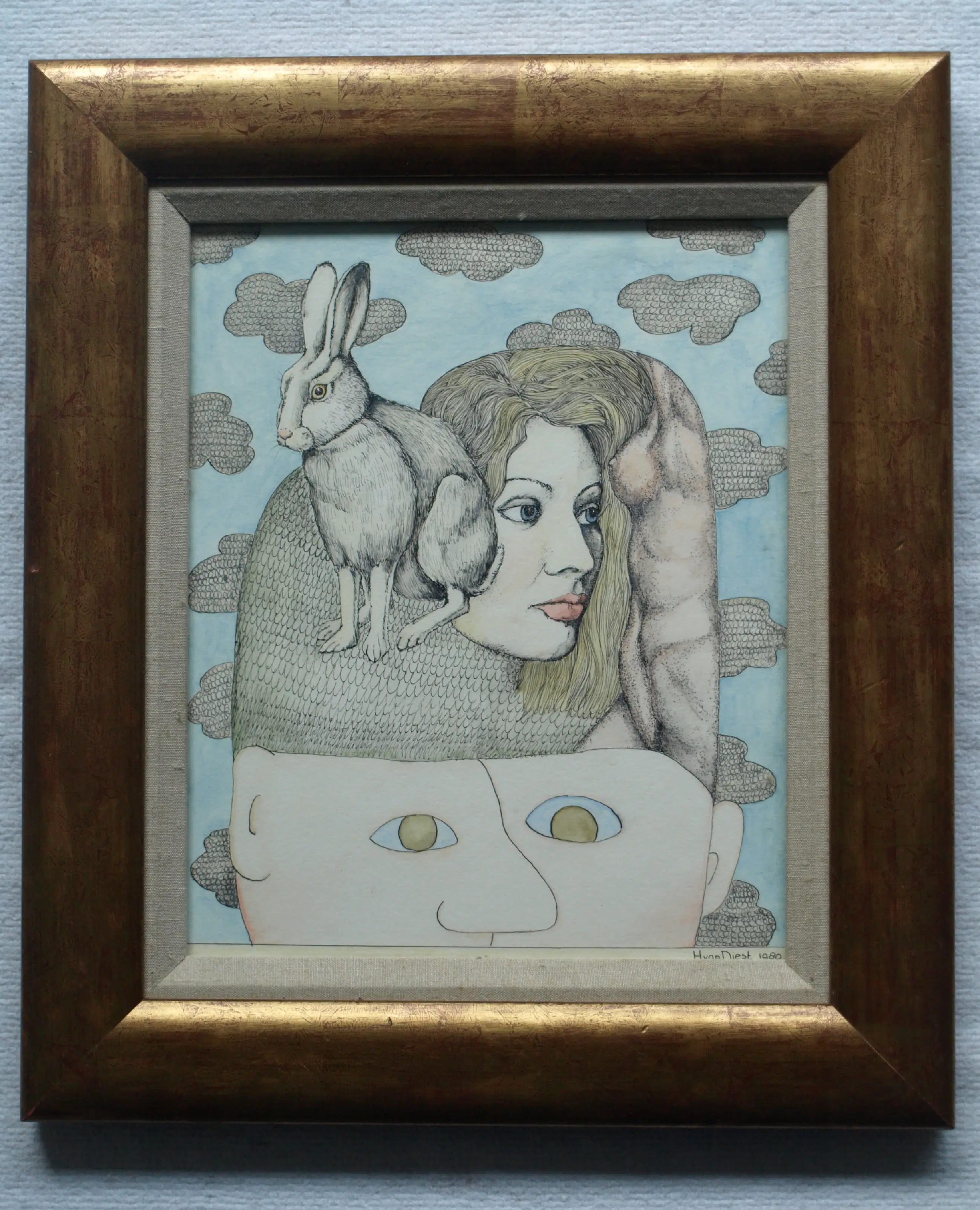 Een schilderij uit 1980 van de Haagse kunstenares Henny van Diest (1948-). -Gemengde techniek: Inkt en (kleur)potlood. -Gesigneerd en gedateerd rechtsonder. -Ingelijst in een houten lijst met glasplaat. -Afmetingen: Lijst, 39 x 34 x 2 cm. Beeld, 27 x 22 cm. -Herkomst: Uit een inboedel met meerdere werken van deze kunstenares. -Conditie: In zeer goede staat. De houten lijst heeft slijtplekjes. Zie ook de foto’s voor een eigen indruk. Kan zo aan de muur.