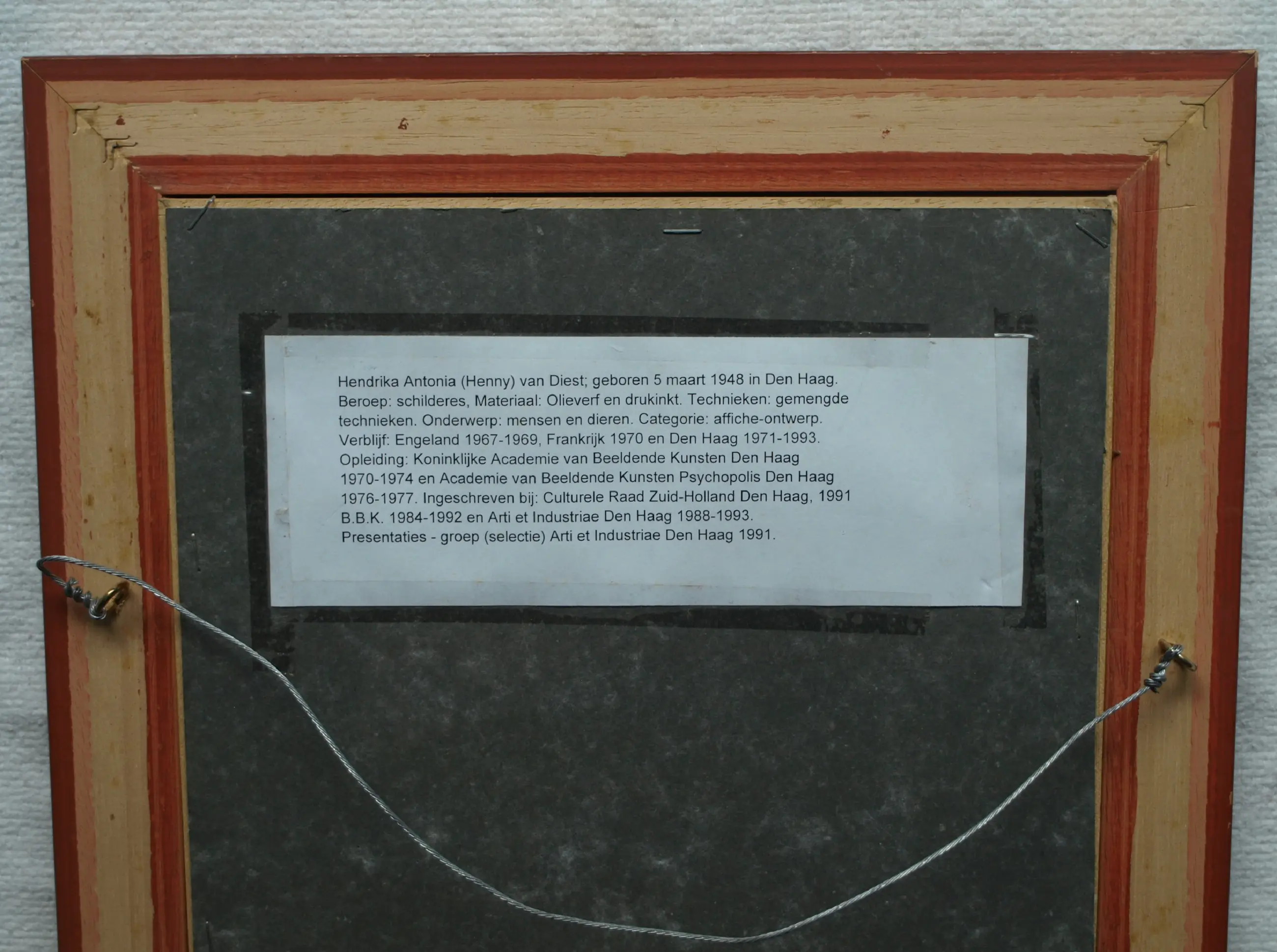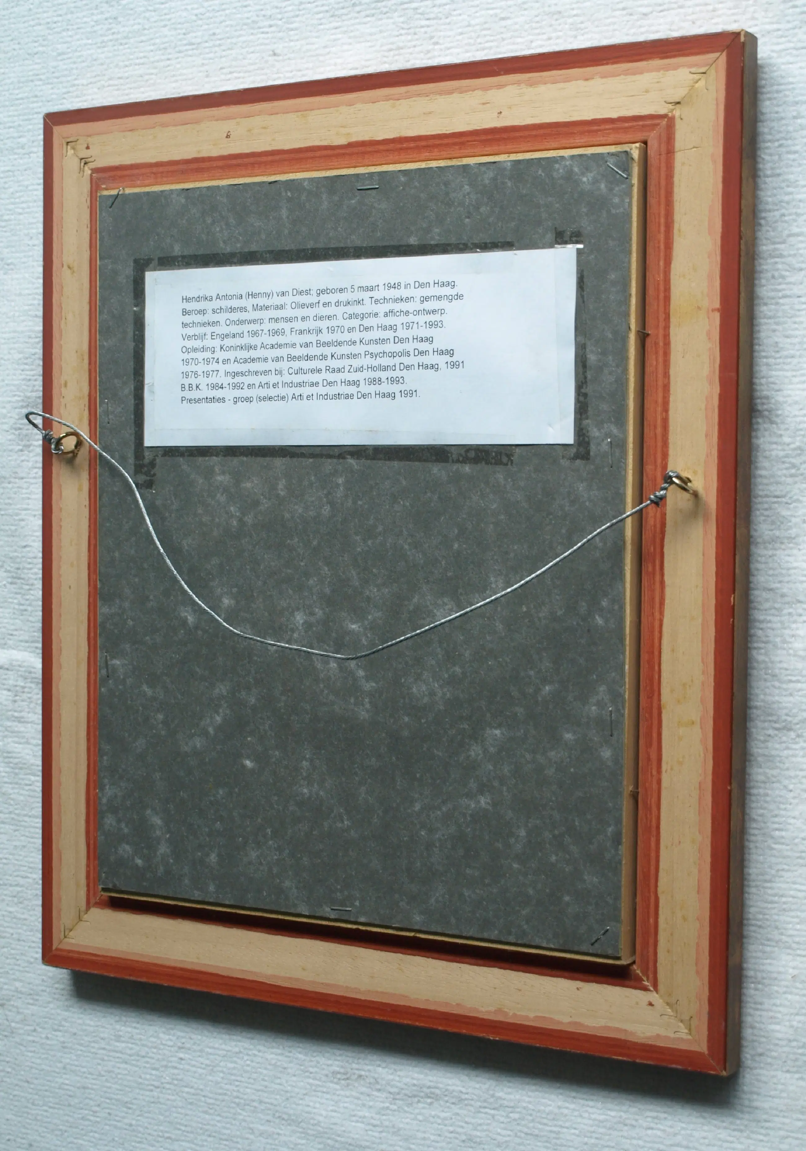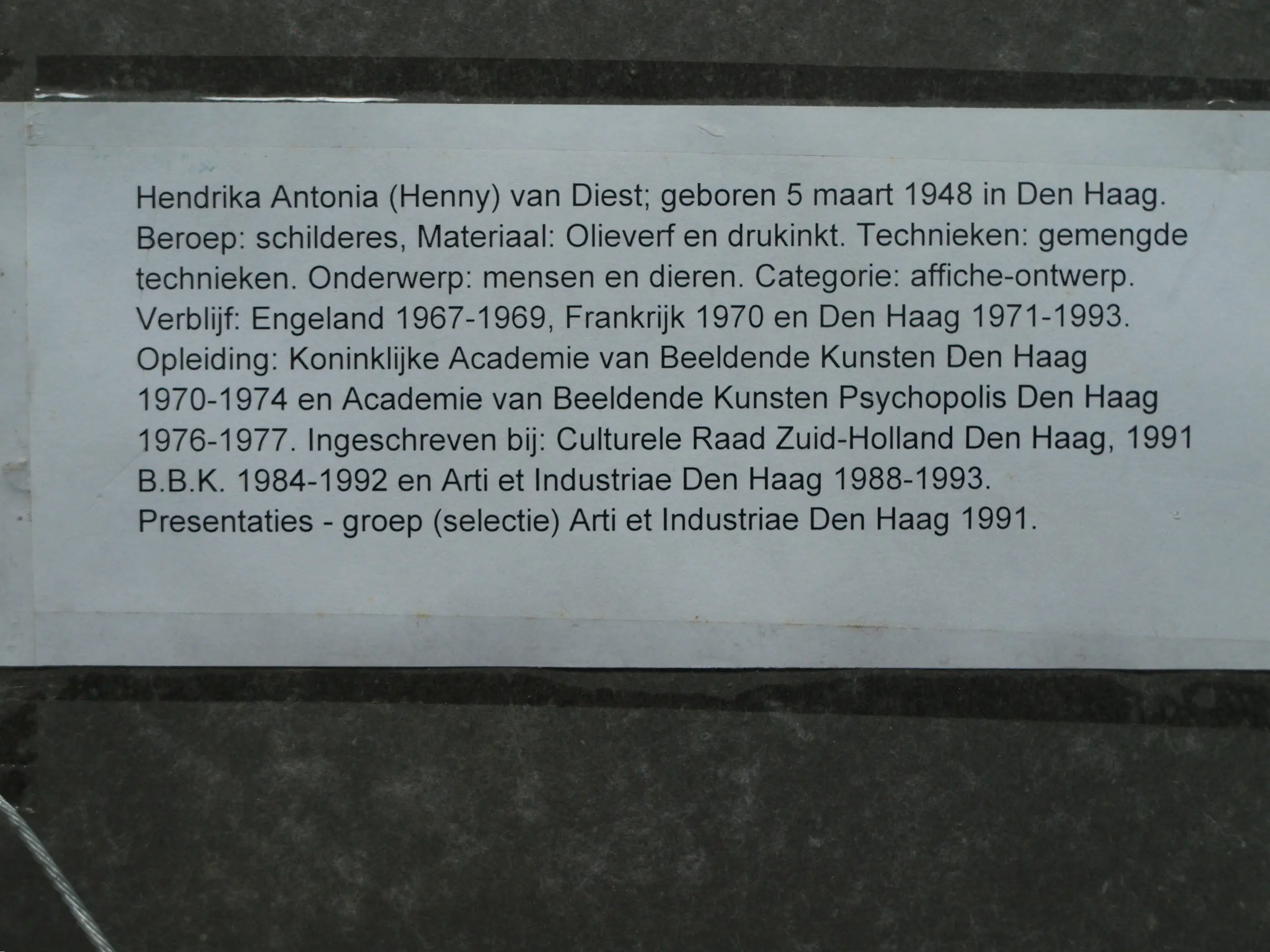 Informatie over de kunstenares: Hendrika (‘Henny’) Antonia van Diest (Den Haag, 5 maart 1948), schilder en ontwerper van affiches. -Opleiding: Koninklijke Academie van Beeldende Kunsten, Den Haag (1970-1974) en Academie van Beeldende Kunsten Psychopolis, Den Haag (1976-1977). Stijl: figuratief-expressionistisch.