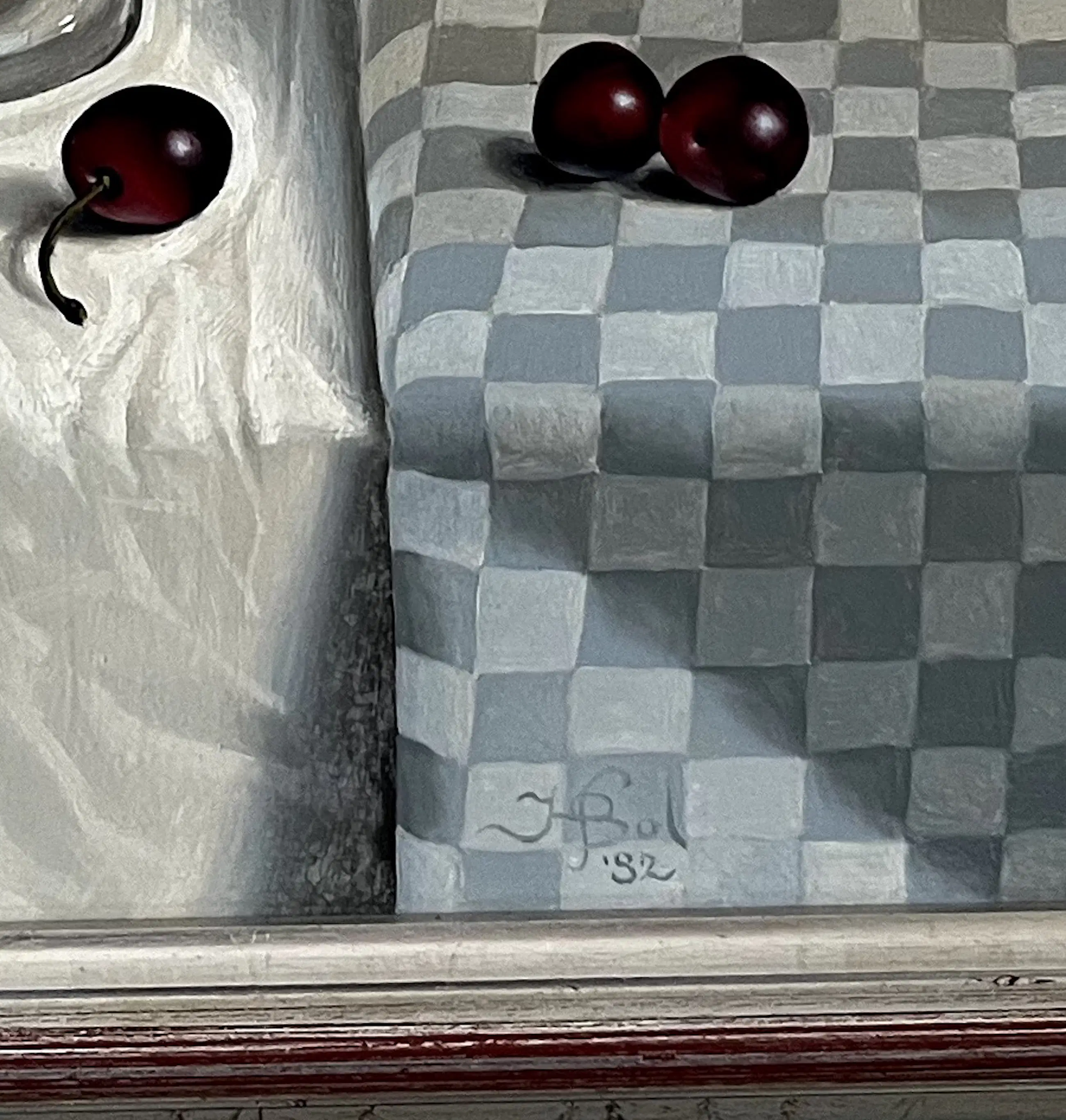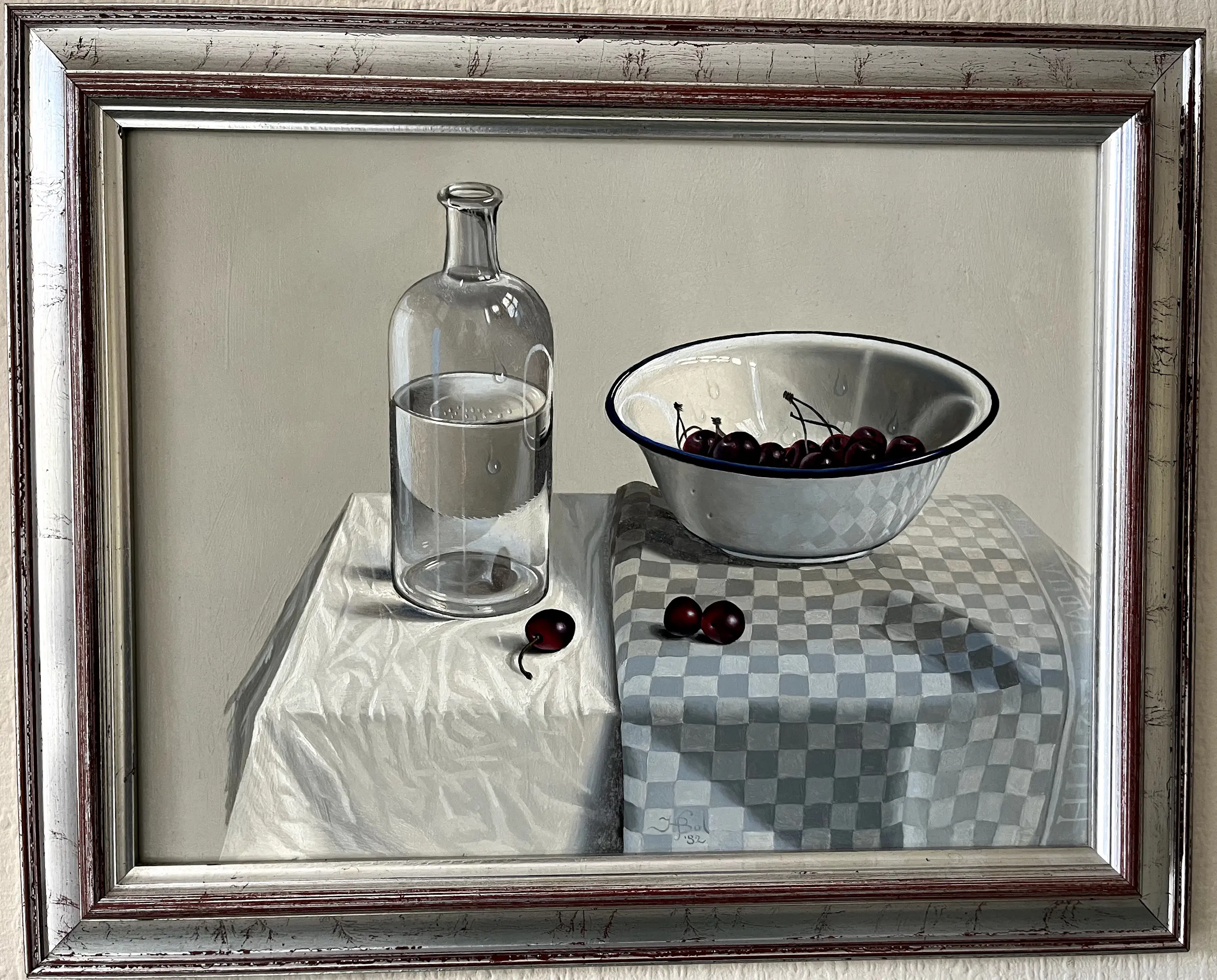 Stilleven van een met water gevulde fles en een schaal kersen. Olieverf op paneel, met mooie lijst.