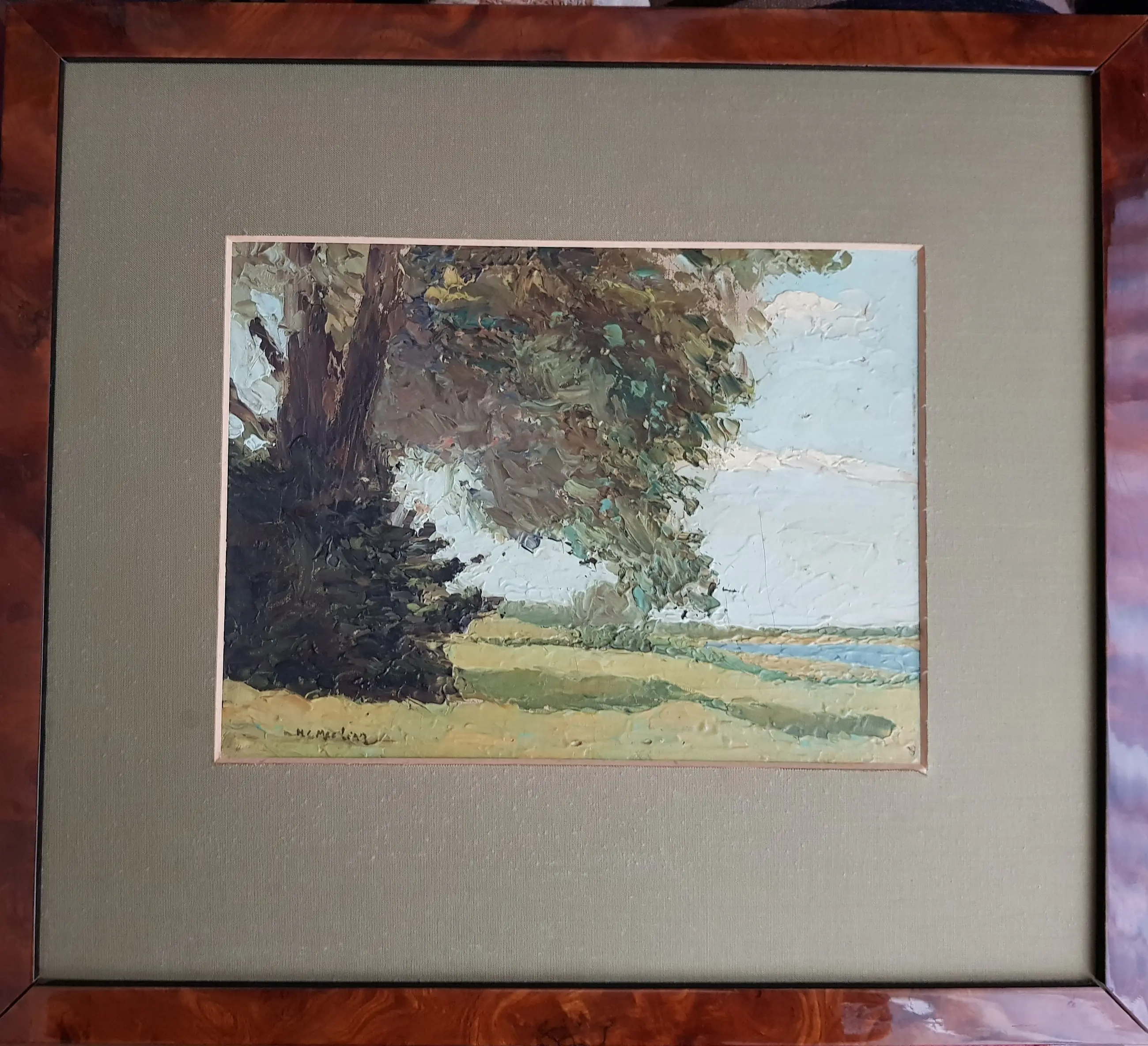 Een pasteus, impressionistisch geschilderd landschapje met boom, bosschage, velden en rivier - uit de periode 1935-1950.