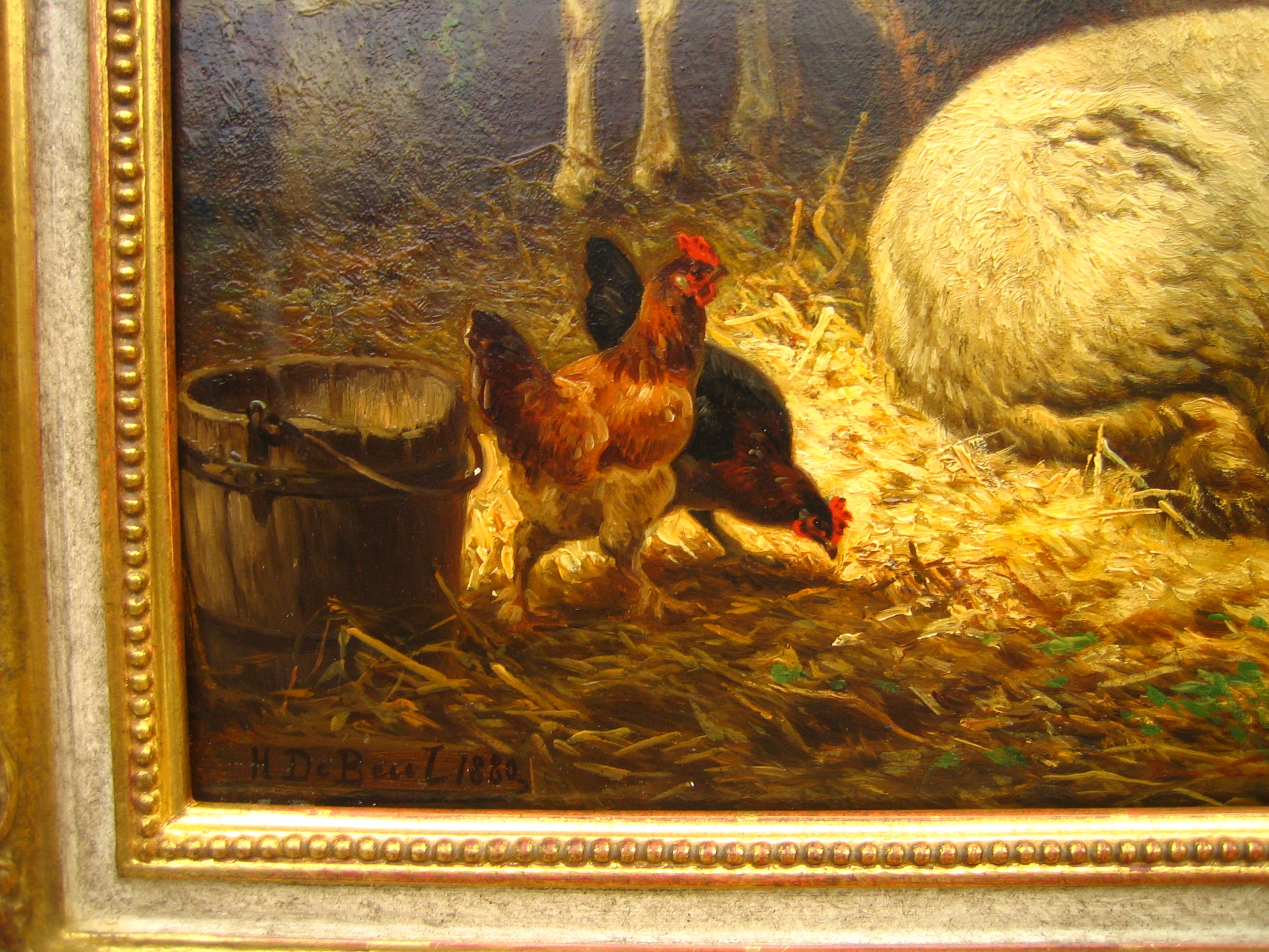 Schilderij van oude vrouw in schapenstal met scharrelende kippen.Het is geschilderd op een afgeschuind massief mahonie massief en geplaatst in een fraaie originele lijst. Schilderij verkeert in zeer goede staat.