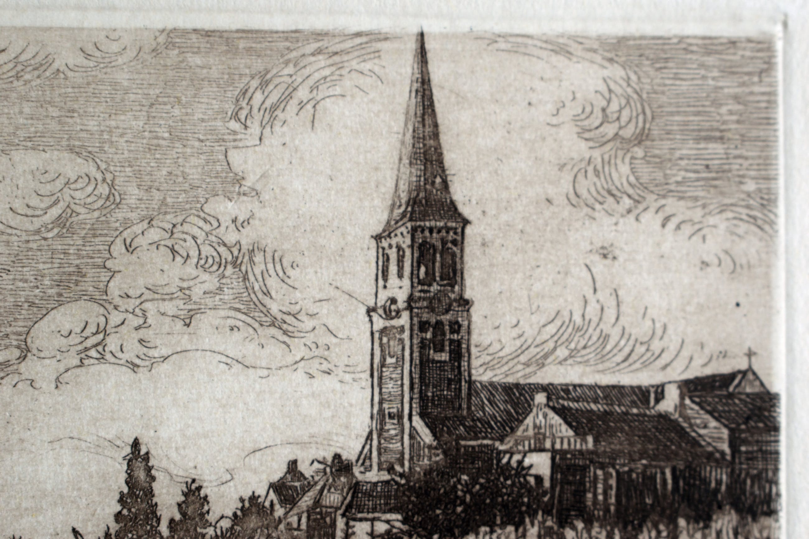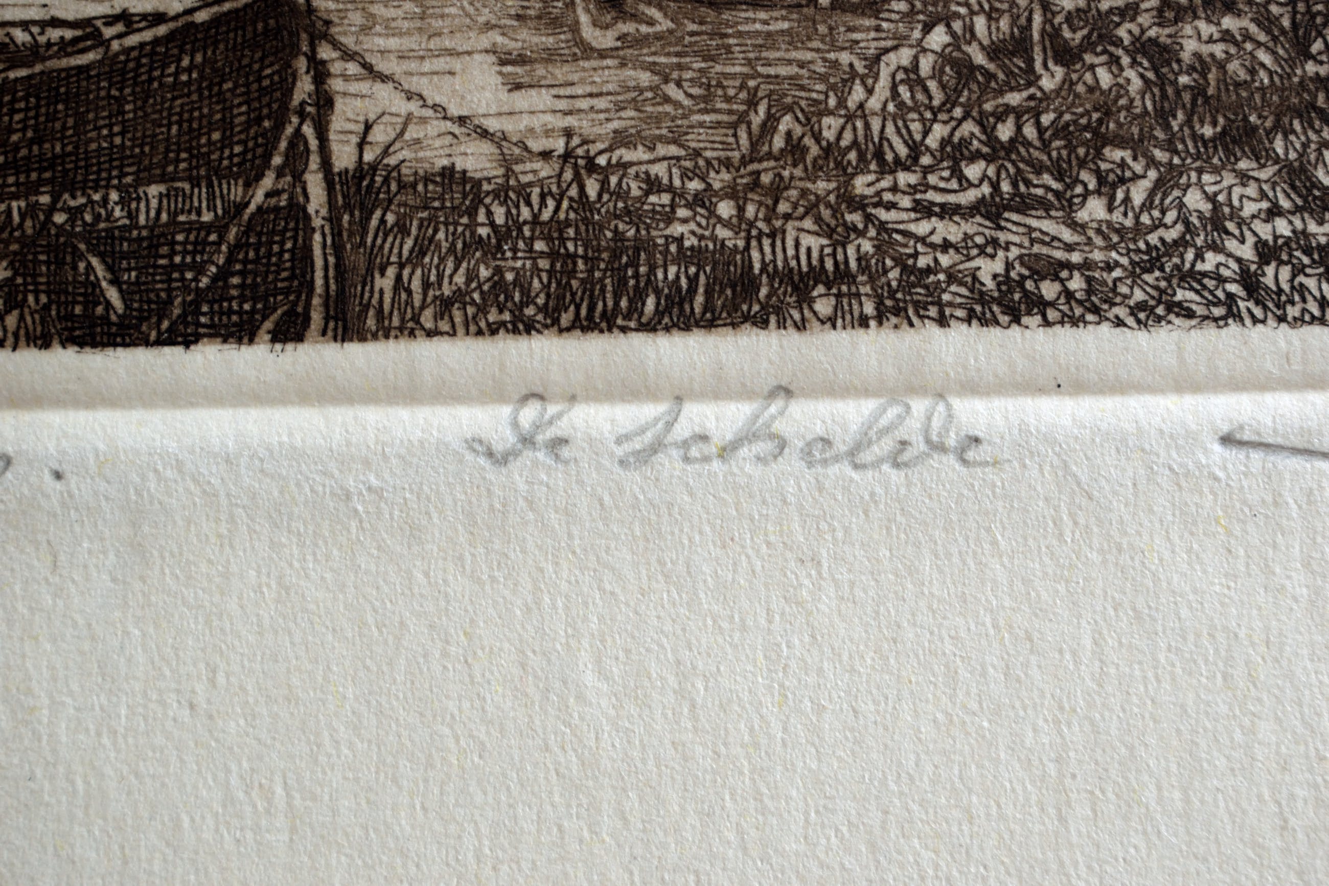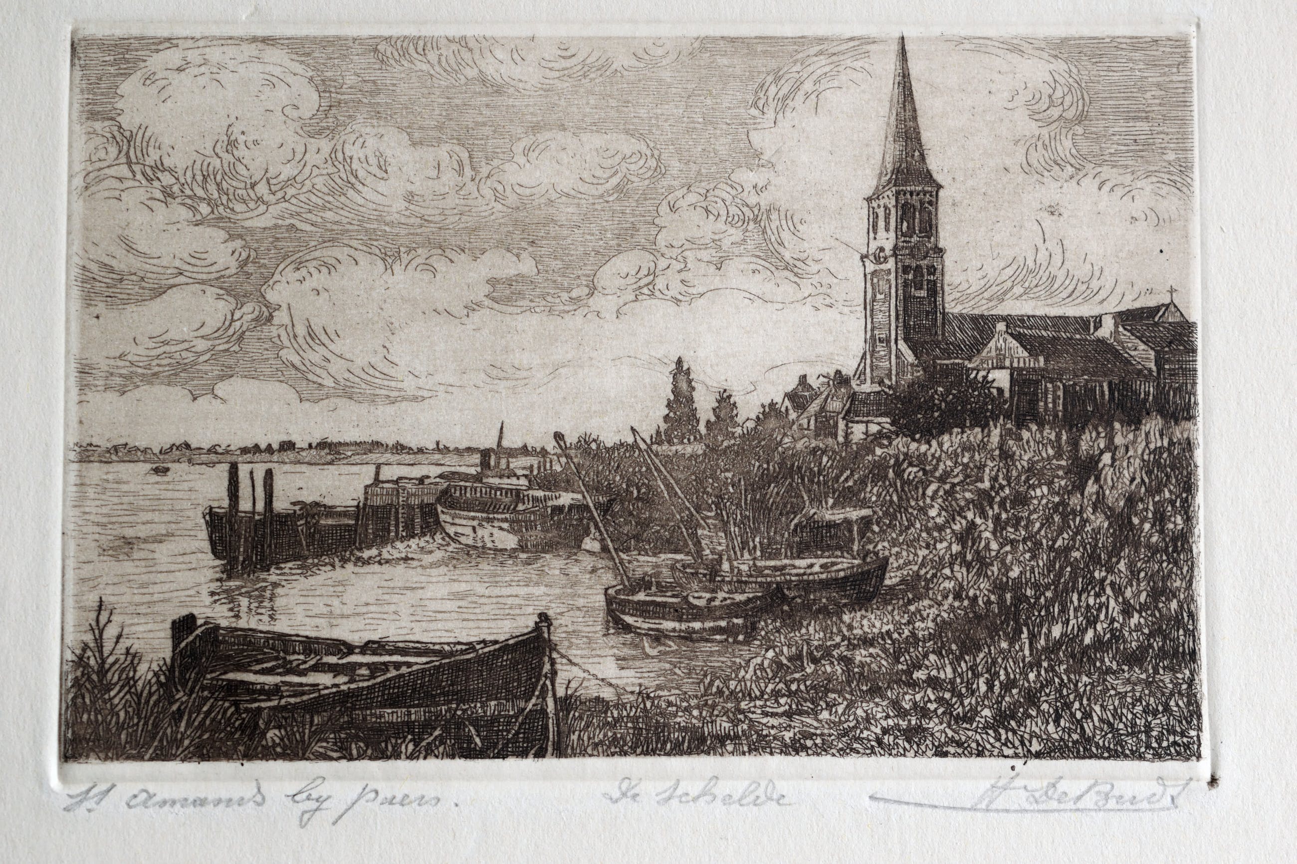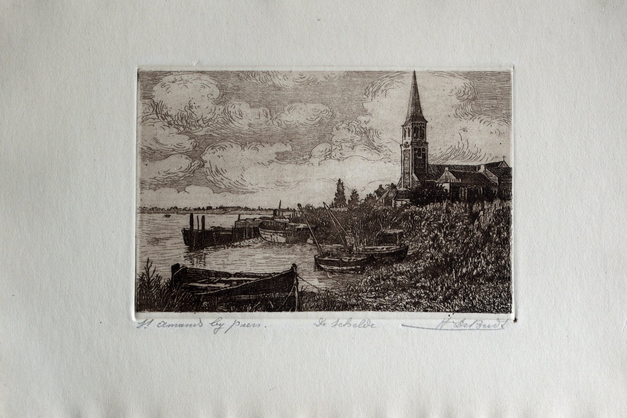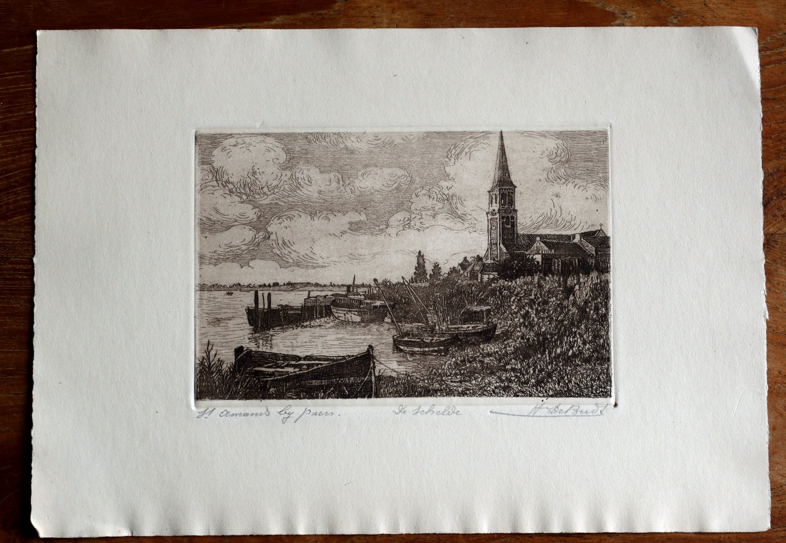Mooie ets van Henri De Budt. Deze Belgische kunstenaar maakte veel kunstwerken rondom de rivier de Schelde. Deze ets is gemaakt aan de scheldeoever van het plaatsje Sint Amands bij Puurs.Benoemd als: ST Amands bij Puurs - De Schelde Niet genummerd, oplage onbekend. Was ook onvindbaar op internet. Papiermaat: 17.5 x 25.3 cmMaat voorstelling : 9.8 x 14.4 cm