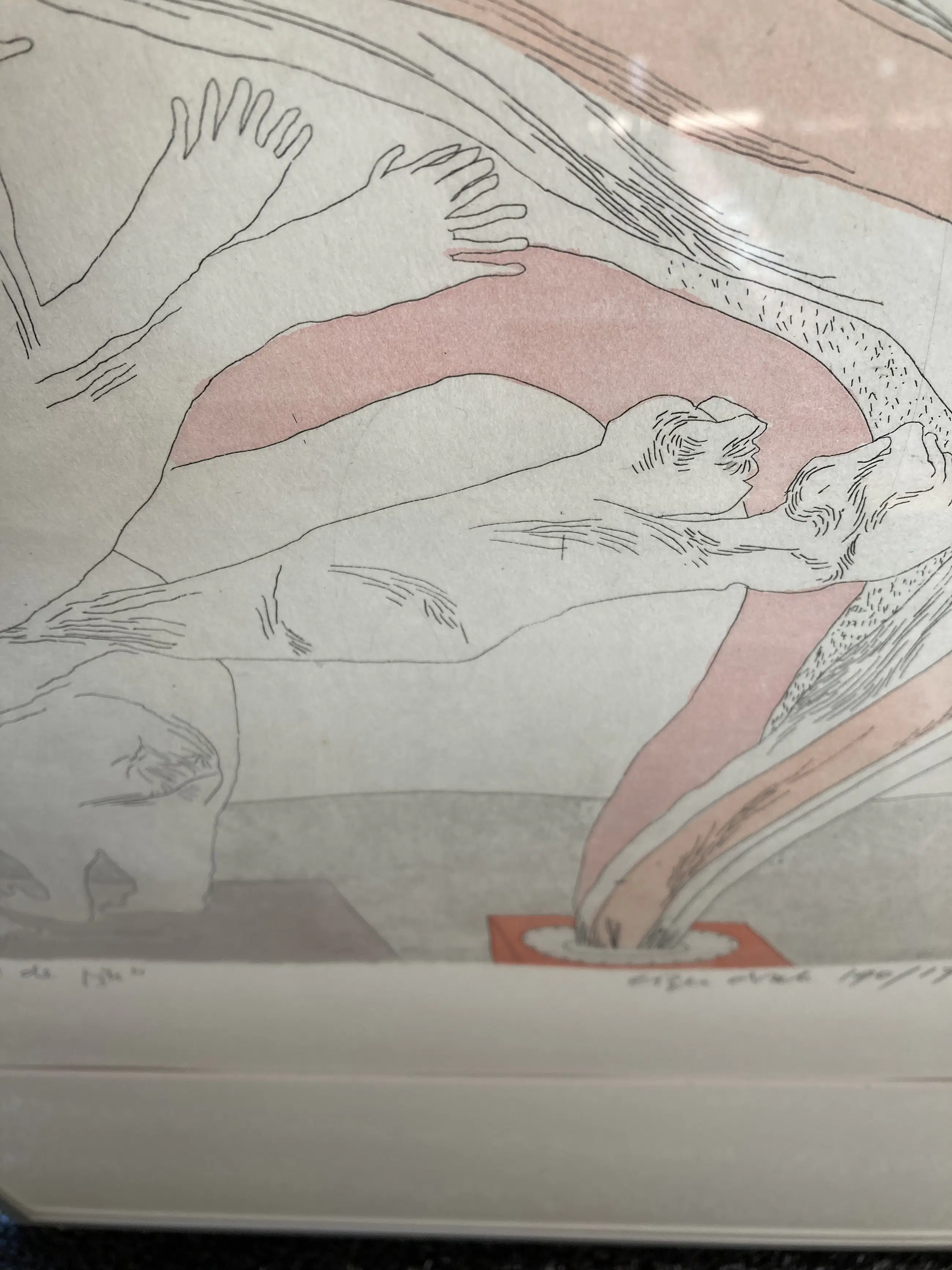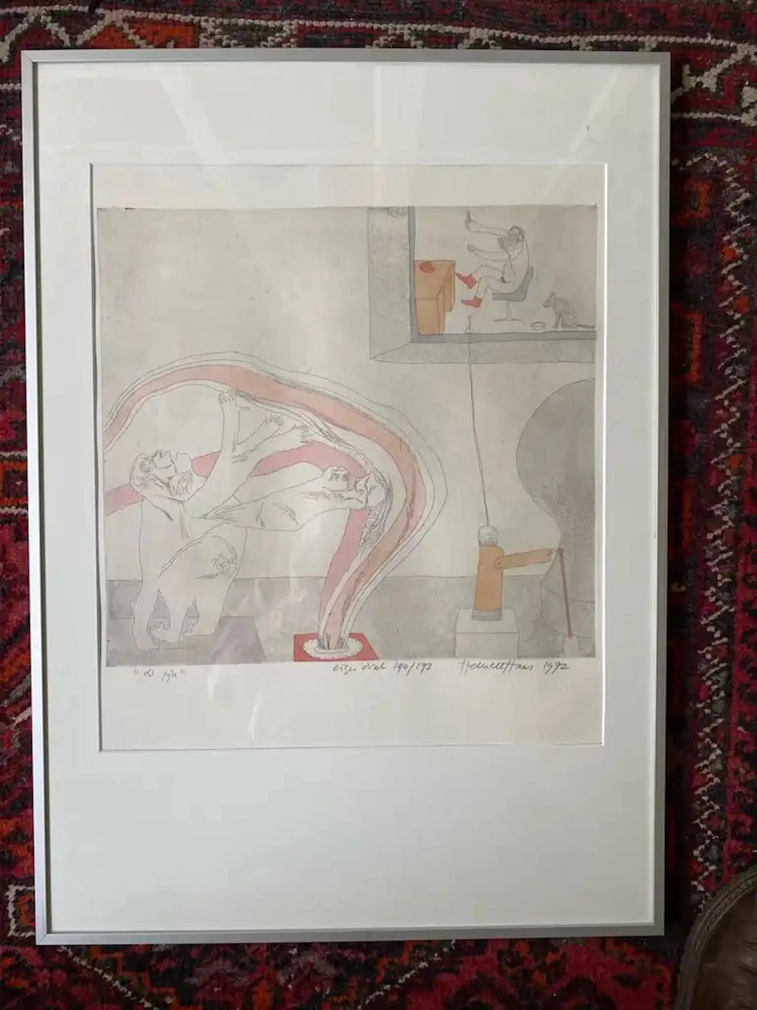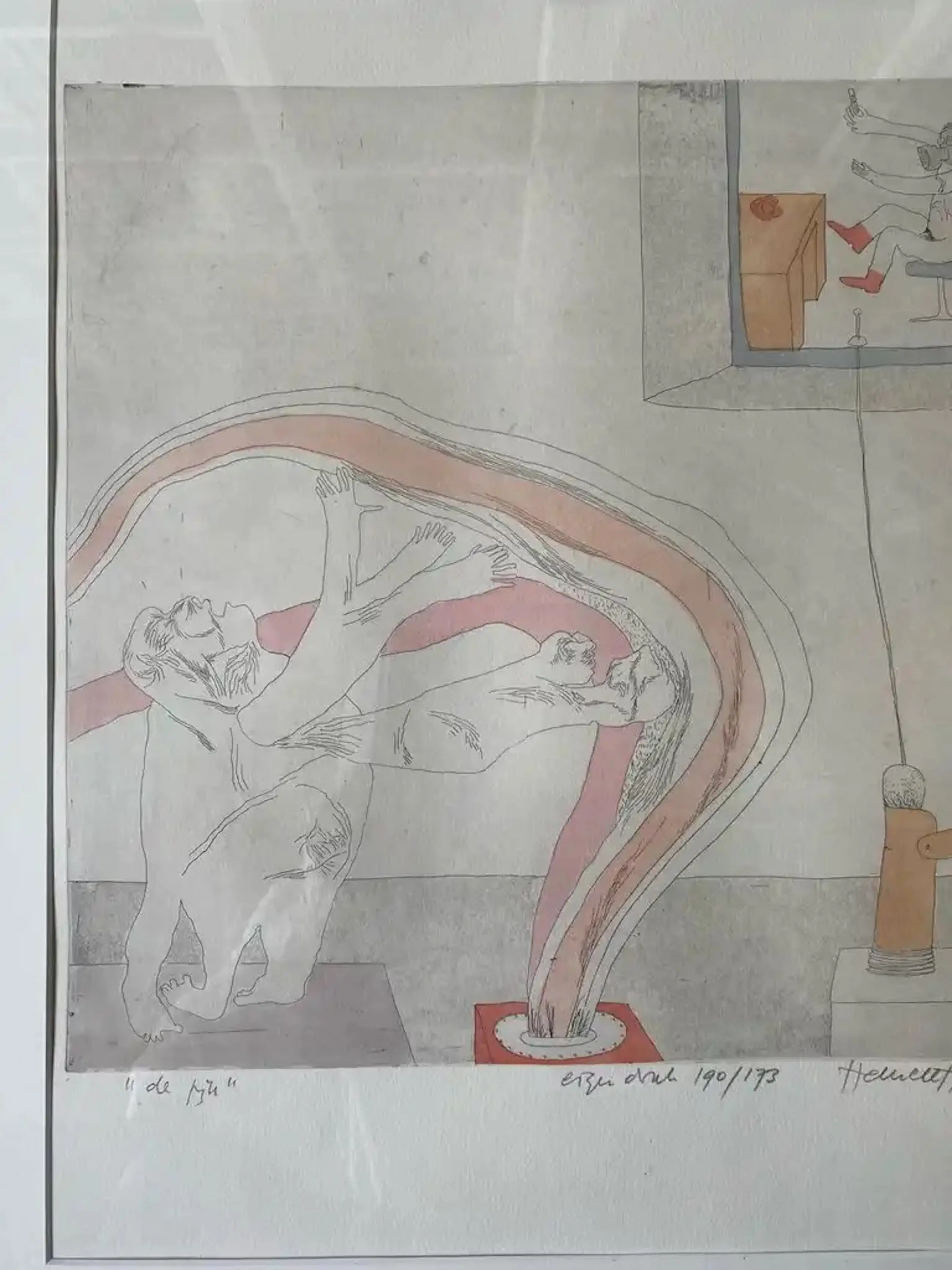 Originele litho van Henri de Haas, getiteld 'De Pijn', gemaakt in 1972. Het werk is handgesigneerd en genummerd 190/173. De litho is ingelijst in een aluminium lijst en de afmetingen van het blad zijn 71 x 51 cm. Een bijzonder en expressief werk van deze bekende graficus.