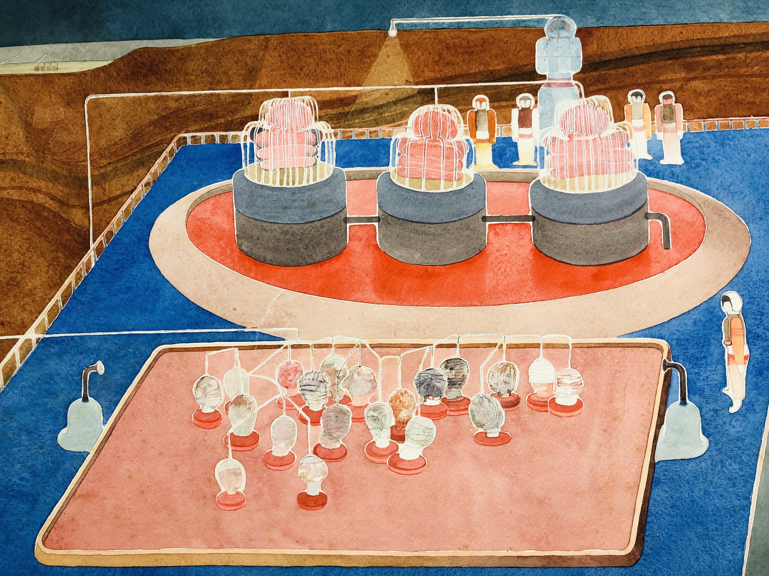 Aquarel is goed in de witranden wat ouderdomssporen. Ook nog papiertape in beeld van de uiterste randen. Hiermee spande de kunstenaar het aquarelpapier op om het strak te krijgen. Bij gebruik van een nieuw passe partout valt dit volledig weg.