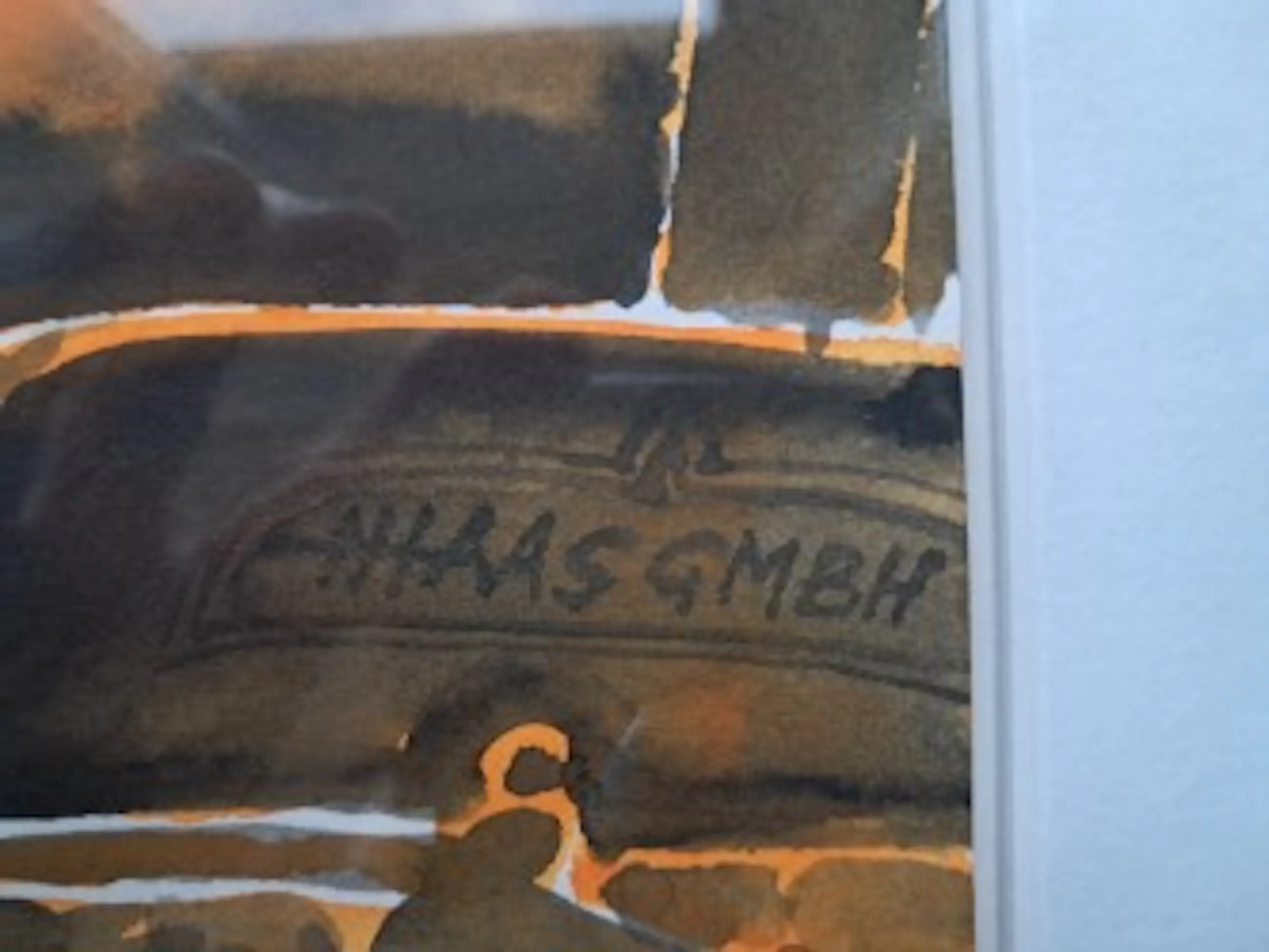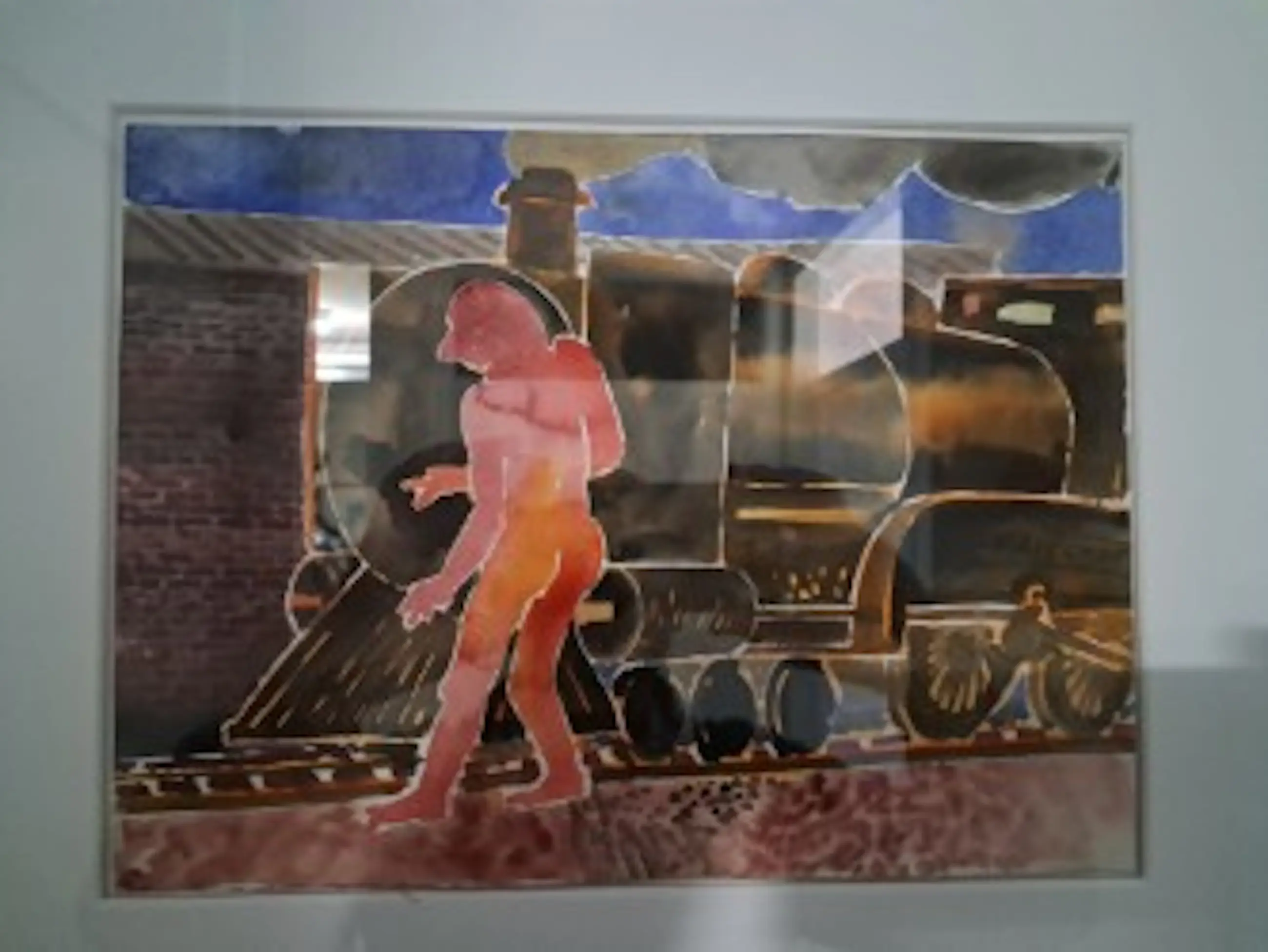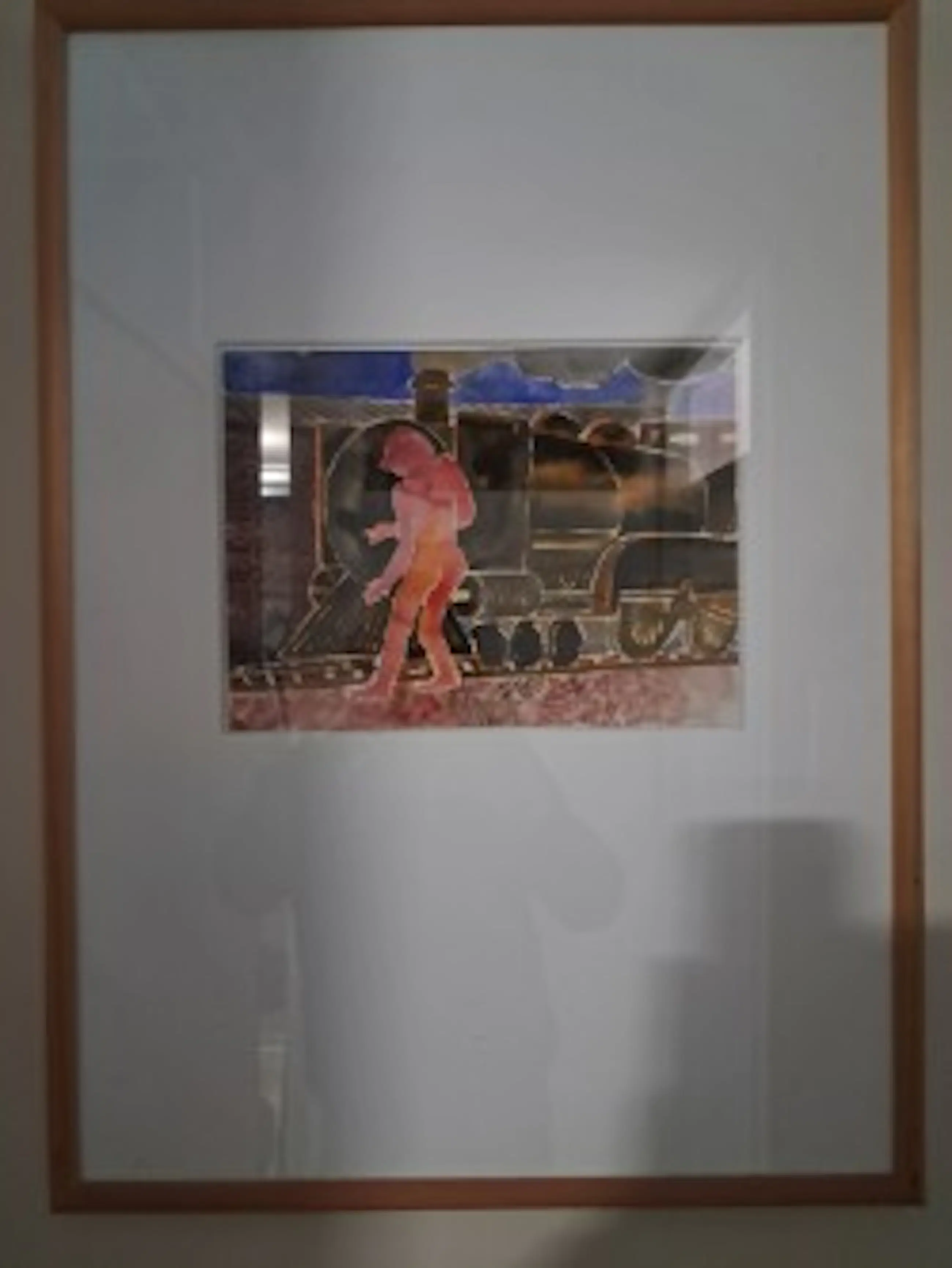 Tekst de Haas: 'In de tweede wereldoorlog zag ik mensen kolen rapen langs de spoorbaan. De locomotief met zijn volle tender liet nogal eens een brok cokes vallen. Kolen rapen is eigenlijk een oud gegeven, al sinds de begintijd van het spoor bestaat het. En dat valt natuurlijk samen met de industrialisatie en de opeenhoping van mensen en de armoe die er was.' Een bijzondere aquarel met een verhaal.