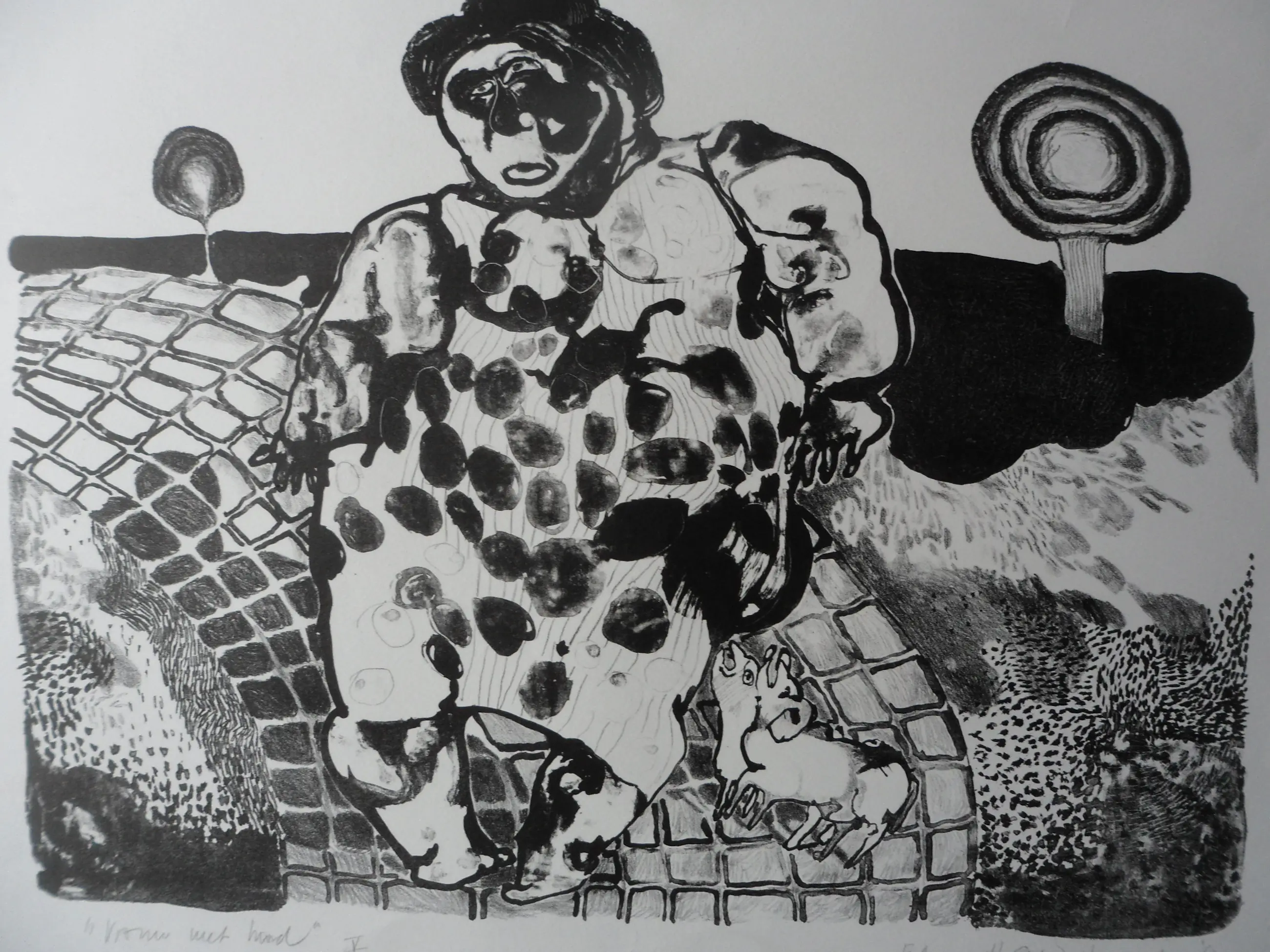 Litho van Henri de Haas. Titel: Vrouw met hond V. Nummer: EA. Jaar: 1968. Afmetingen blad: H57 x B76, cm. Het werk is rechtsonder, met potlood, gesigneerd door de kunstenaar.