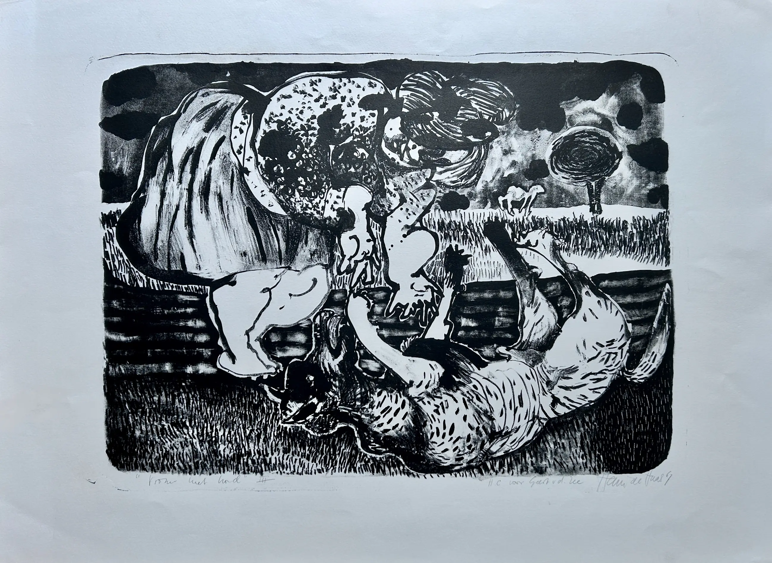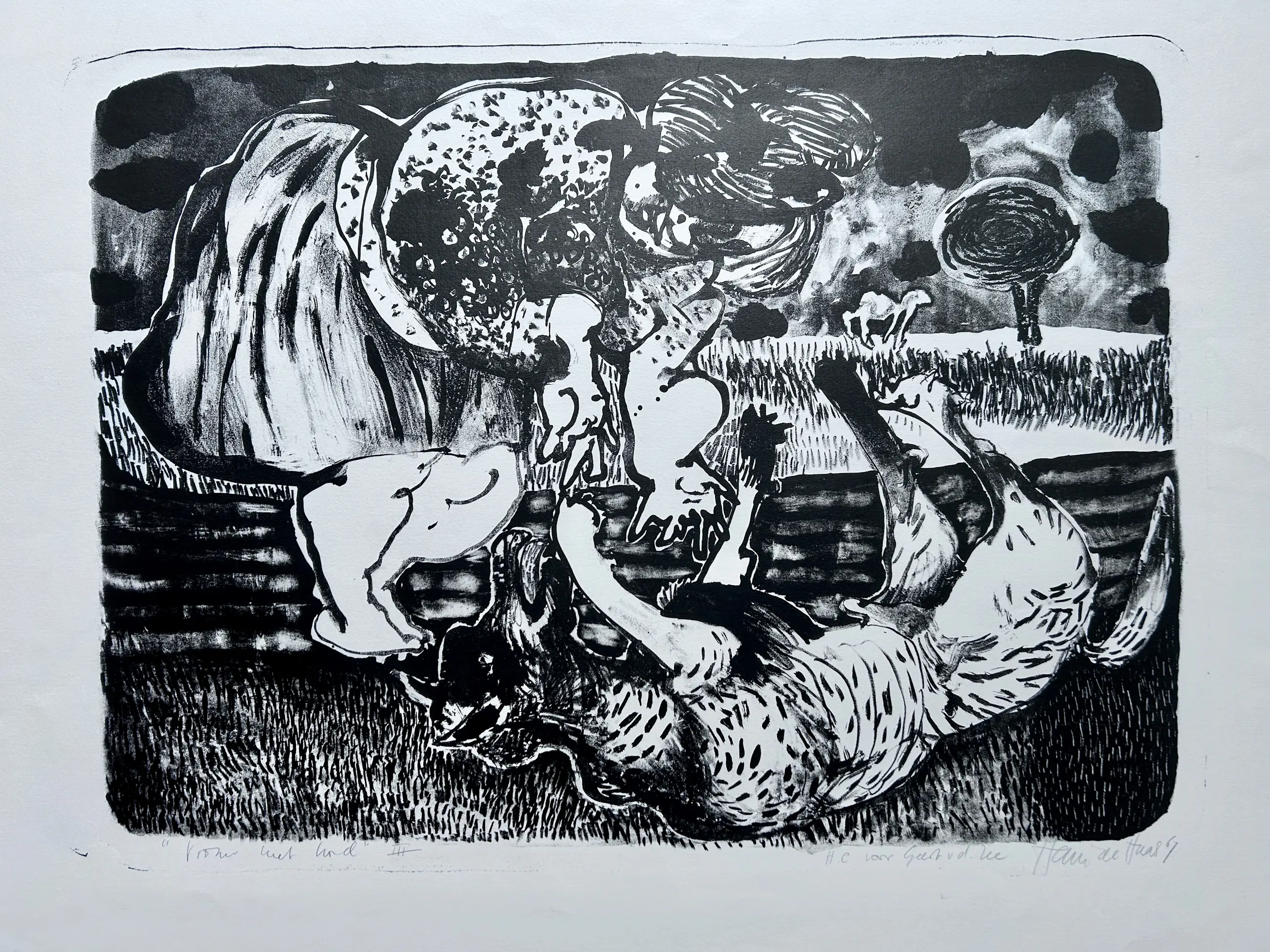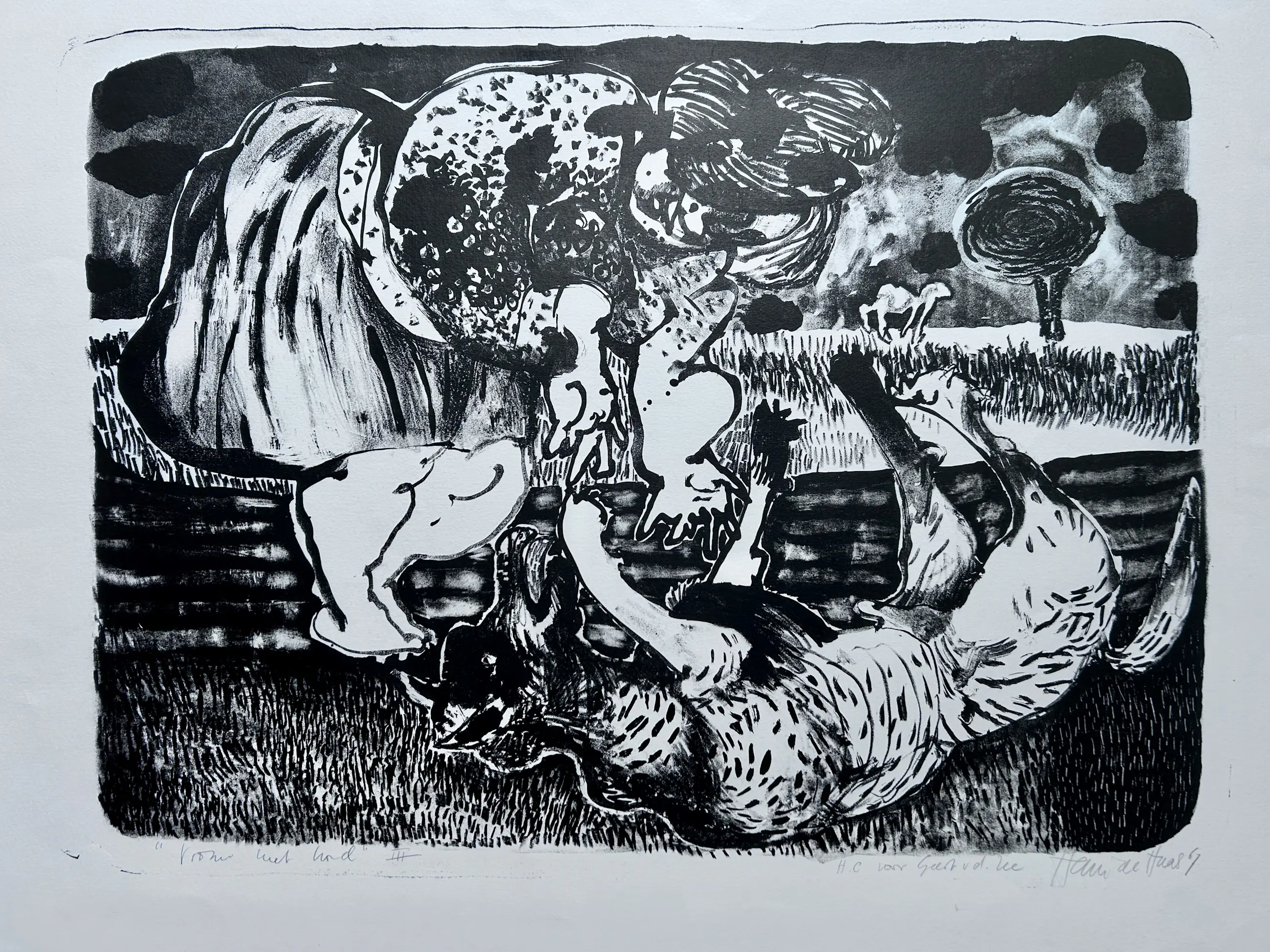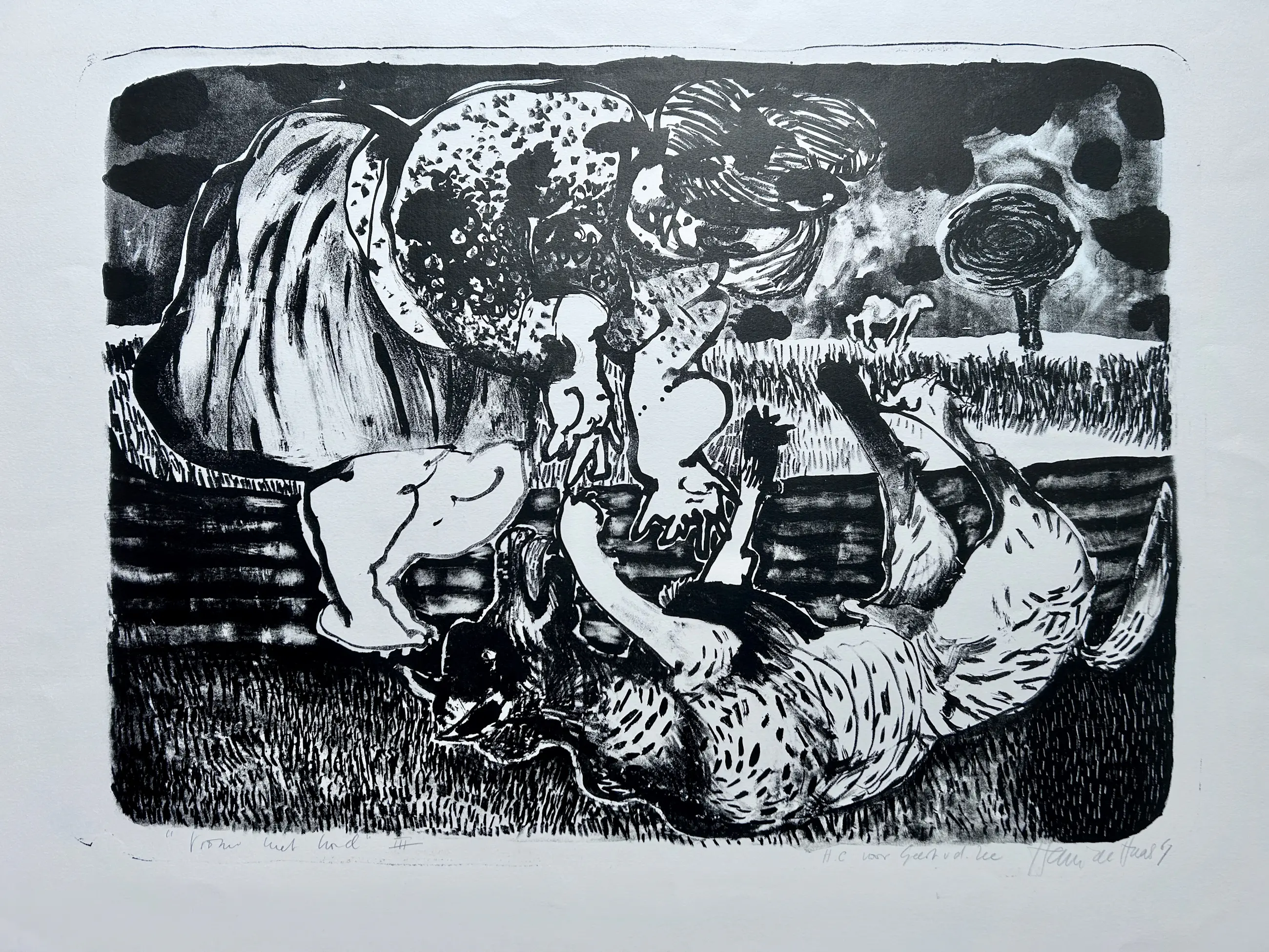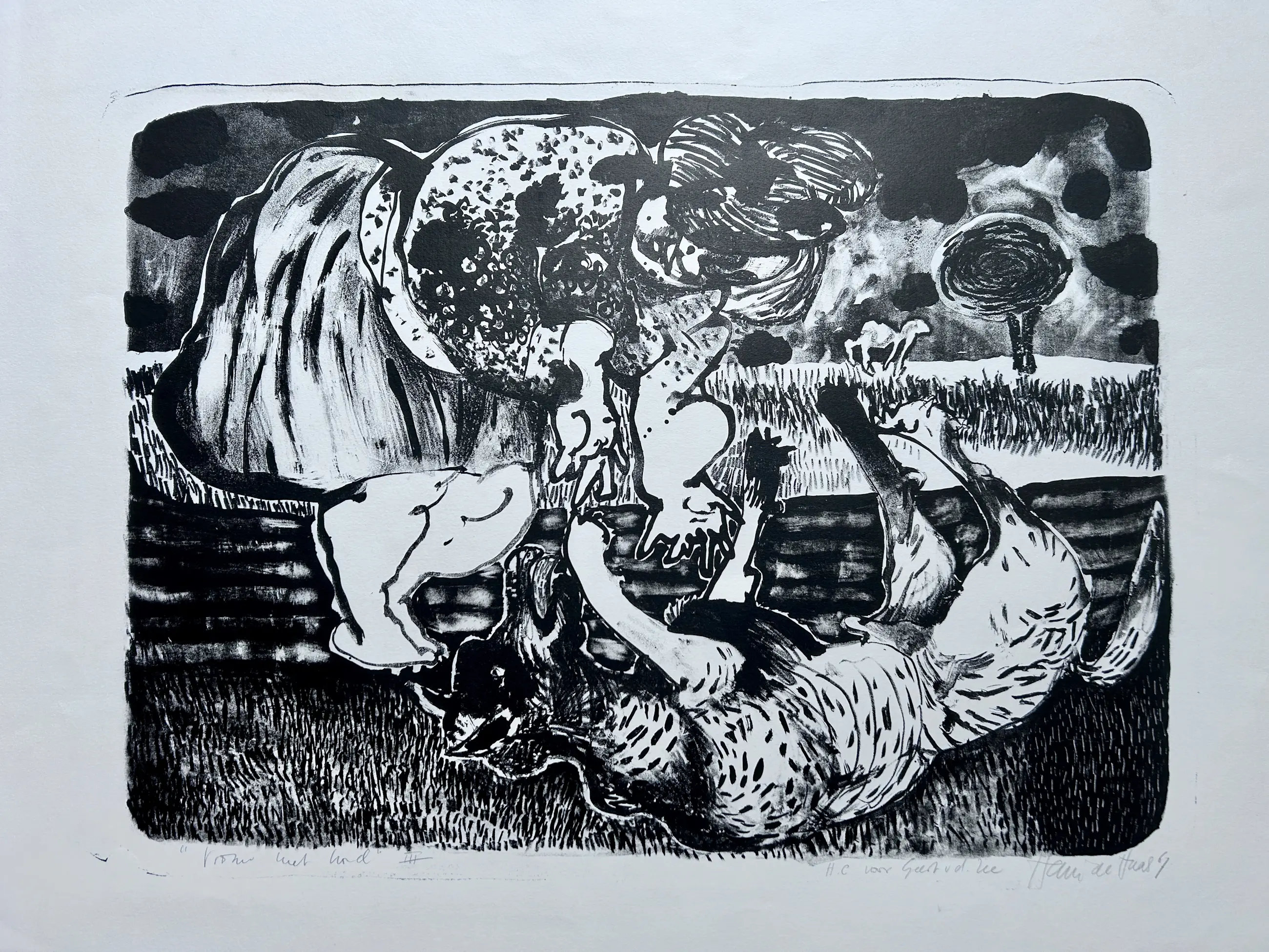 Conditie: zeer goed, vel heeft deukjes, zie foto's. Oplage: H.C. Afmeting: afbeelding 43 x 56 cm. Wordt zorgvuldig verpakt en verzekerd verzonden.