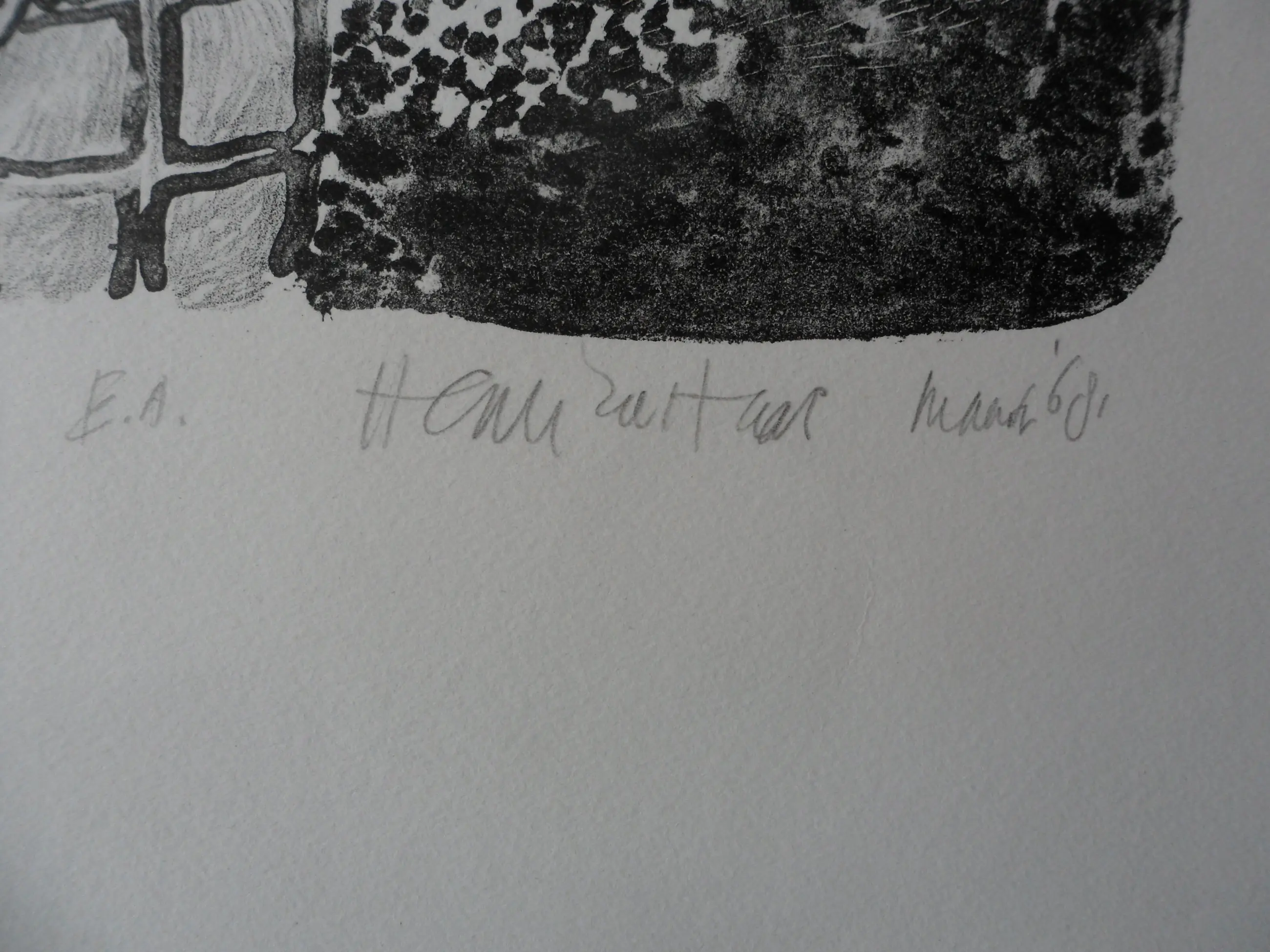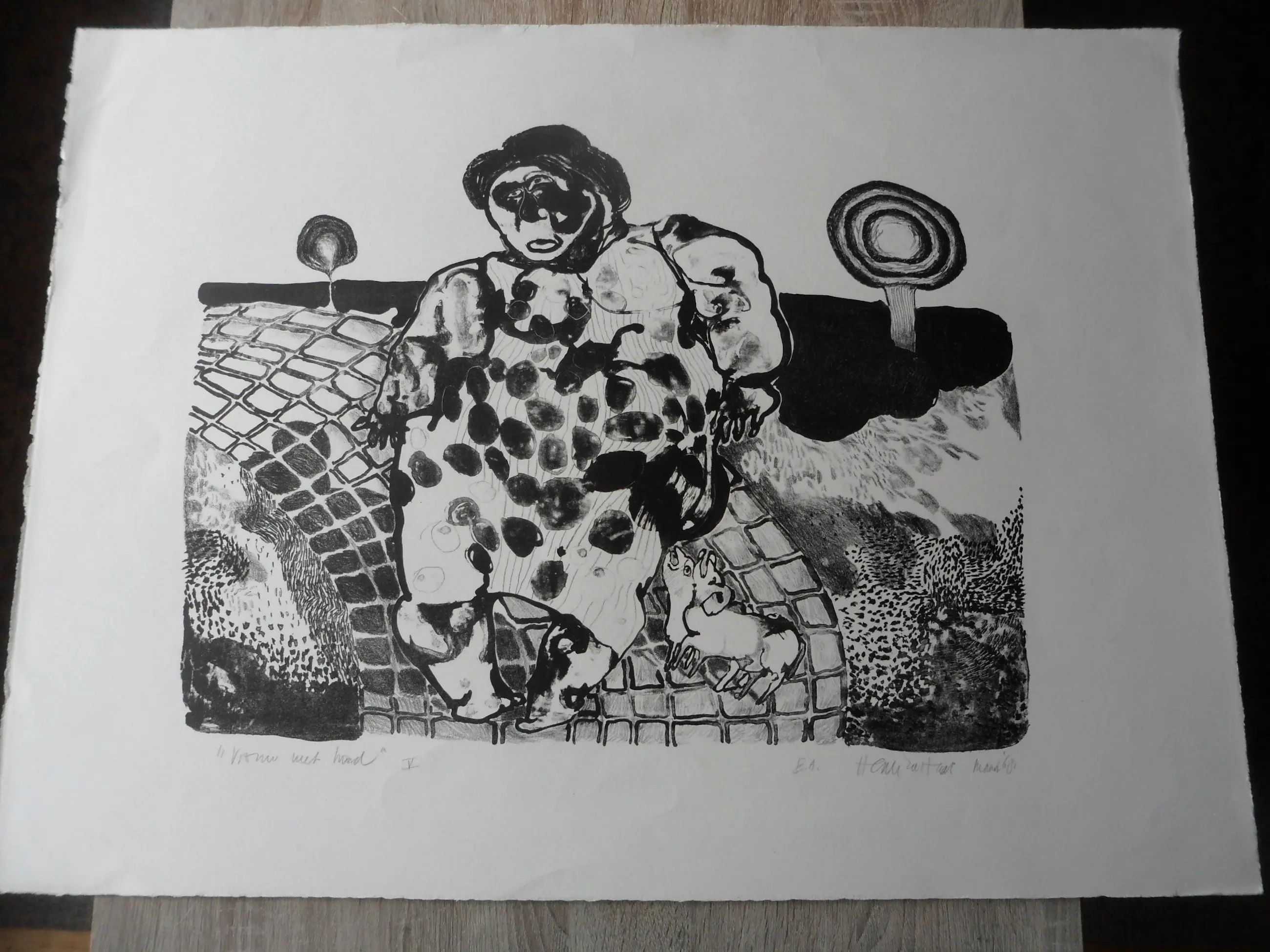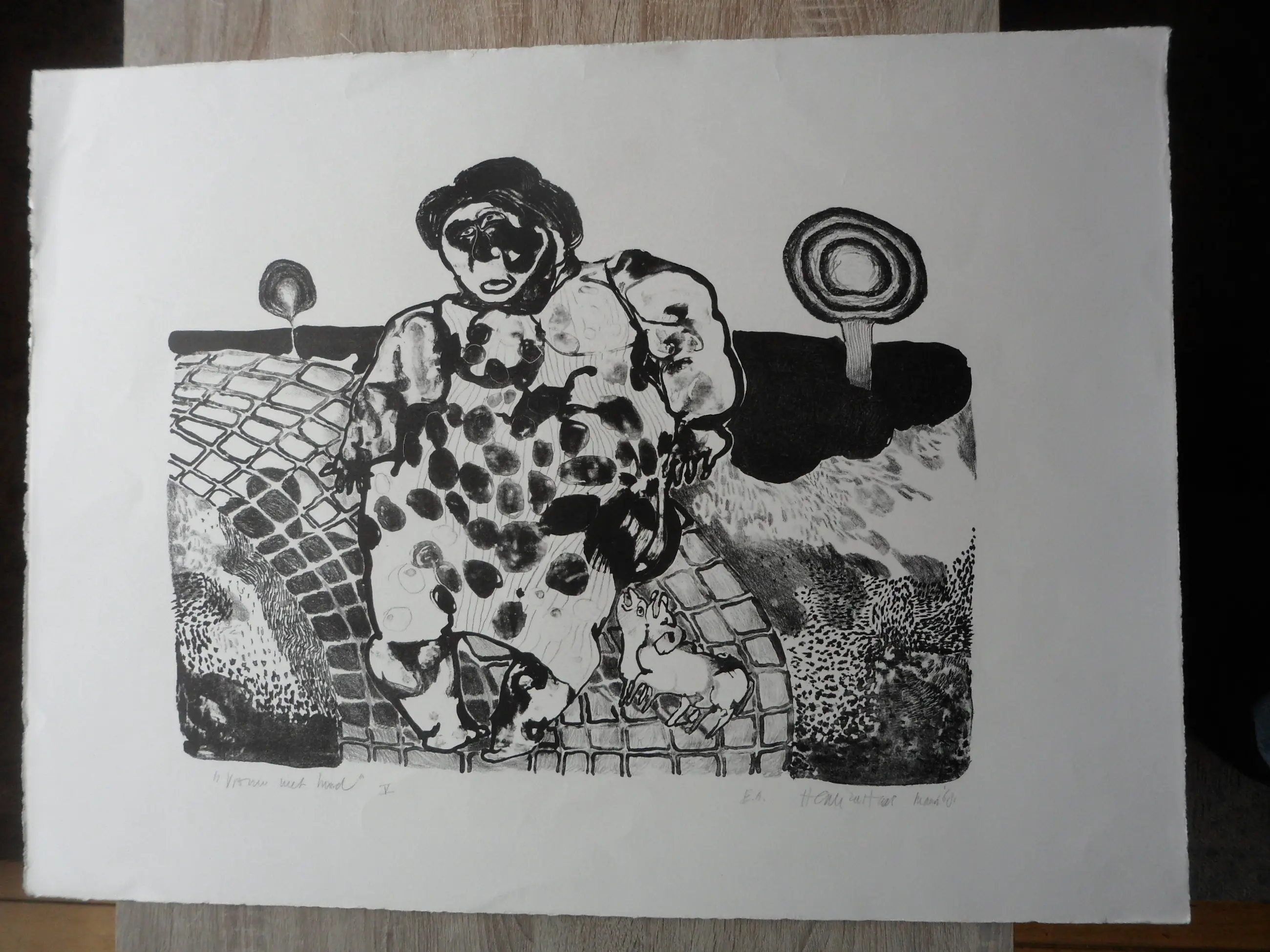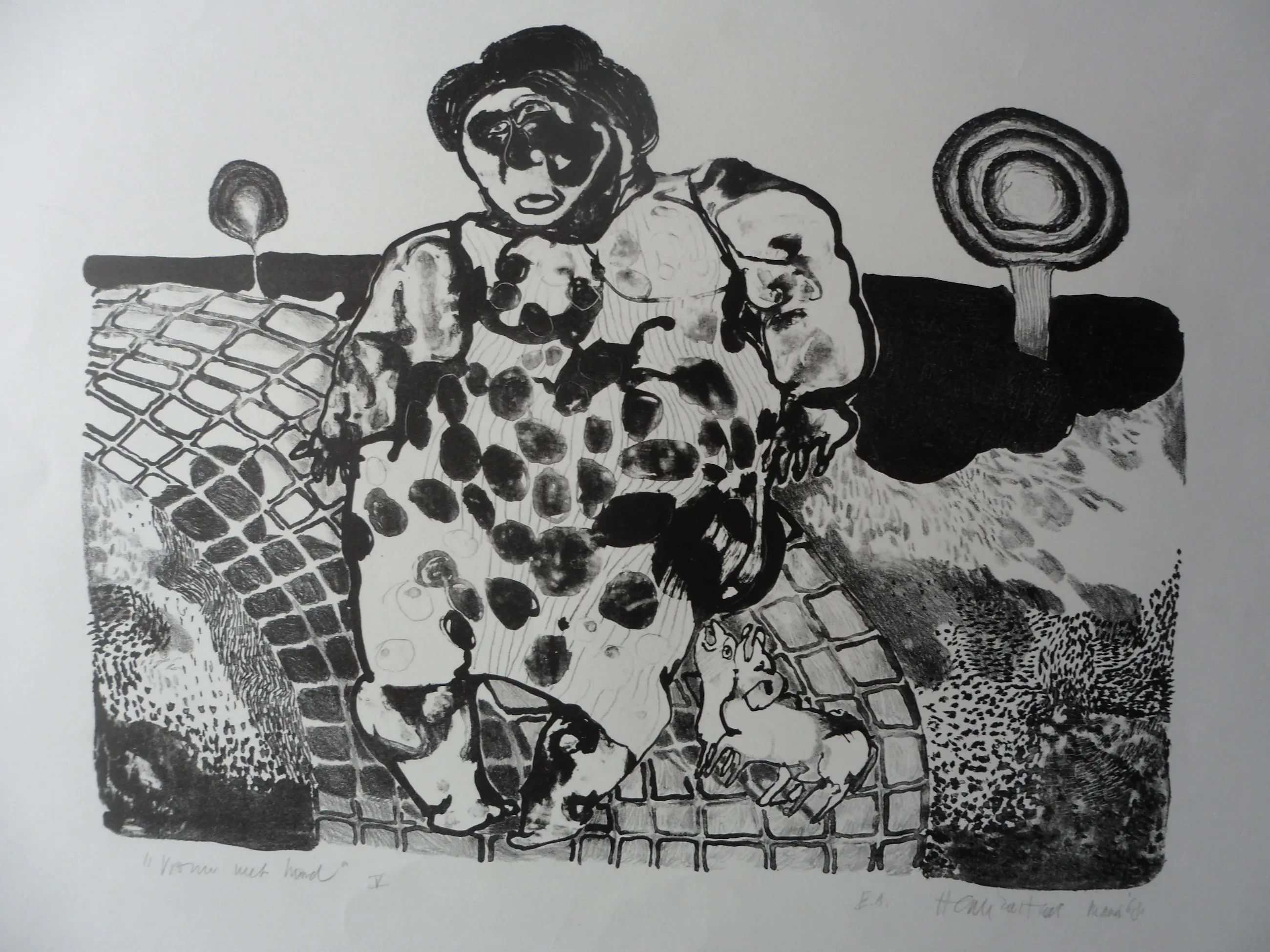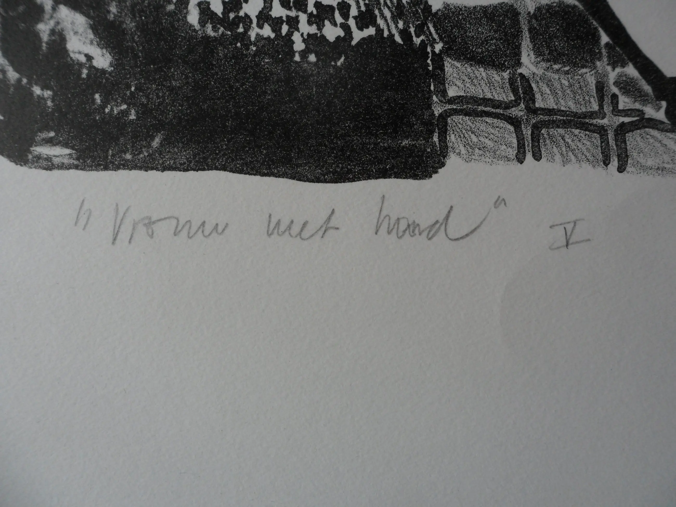 Litho van Henri de Haas. Titel: Vrouw met hond V. Nummer: EA. Jaar: 1968. Afmetingen blad: H57 x B76, cm. Het werk is rechtsonder, met potlood, gesigneerd door de kunstenaar.