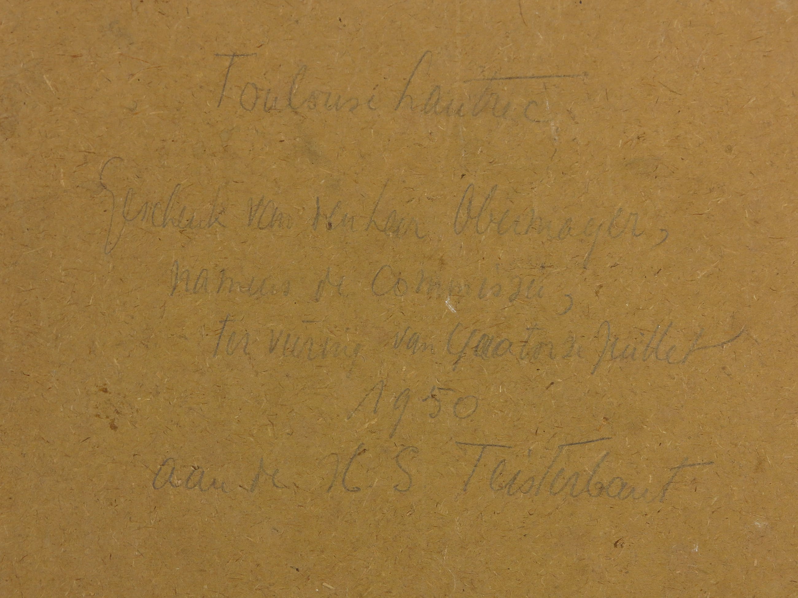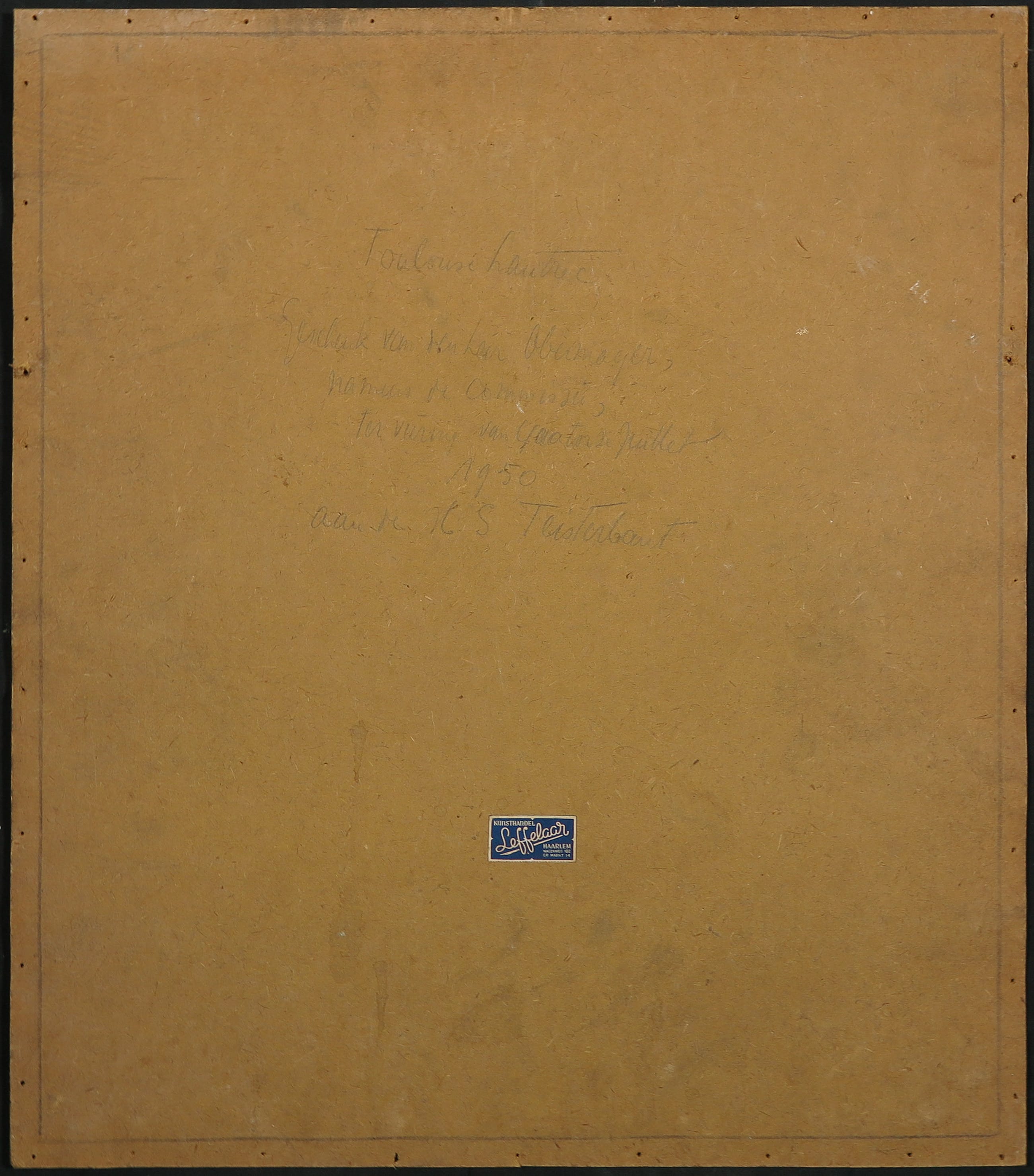 Het werk is in 1950 geschonken door H. Obermayer aan de Haarlemse kunstenaarsvereniging Teisterbant ter viering van Quatorze Juilliet (aantekening op de achterzijde van het achterblad, welke los wordt meegeleverd).