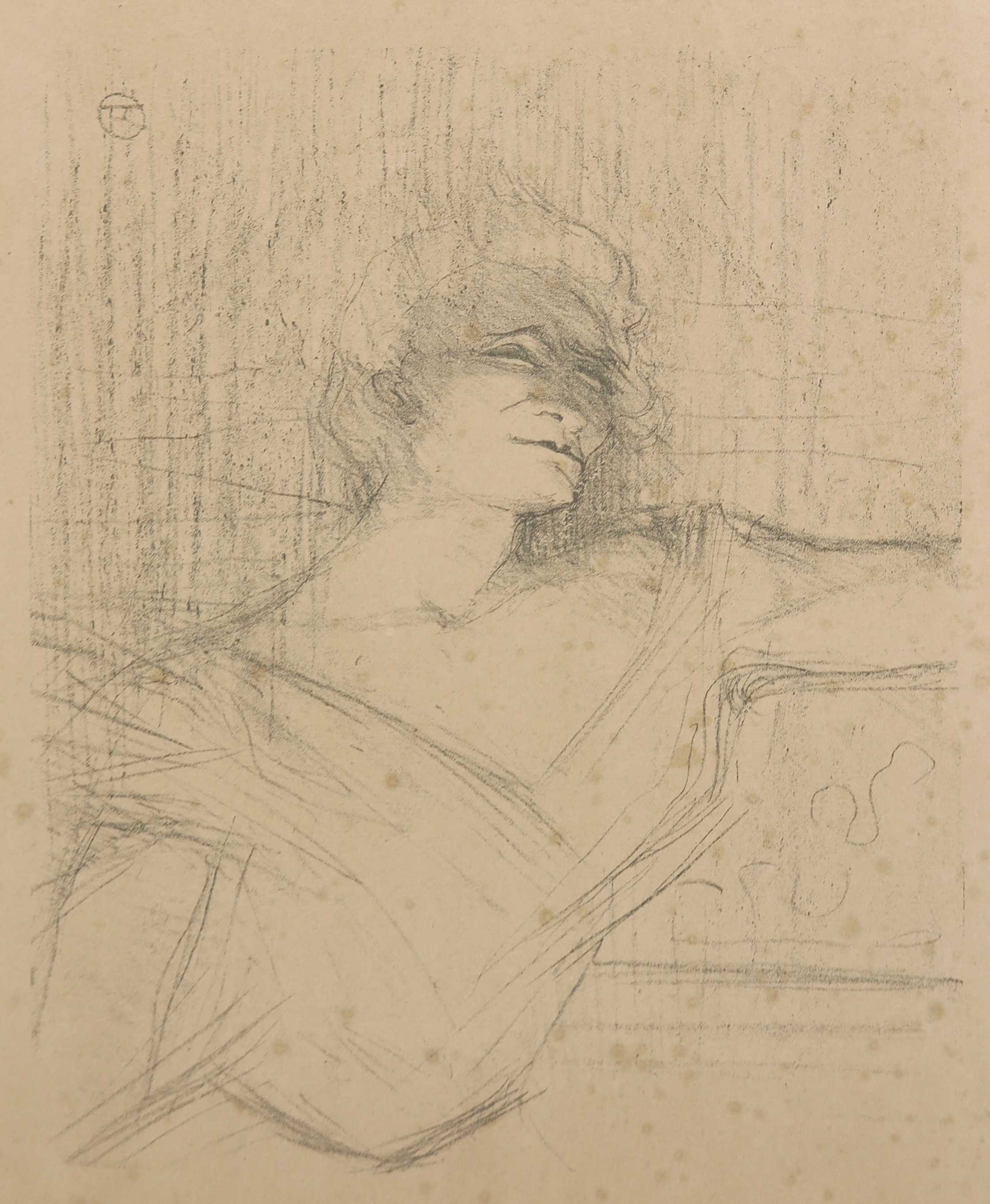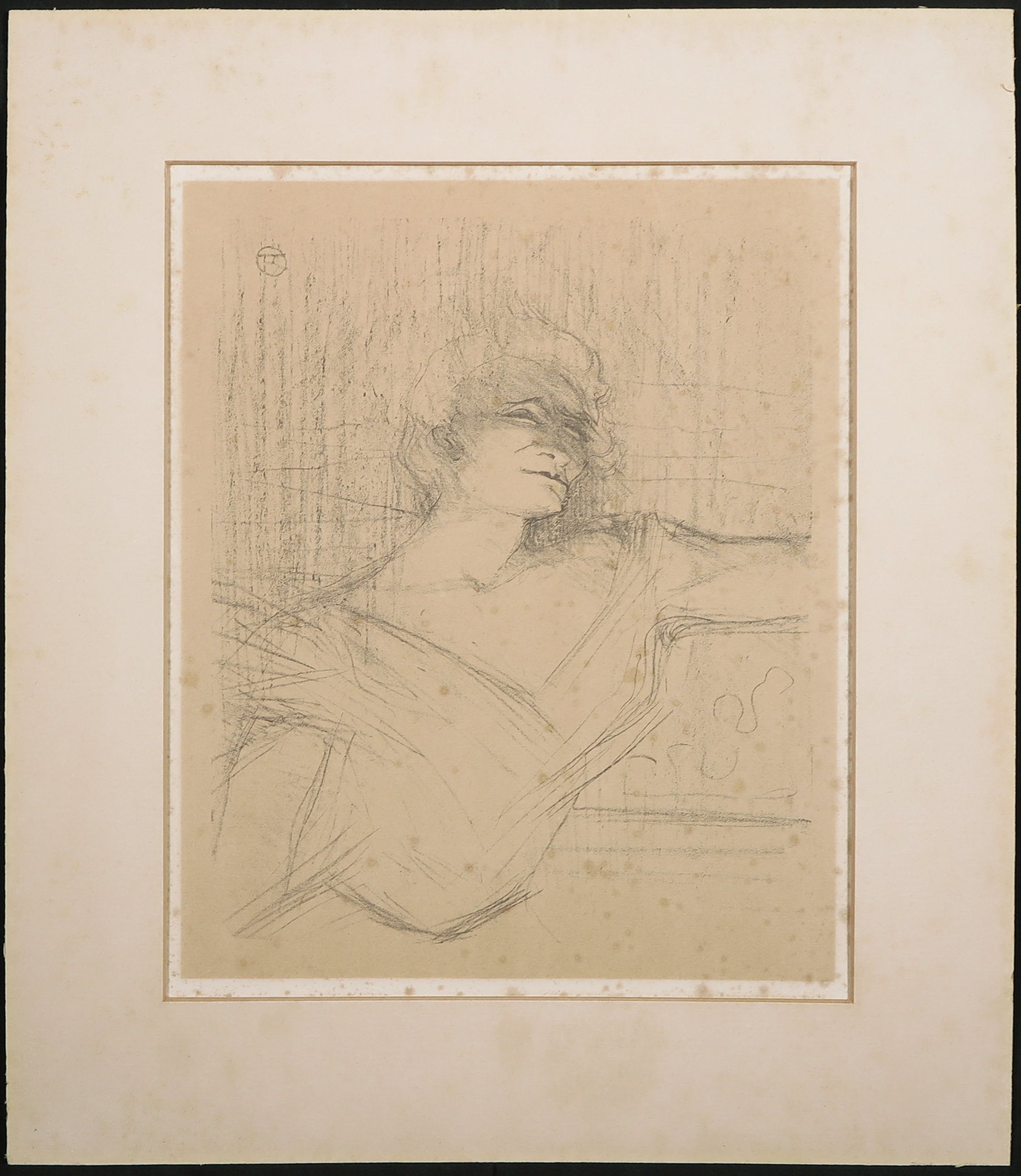Originele litho door Henri de Toulouse-Lautrec getiteld Yvette Guilbert dans la glu. Yvette Guilbert, zangeres en actrice in het Parijse cabarettheater, werd veelvuldig geportretteerd door Toulouse-Loutrec die vaak naar haar voorstellingen ging. Hier toont hij het moment waarop zij het nummer 'La Glu', zingt, een luguber lied over een man en zijn minnares.