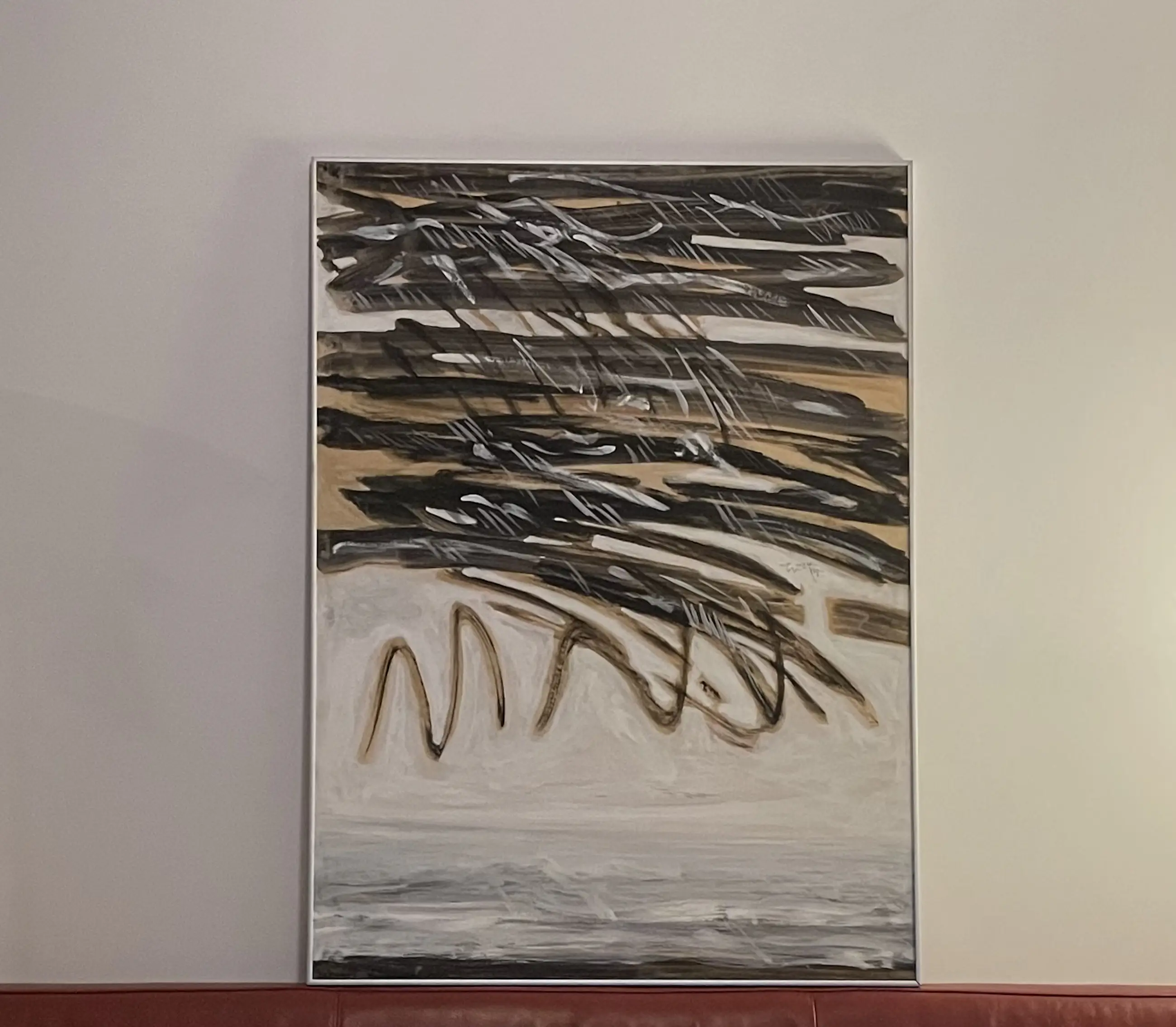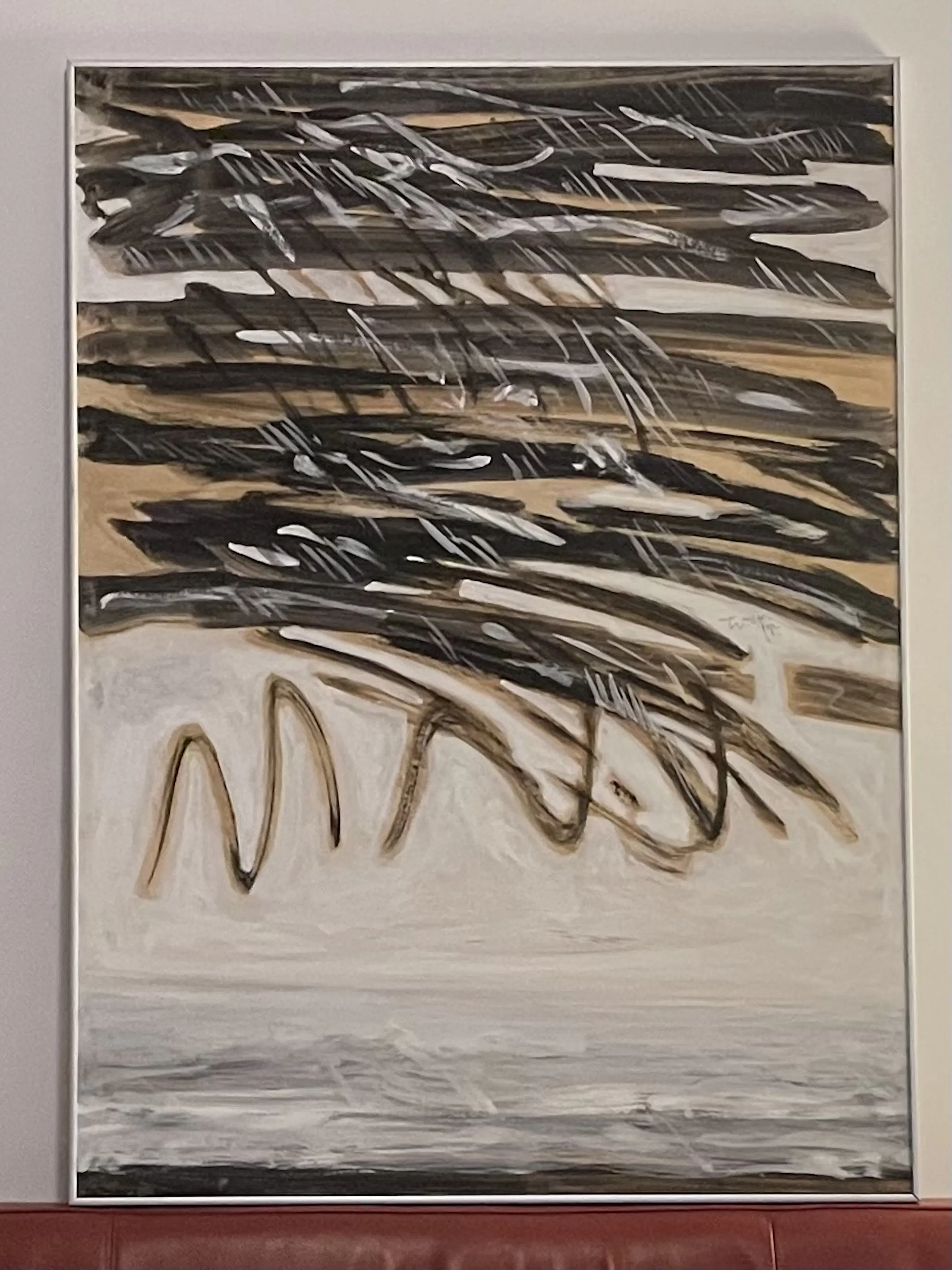 Een prachtig groot en uniek abstract werk van Henri de Wolf uit 1983 met als titel “Dennen II”. Het werk is in zeer goede staat en zit in een aluminium lijst.