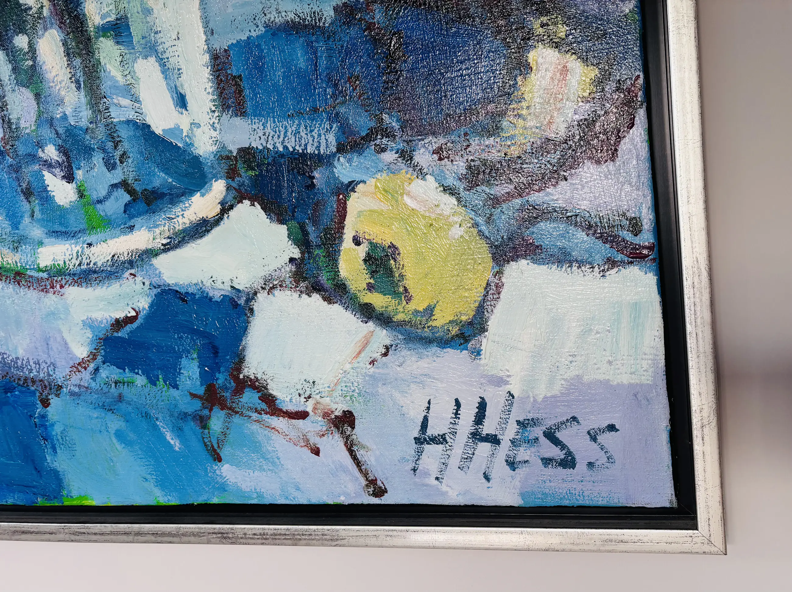 De compositie is los en dynamisch, waarbij kleur en textuur belangrijker zijn dan detail. Dit geeft het schilderij een levendige uitstraling en een sterke aanwezigheid aan de wand. Het werk is rechtsonder gesigneerd “H. Hess” en verkeert in goede staat.