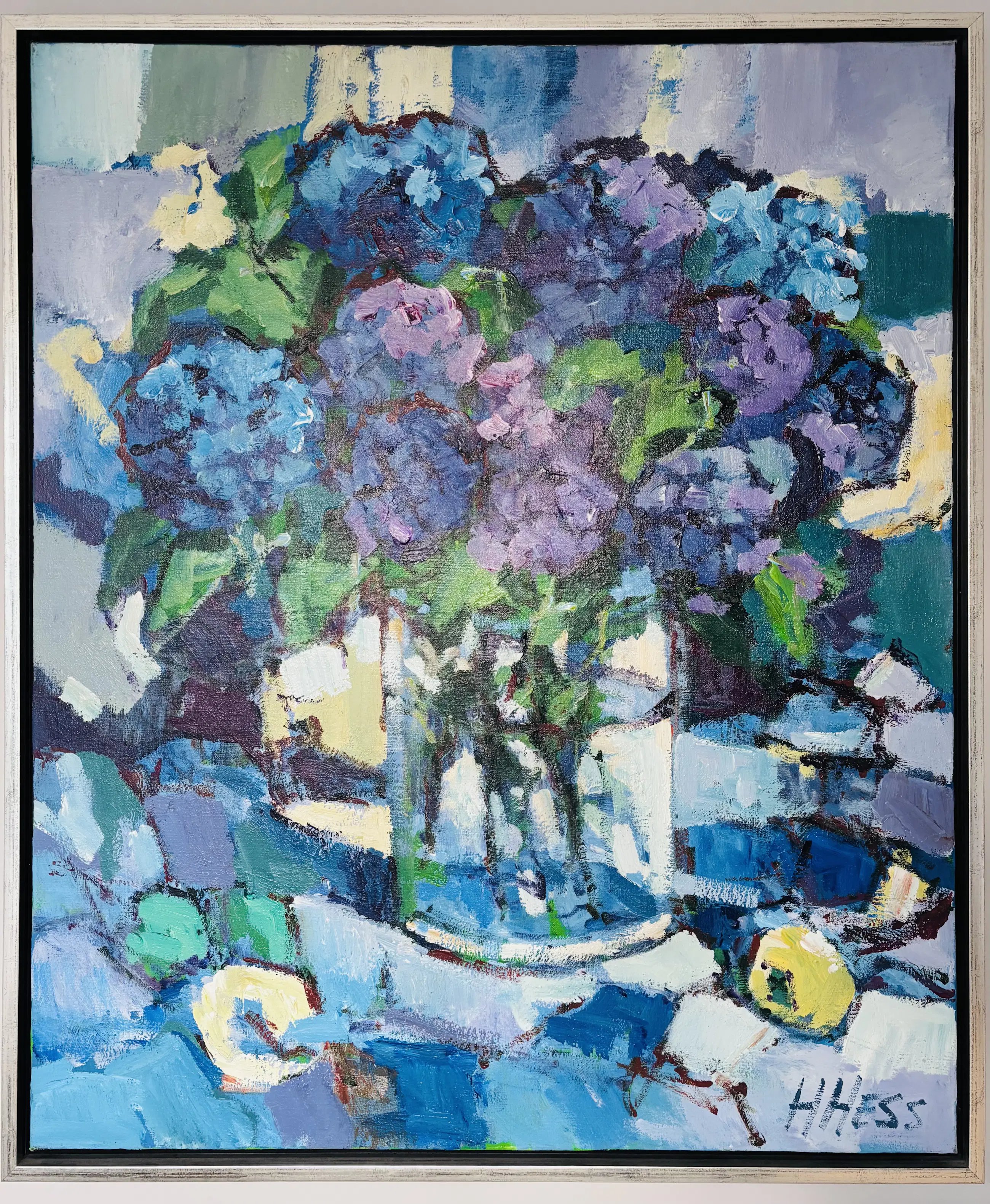 Groot, expressief bloemstilleven van Henri Hess, uitgevoerd in olieverf op doek. Het werk toont een vaas met hortensia’s, geschilderd in een half-abstracte, modern-figuratieve stijl. Kenmerkend zijn het krachtige kleurgebruik in blauwen, paarstinten en groenen, evenals de zichtbare penseelstreek en pasteuze verfopbouw.