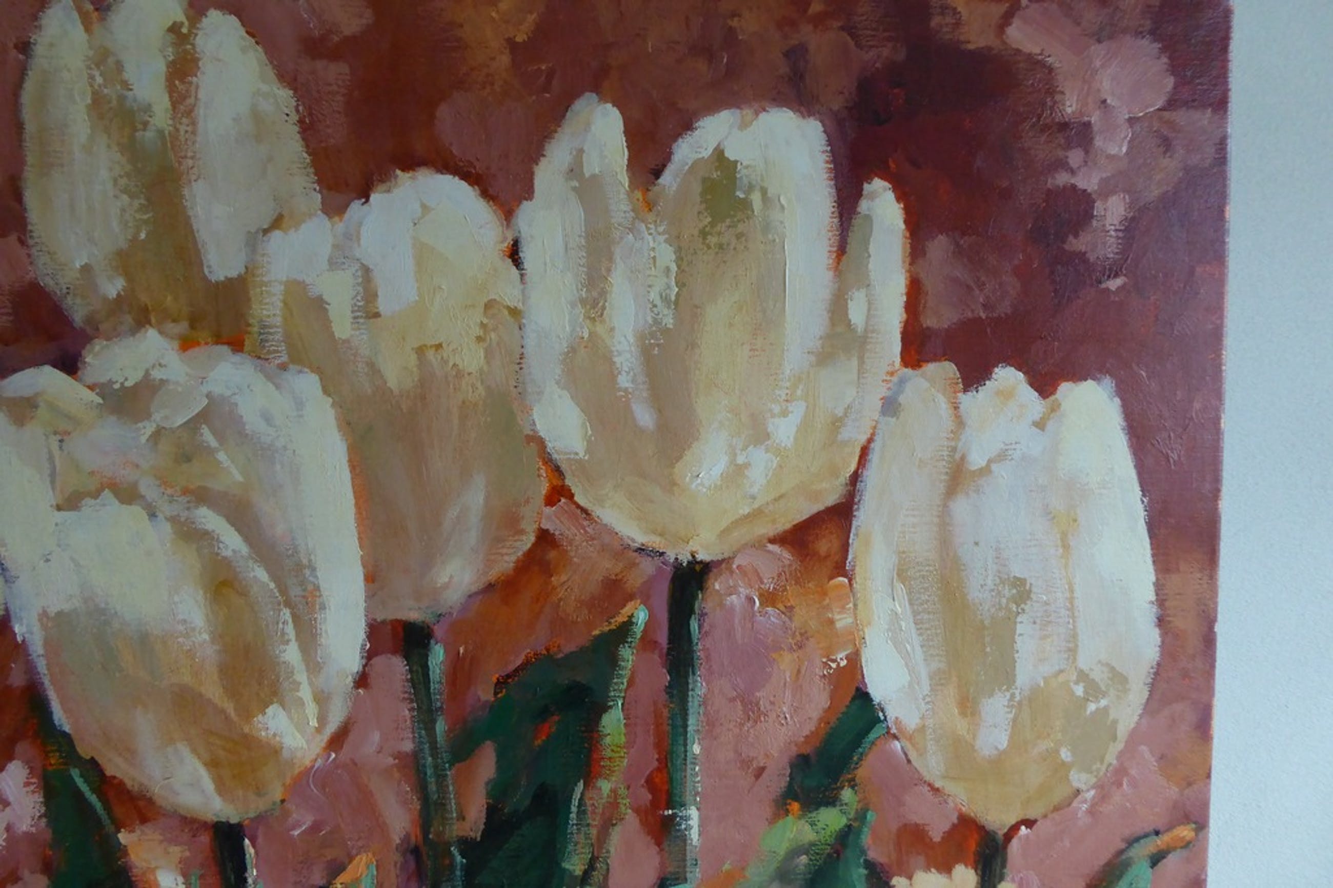 Schilderij 100*100 cm in de voor Henri Hess kenmerkende stijl. Mooie kleuren en de prachtige vorm van de tulp, zoals alleen hij die kan weergeven.