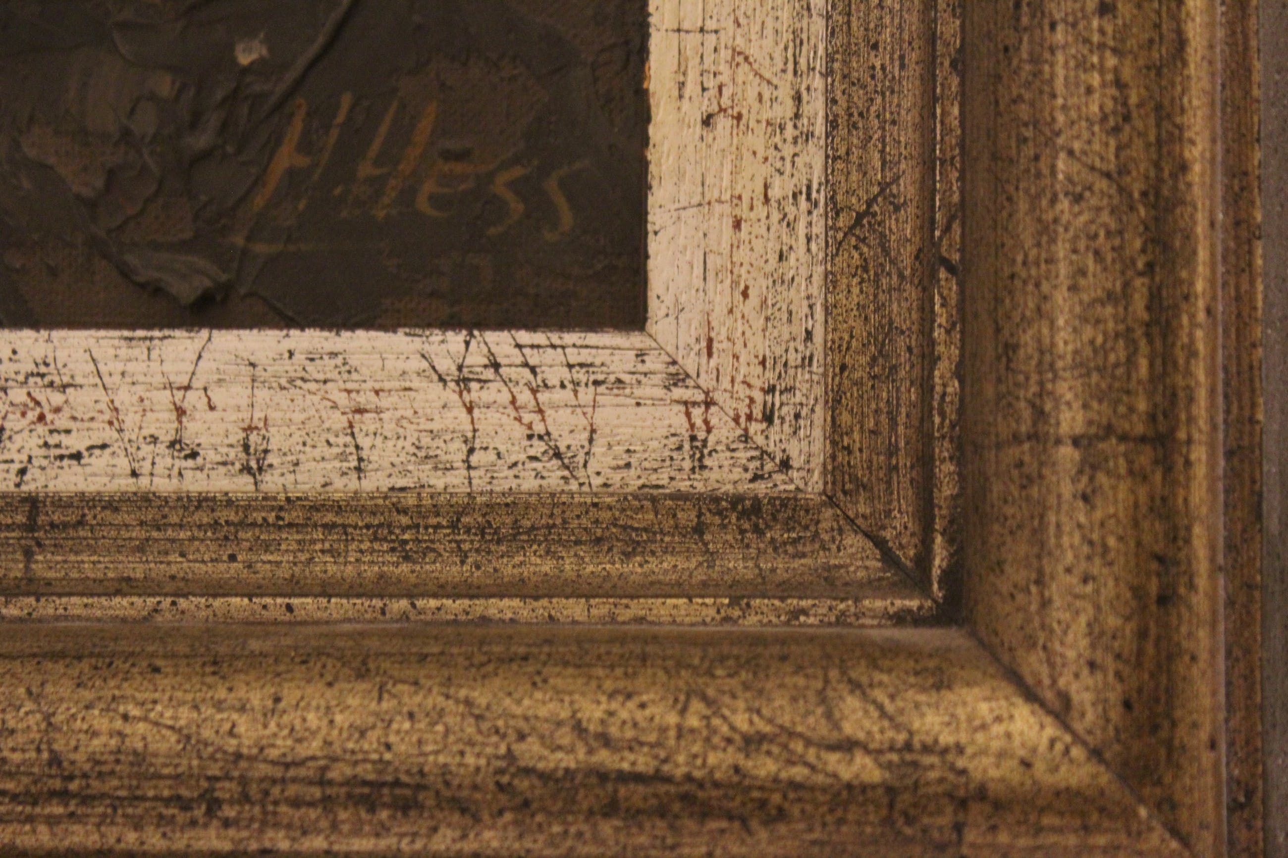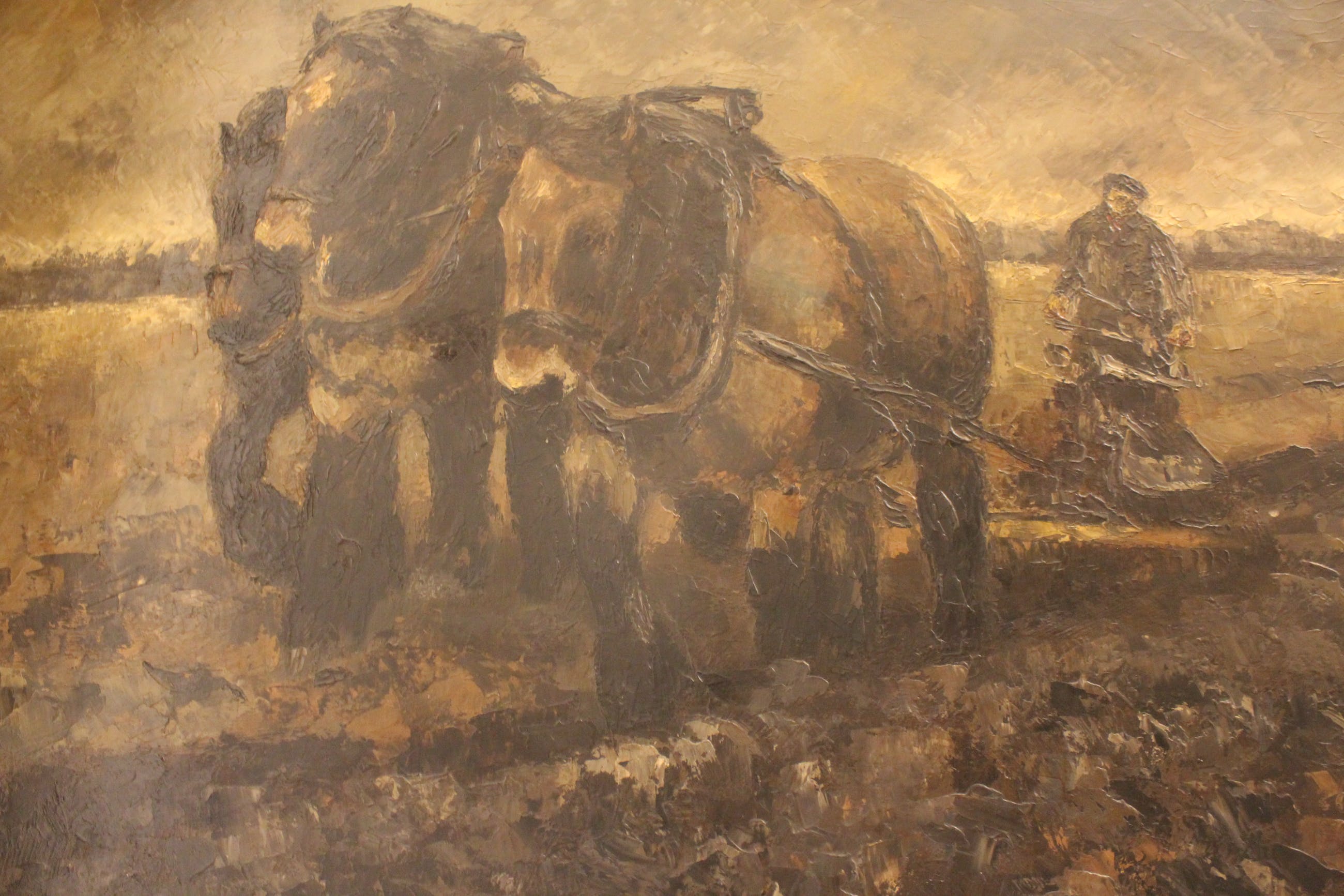 3 Zeeuwse paarden aan het ploegen in de kleigrond. Werk is opgezet met het paletmes, deels in reliëf. Prachtige bruine en grijze tinten. Is een van de vroegere werken van H. Hess.