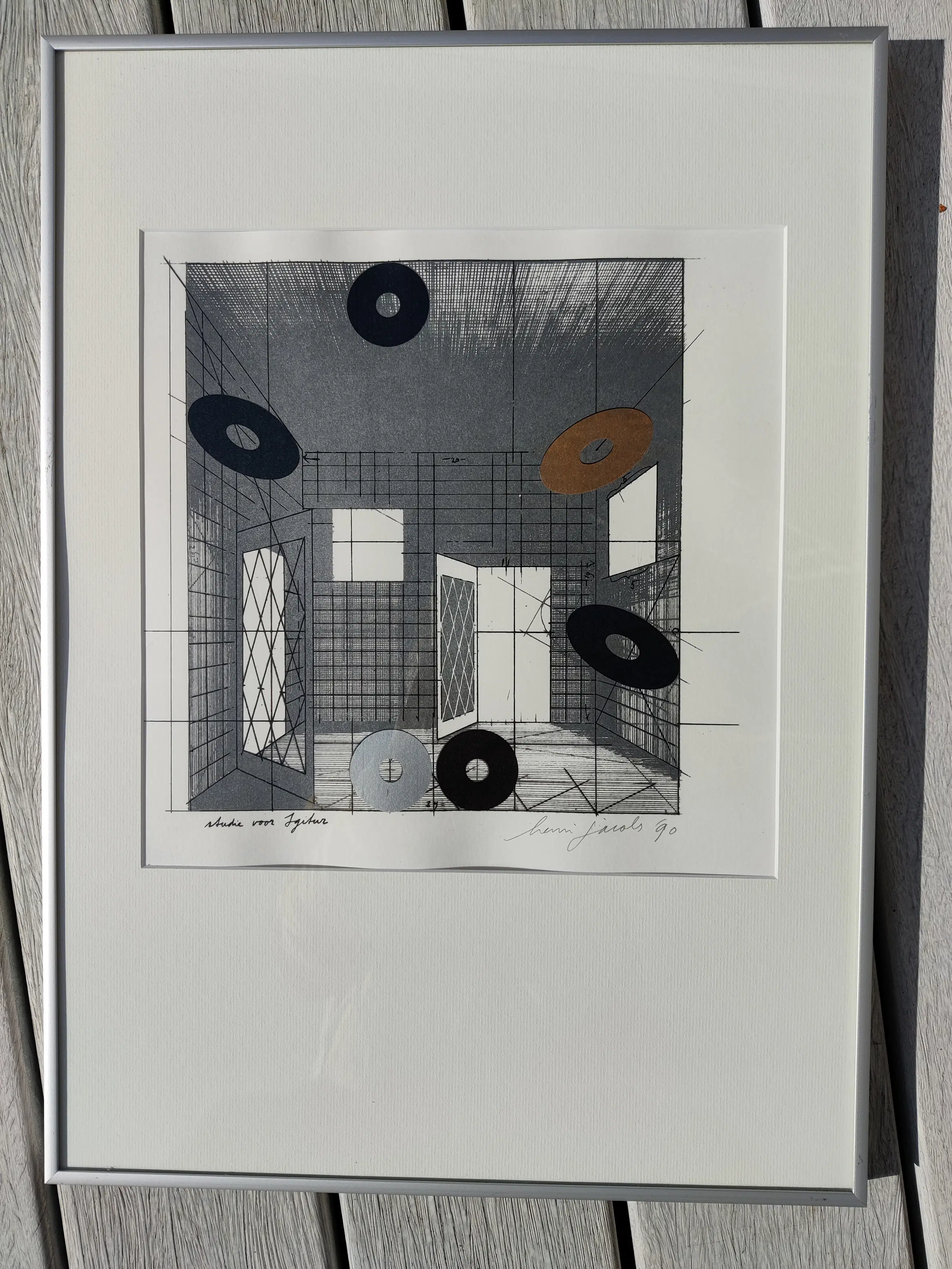 Werk verkocht tijdens Poetry International 1990 in Rotterdam. Luxe ingelijst met glasplaat. Op de achterkant gedicht door Roberto Juarroz. Handgesigneerd. Afmetingen: 31 x 30.5 cm (h x b) Inclusief lijst: 56.5 x 40.5 cm (h x b)