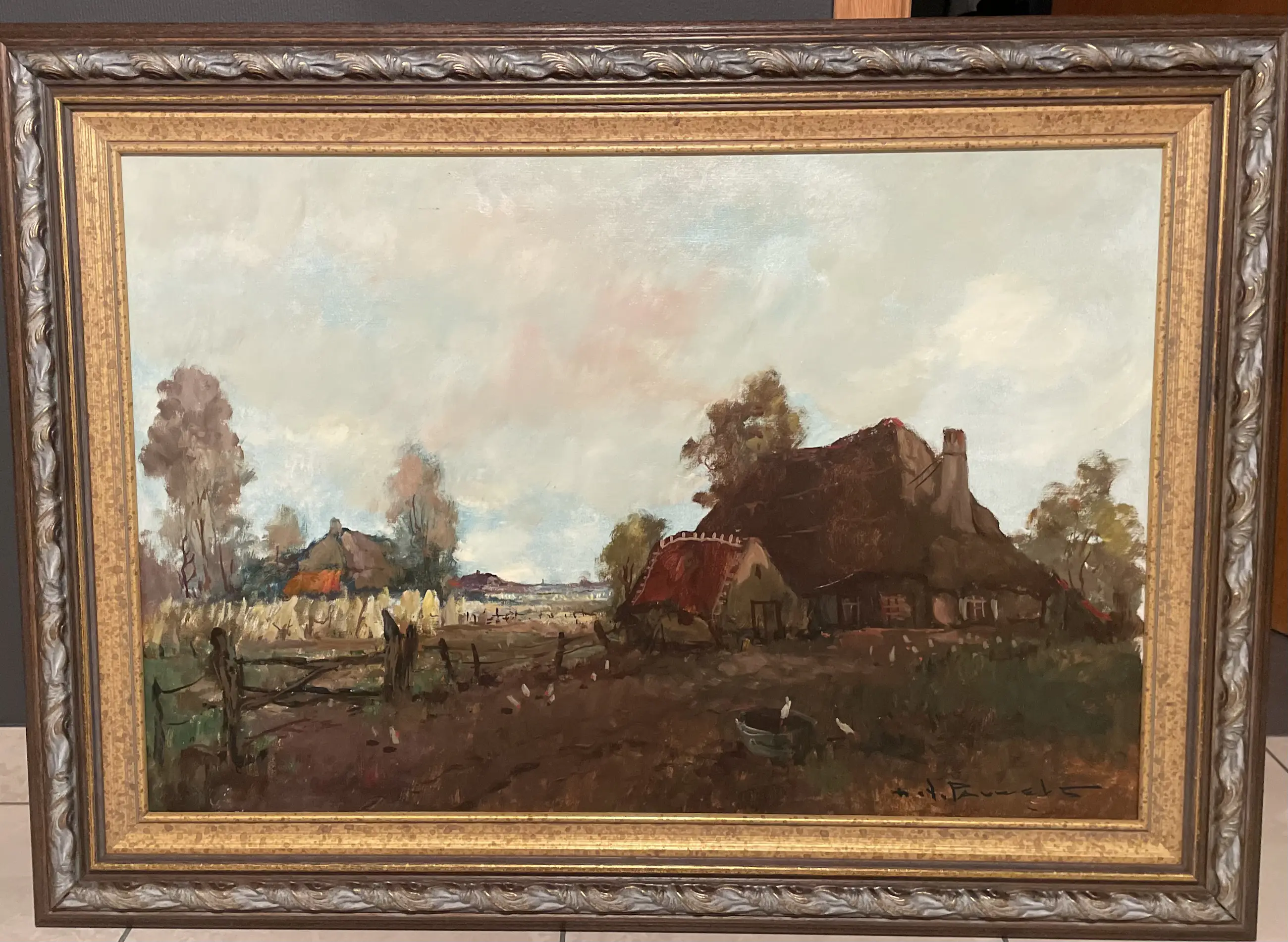 De schilder die het schilderij heeft gemaakt is Henri Joseph Pauwels (1903-1983). Stijl en onderwerpen: Hij stond bekend om zijn impressionistische stijl, die poëzie en optimisme uitstraalde. Zijn voorkeur ging uit naar landschappen, landelijke gezichten met hoevetjes (zoals in de afbeelding), bloemstukken, marines en Antwerpse havengezichten. Het schilderij toont een prachtige weergave van een hoeve in Kruibeke geschilderd in 1967.