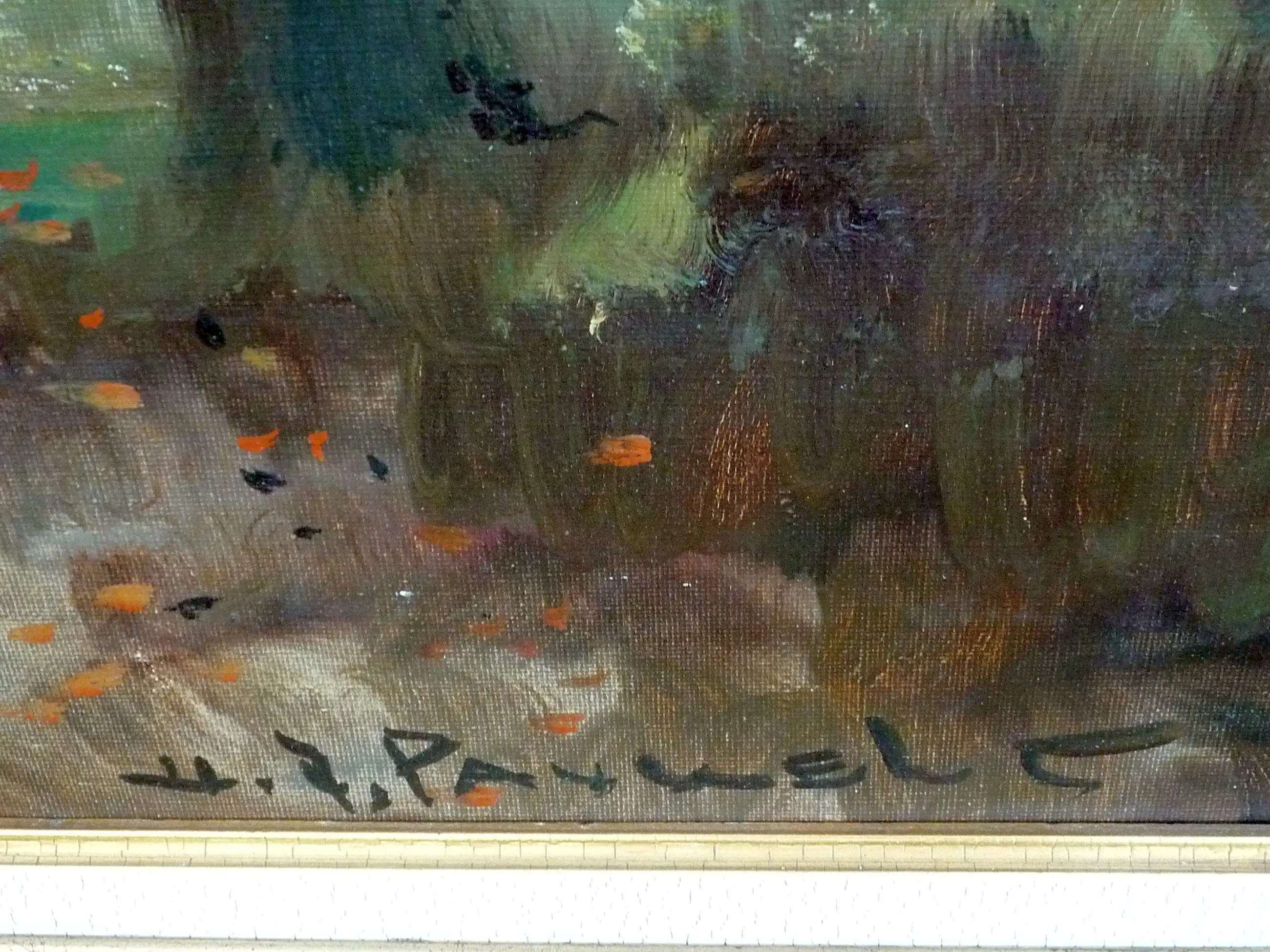 Een scheurtje in het doek linksonder. De lijst heeft een paar schades maar is toch in een goede staat. | |||||||||||