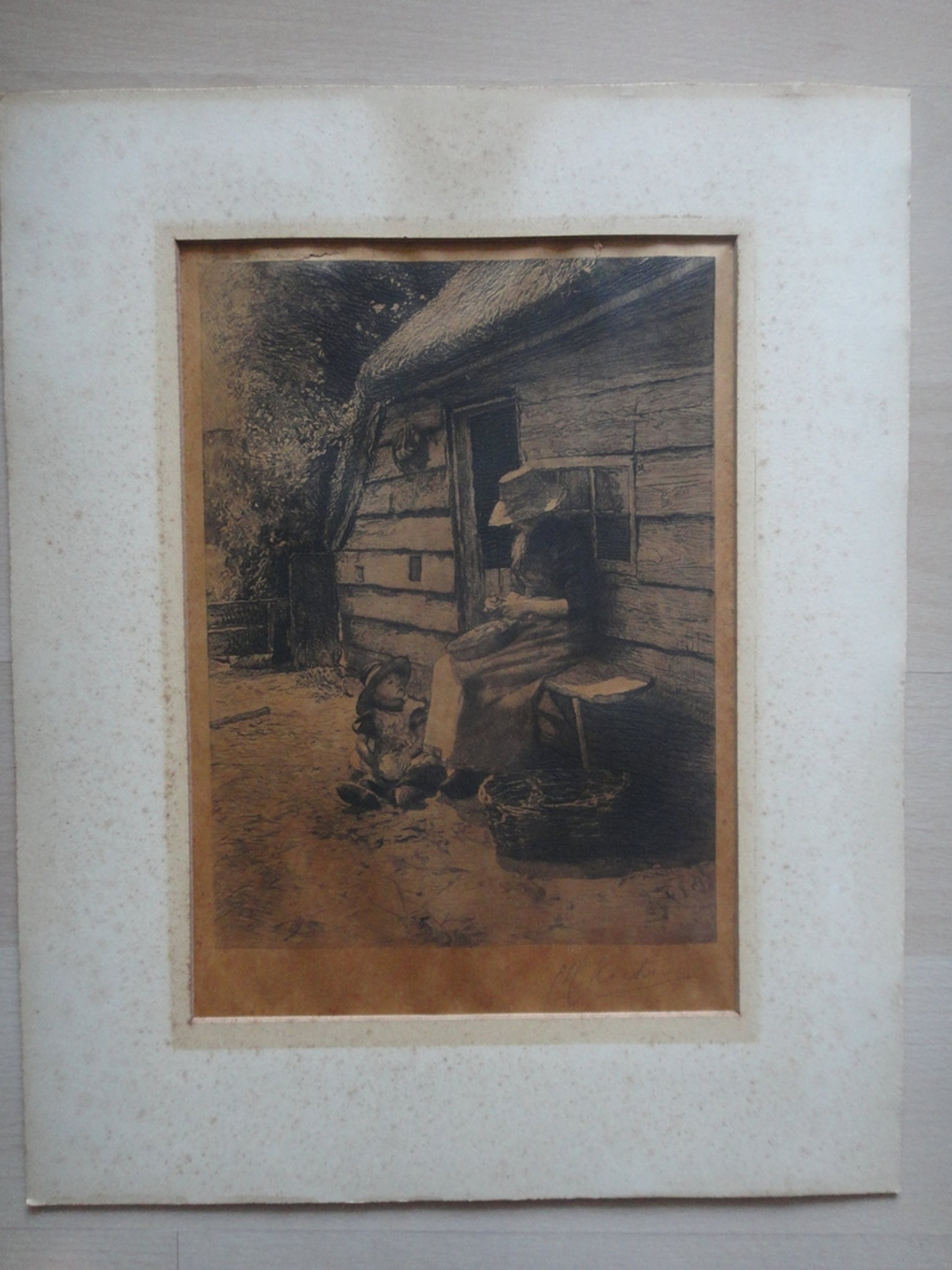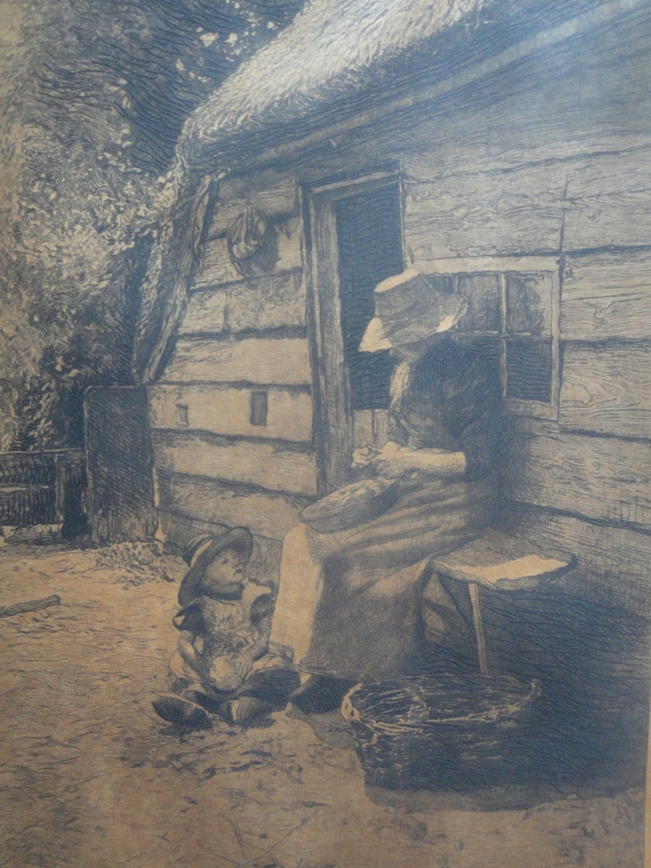 Oude ets met voorstelling van kind en moeder die het eten voorbereid.