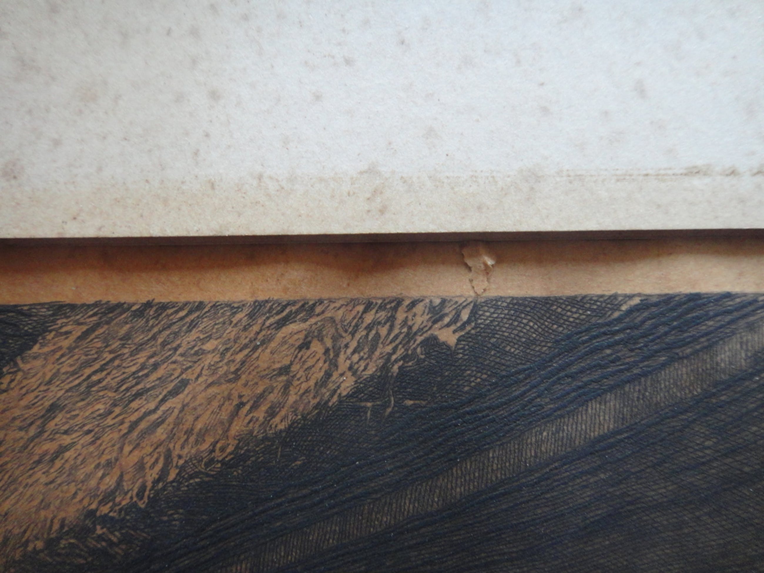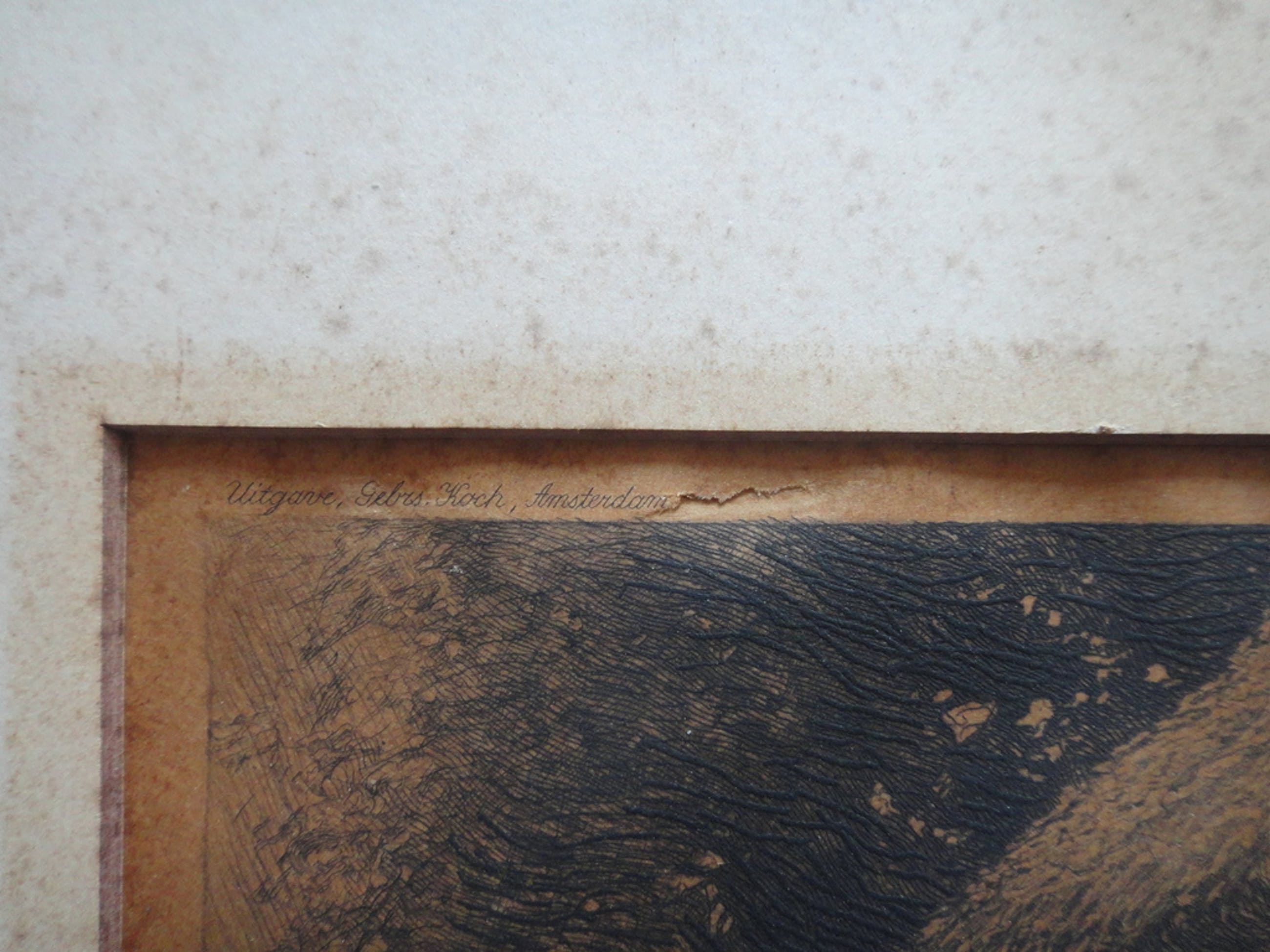 Het passe-partout dient vervangen te worden. De ets zelf is verkleurd en rechtsboven zit een scheurtje in het blad, dat de voorstelling zelf net niet raakt.