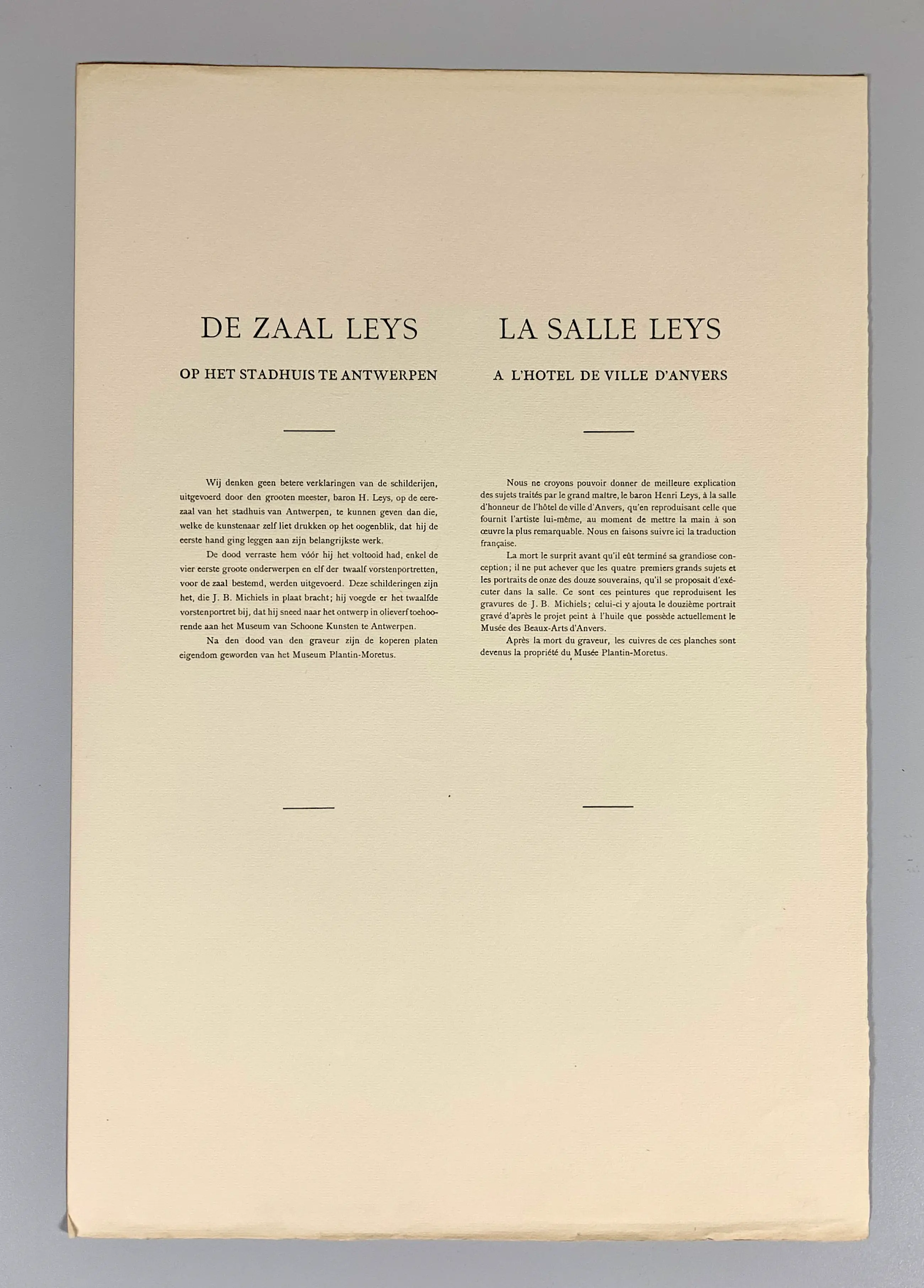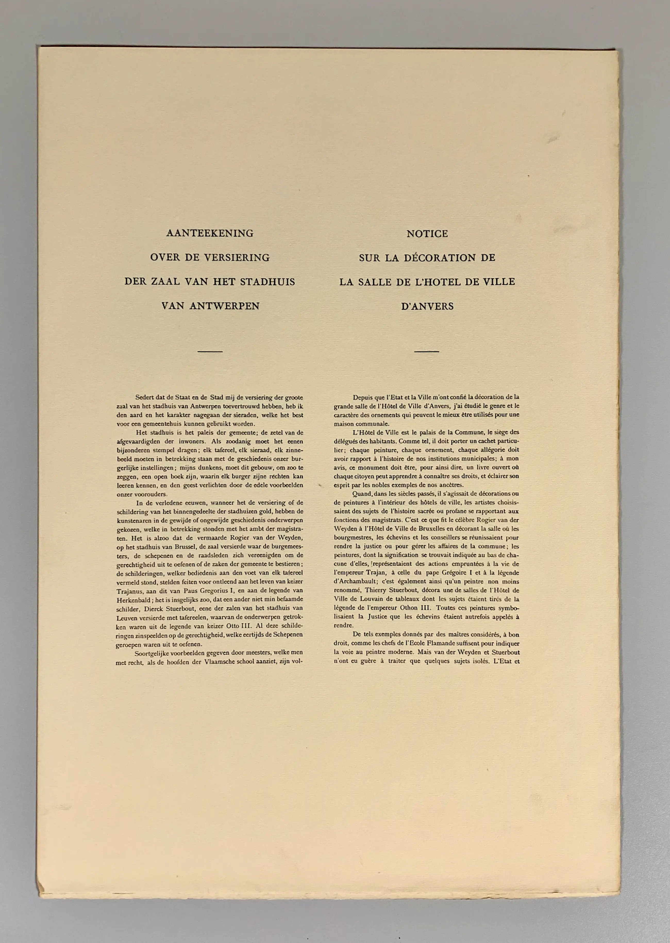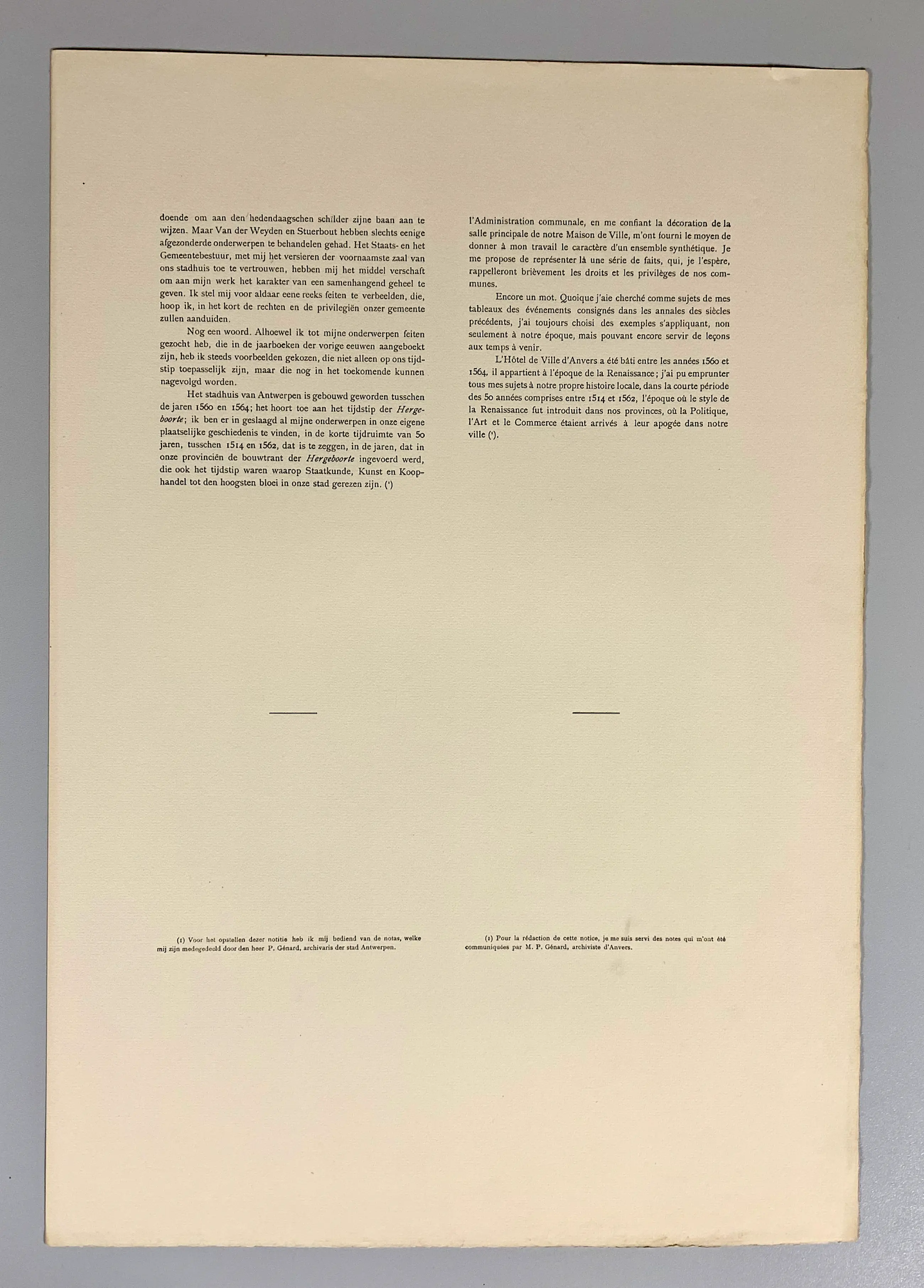 Map met tekst en uitleg over de realisatie van deze 7 kopersneden van Baron H. Leys die zijn vervaardigd op de muren in het stadhuis van Antwerpen rond 1862. Map is in goede staat bladen zijn door ouderdom verkleurd en hebben licht beschadigingen en/of vlekjes, zie foto's. Kopersneden zijn in goede staat. Papiersoort: Arches. Afmeting: kopersneden 42x 62 cm. Gewicht 4,5 kg. Wordt zorgvuldig verpakt en verzekerd verzonden.