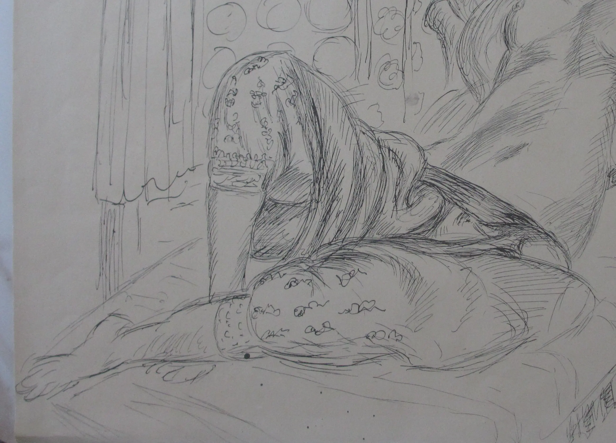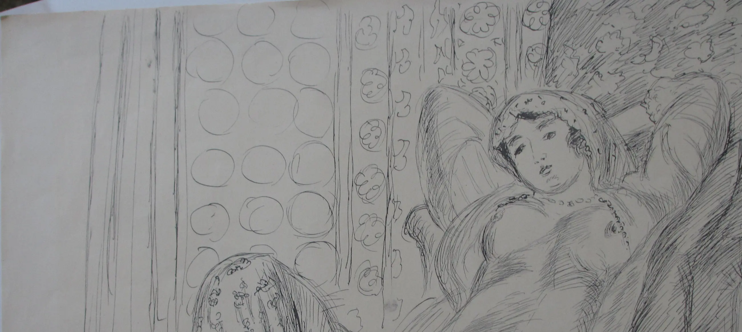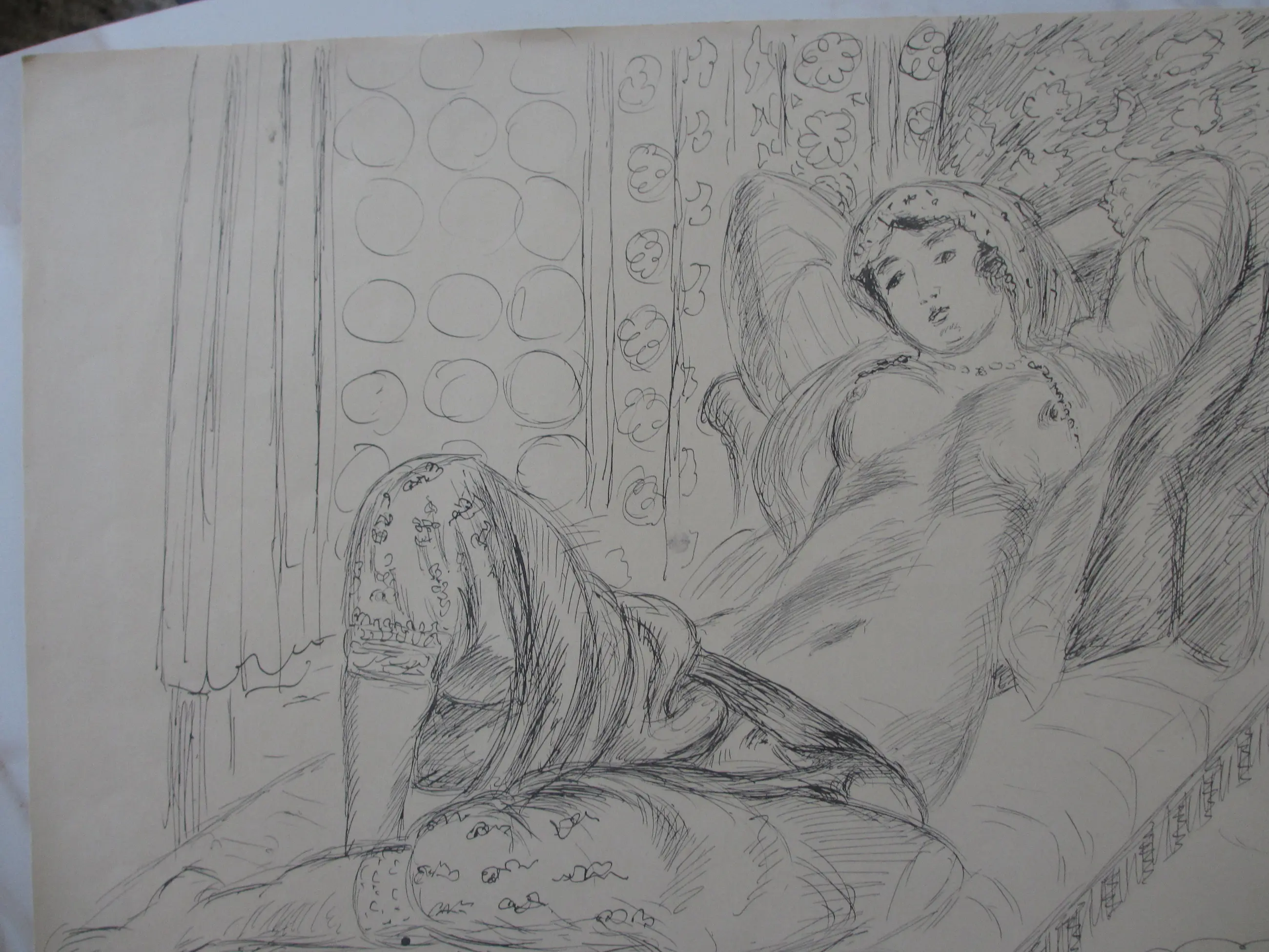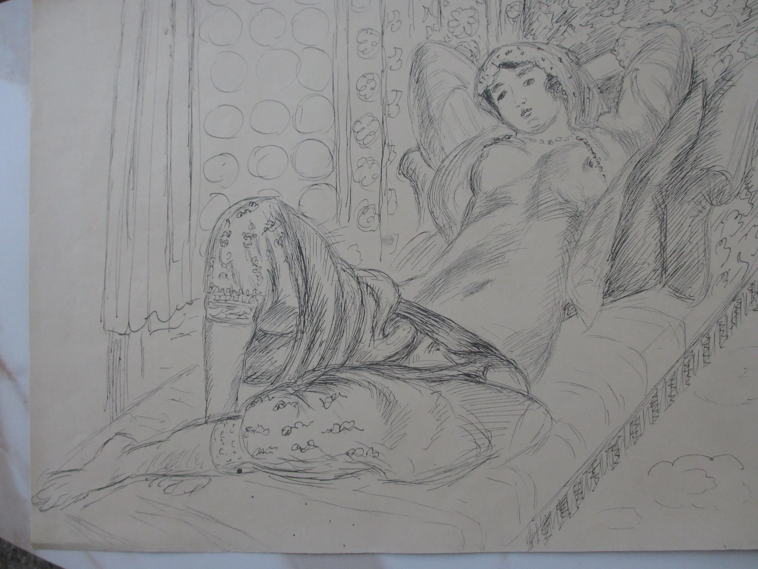 Deze lithographic print of prent naar Henri Matisse's werk, waarschijnlijk gebaseerd op zijn "Odalisque" serie. Papier is voorzien van een blindstempel. De afbeelding van dit stempel is Icarus uit de Griekse mythologie. Mogelijke uitgever R. Piper & Co. Verlag, München.