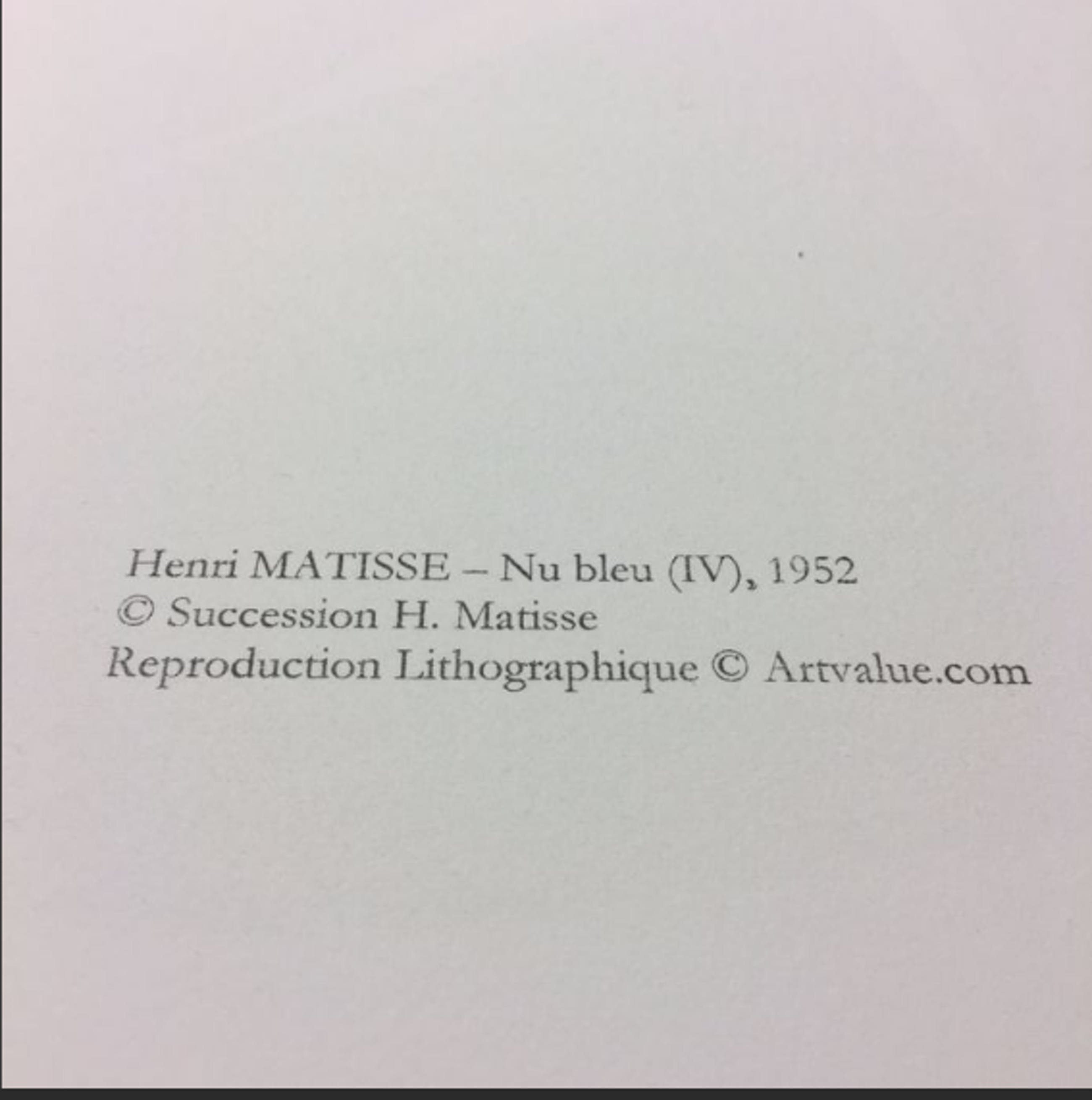 De lithografie werd geautoriseerd, gecontroleerd en gevalideerd door het Matisse Estate. Op de achterkant van de lithografie staat het copyright van het Matisse Estate.