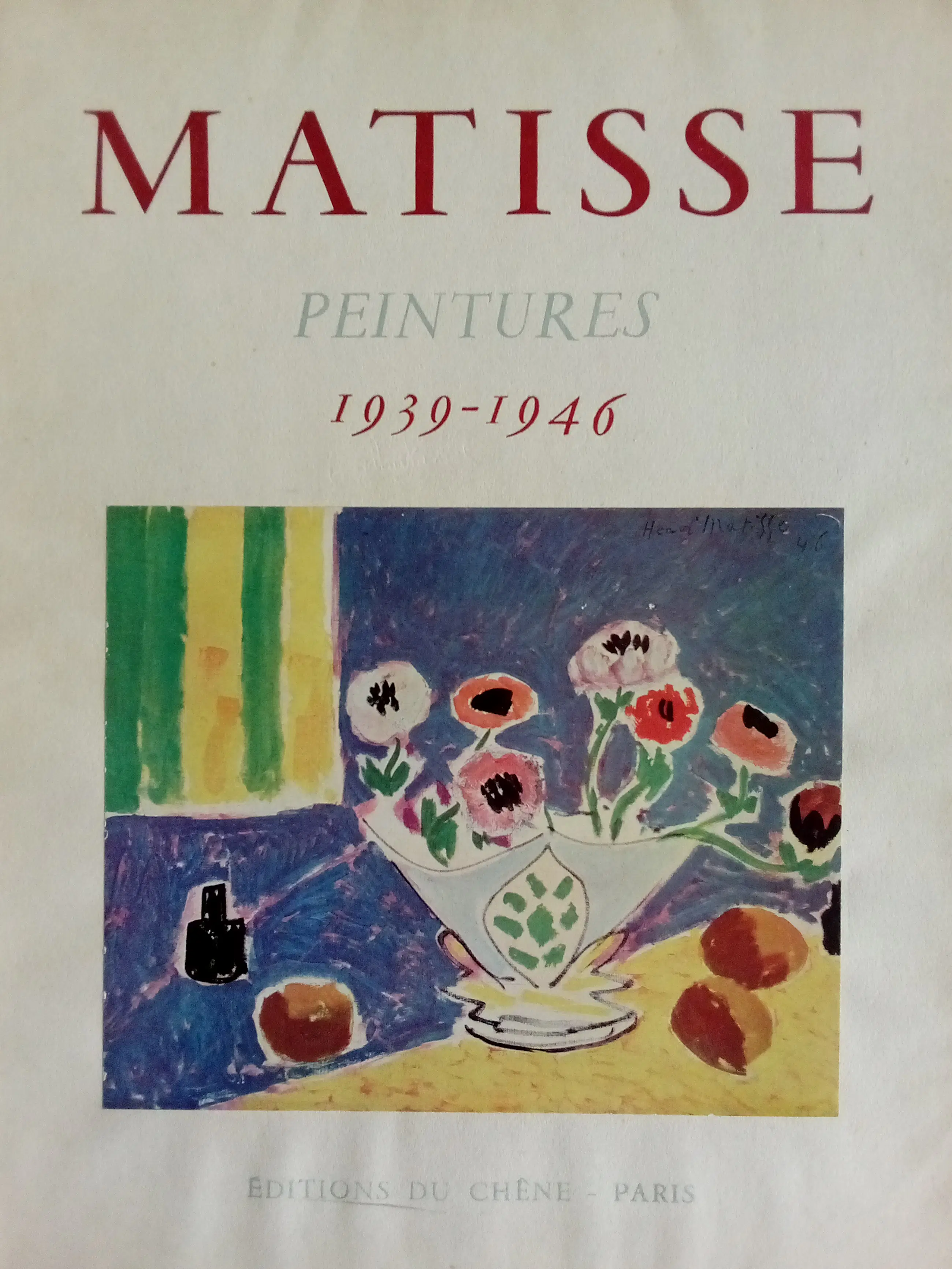 Collectie van werken van Matisse uit periode 1939-1946 Les Éditions du Chêne, gedrukt in Parijs in 1946. Een beschermhoes met daarop ook een gelijmde afbeelding bevat een begeleidend schrijven en 12 (van de oorspronkelijk 16) losbladige exemplaren van het werk van Matisse. Ze zijn offset gedrukt en aan één zijde ingeplakt op een kartonnen achtergrond (origineel). Op het karton staat onder de afbeelding de naam en het jaartal waarin het werk is gemaakt.
